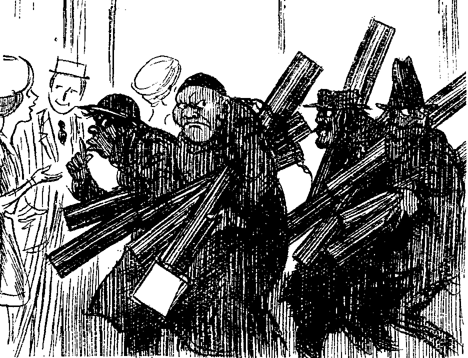 The first picture shows the arrival of the Editor, a man of desperate mien, dark as a thunder cloud, ready to be affrighted by nothing, with instant disapproval of whatever he disapproves breaking through his alert, intellectual features. To him, stern patriot as he is, it is nothing that men do well. He is there, vigilant and implacable, to pounce swiftly and mercilessly on derelictions of duty. No one knows so well as he what is possible to a Minister and his Department and what not. They themselves, the Minister and his Department, are totally uninstructed in the matter. Truly a remarkable man.