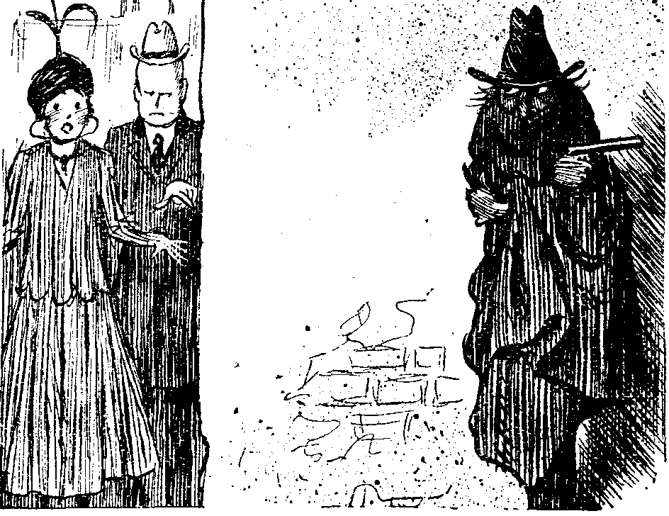 Next we are shown the Proprietor leaving his private house by aeroplane to visit the office. We see him first alighting on the roof and then entering his private room by a secret door, from a secret staircase. Having removed his slouch hat and cloak and laid aside his dark lantern, he is revealed as a man of destiny indeed.