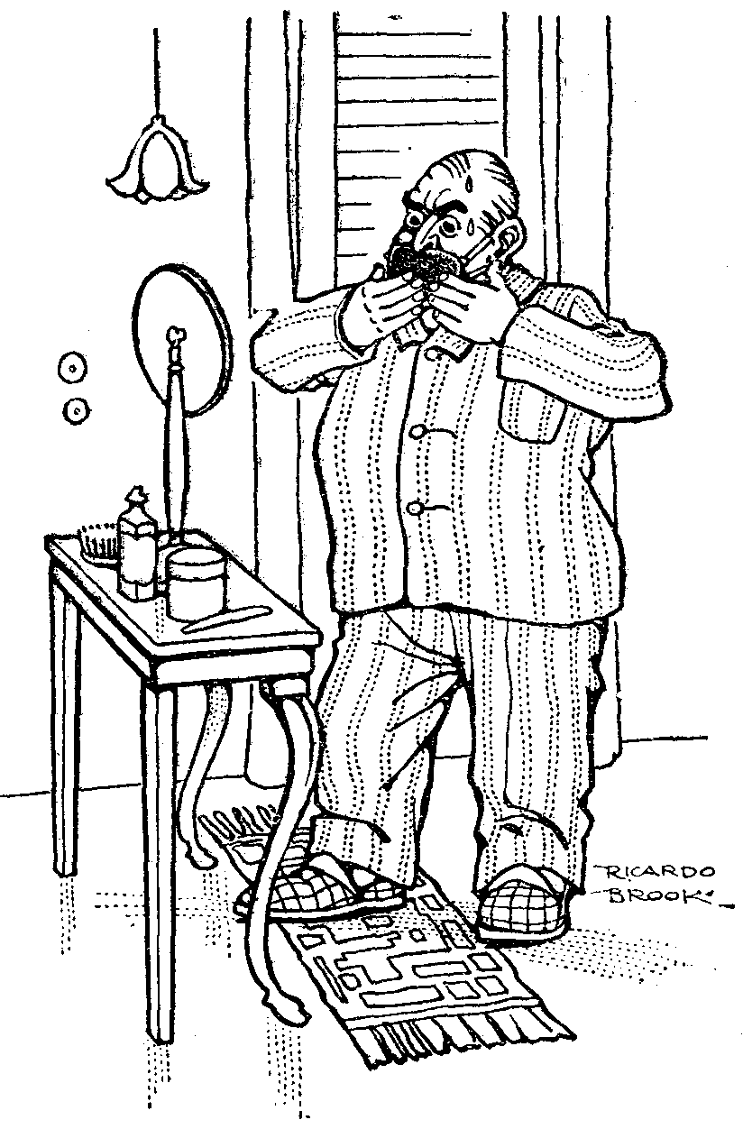 Conscientious married M.P. (WHO UNFORTUNATELY TALKS IN HIS SLEEP) GAGGING HIMSELF BEFORE RETIRING TO BED AFTER SECRET SESSION.