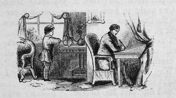 Rollo was at this time at Morley's Hotel, in London, and he expected to find his uncle George in what is called the coffee room. The coffee room in Morley's Hotel is a very pleasant place. It fronts on one side upon a very busy and brilliant street, and on another upon a large open square, adorned with monuments and fountains. On the side towards the square is a bay window, and near this bay window were two or three small tables, with gentlemen sitting at them, engaged in writing. There were other tables along the sides of the room and at the other windows, where gentlemen were taking breakfast. Mr.[Pg 20] George was at one of the tables near the bay window, and was busy writing.