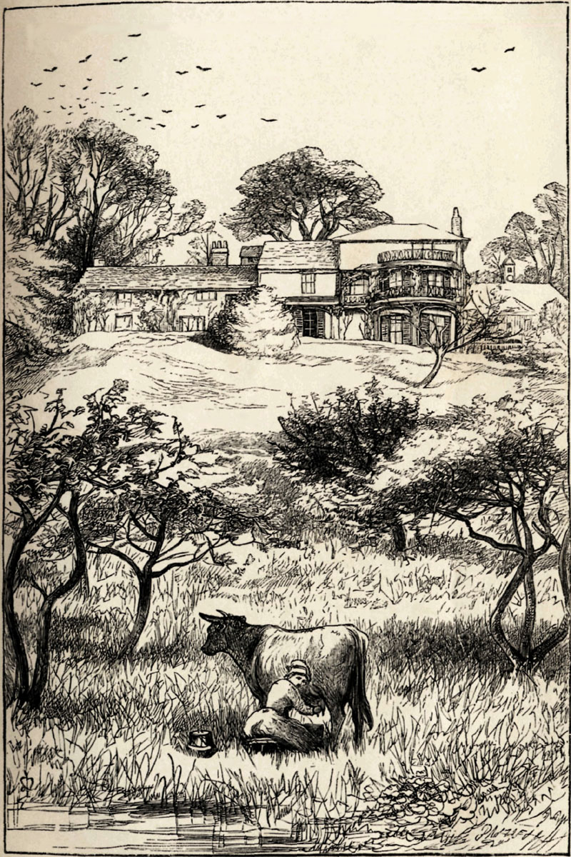 | Editorial note: | The illustrations by John Everett Millais in this HTML file are those used in the First Edition of Orley Farm (Chapman and Hall, London, 1862). The frontispiece below, titled "Orley Farm," depicts the farmhouse at Harrow in which Trollope lived as a boy, "Just as it was when we lived there," he states in his autobiography. |