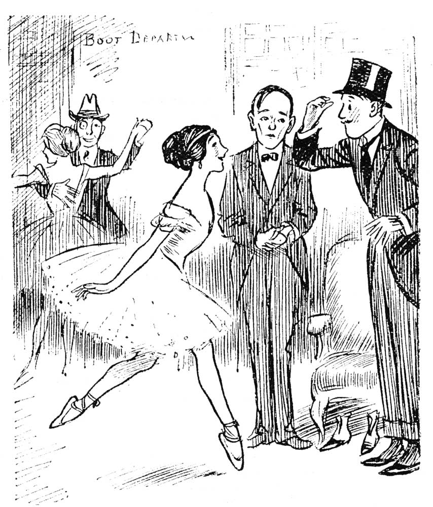What worried me most was that Mr. Hoffe should have so poor an idea of my intelligence as to suppose it possible to impart an atmosphere of probability to a scheme that was pure farce. Yet that was what he tried to do; he wanted me to believe that I was assisting at a comedy. There was no knockabout business; nobody entered the room with a somersault, tripped over a pin or hung his hat on the scenery. They all behaved as if they were presenting us with what is known as a human document, to be regarded au grand (or, at worst, au petit) sérieux. The fun—and there were some very pleasant touches—was not so much the fun of a huge and preposterous joke, but rather the humour of character or incidental detail. The part of Lord Glandeville, who might have been made the most ridiculous butt of imposture, was treated quite solemnly. Indeed, our sympathies were provoked for a man whose finest instincts had been trifled with; who had been suffered to fall in love with the poet-soul of a girl only to find that she was the tool of a gang of rogues. One of them, Dick Gilder, might tell him that he (Glandeville) was an egoist and that he ought to have fallen in love with the girl's body, as he (Gilder) had done, instead of her supposed soul; but that did not help matters much, or prevent our feeling that this treatment of Glandeville was no matter for laughter. And when I go and see a production of Mr. Hawtrey's I want matter for laughter and nothing else.
