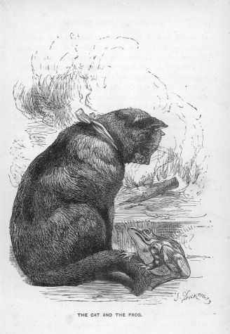 I have an instance of a still stranger friendship to mention. The servants of a country-house—and I am sure that they were kind people—had enticed a frog from its hole by giving it food. As winter drew on, Froggy every evening made its way to the kitchen hearth before a blazing fire, which it found much more comfortable than its own dark abode out in the yard. Another occupant of the hearth was a favourite old cat, which at first, I daresay, looked down on the odd little creature with some contempt, but was too well bred to disturb an invited guest. At length, however, the two came to a mutual understanding; the kind heart of Pussy warming towards poor chilly little Froggy, whom she now invited to come and nestle under her cozy fur. From that time forward, as soon as Froggy came out of its hole, it hopped fearlessly towards the old cat, who constituted herself its protector, and would allow no one to disturb it.