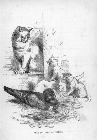 In another part of the loft a pigeon had built her nest; but her eggs and young having been frequently destroyed by rats, it seemed to occur to her that she should be in safer quarters near the cat. Pussy, pleased with the confidence placed in her, invited the pigeon to remain near her, and a strong friendship was established between the two. They fed out of the same dish; and when Pussy was absent, the pigeon, in return for the protection afforded her against the rats, constituted herself the defender of the kittens—and on any person approaching nearer than she liked, she would fly out and attack them with beak and wings, in the hope of driving them away from her young charges. Frequently, too, after this, when neither the kittens nor her own brood required her care, and the cat went out about the garden or fields, the pigeon might be seen fluttering close by her, for the sake of her society.