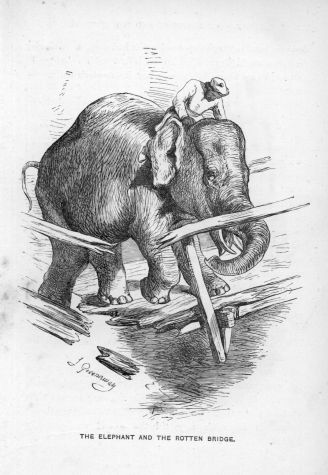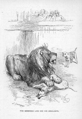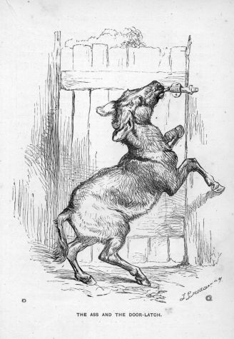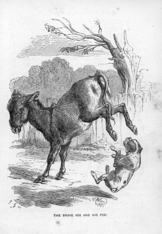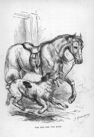 A large dog was kept chained in a stable-yard, in the roof of one of the out-buildings of which a raven had his abode. The dog and bird had become great friends. Yet the latter could not help amusing himself at the expense of his four-footed companion. Sometimes he would snatch a piece of food from the dog’s pan, often when he did not wish to eat it himself. As the dog submitted without complaint at first, the raven would come again and take another piece away, then bring it back just within reach, and dangle it over the dog’s nose. As soon as he opened his mouth to catch it, the raven would dart off again out of his reach.