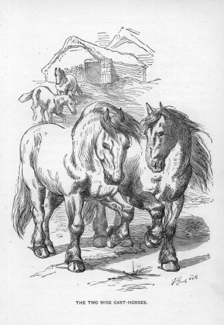 A goose was seated on her eggs in a quiet corner, not far from a horse-pond, in a farmyard. Up and down before her strode a game-cock, which, watching the calm looks and contented manner of the goose, which contrasted so greatly with his own fiery disposition, began to get angry,—just as human beings who are out of sorts sometimes do with