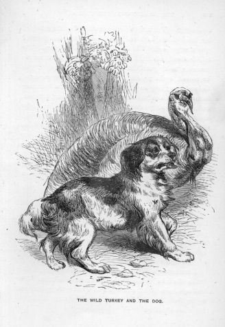 It happened one day, after it had been absent for some time, that as Audubon was walking through the forest at some distance from his home, he saw a turkey get up before him, but he did not recognise it as his own. Wishing to secure it for the table, he ordered his dog to make chase. Off went the spaniel at full speed; but the bird, instead of flying away, remained quietly on the ground till its pursuer came up. The dog was then about to seize it, when Audubon saw the former suddenly stop, and turn her head towards him. On hastening up, he discovered, greatly to his surprise, that the turkey was his own. Recognising the spaniel, it had not flown away from her, as it would have done from a strange dog.