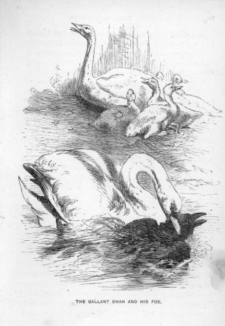 One morning, as a family of cygnets were assembled on the banks of one of the islands in the Zoological Gardens of London, and the parent birds were swimming about watching their little ones, a carrion-crow, thinking that the old birds were too far off to interfere with him, pounced down on one of the cygnets. The father swan, however, had his eye on the marauder, and, darting forward, seized him with his bill. The crow in vain struggled to get free. The swan, like the gander I before mentioned, dragged the felon towards the lake, and plunging him under water, held him there till his caws sounded no longer.