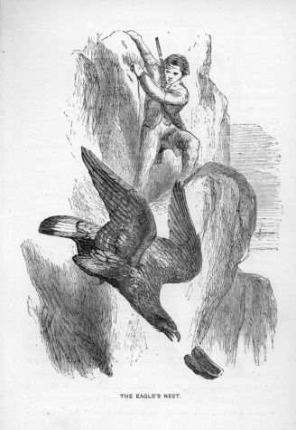 A countryman in the Highlands, to whose farmyard an eagle had paid several unwelcome visits, carrying off ducklings and chickens, determined to have his revenge. Sallying forth, gun in hand, he climbed up the rocky side of a neighbouring mountain, when he saw, high above him, the nest of the eagle. Shouting loudly, he discovered that neither of the parents were at home. Taking off his shoes, he was ascending towards the nest, when, about halfway up, while he was standing on a ledge, holding on tightly to a rock, he espied a hen eagle rapidly approaching, with a supply of food in her beak. Immediately, and with a terrible scream, she darted towards the intruder. Unable to defend himself, he expected to have his eyes torn out, when he let go, and slipped to a broader ledge. Again the eagle pounced upon him; and so close was she, that even then he could not get a shot at her. In desperation, he took off his bonnet and threw it at the bird. She, seeing it fall, immediately followed it to the foot of the rock. This gave him an opportunity of bringing his gun to bear on her. The shot took effect, and she fell dead far below him.