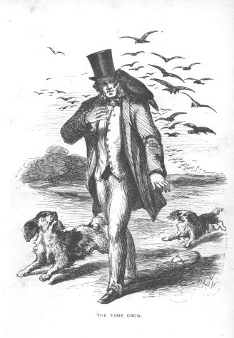 A gentleman had reared one from the nest, and it had long dwelt with him, coming at his call, and feeding from his hand. At length it disappeared, and he supposed it to have been killed. About a year afterwards, as he was out walking one day, he observed several crows flying overhead; when what was his surprise to see one of them leave the flock, fly towards him, and perch on his shoulder! He at once recognised his old friend, and spoke to it as he had been in the habit of doing. The crow cawed in return, but kept carefully beyond reach of his hand; showing that, having enjoyed a free existence, it did not intend to submit again to captivity. A few more caws were uttered. Its companions cawed likewise. The crow understood their call. Probably its mate, and perhaps its young ones, were among them. Glancing towards them, and with a farewell caw at its old master, it spread its wings and joined the flock; nor did it ever again return to its former abode.