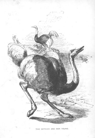 The ostrich, which, with its long strides and small wings, traverses the sandy deserts of Africa at a rapid rate, lifting its head on the look-out for danger, is generally spoken of as a stupid bird. Notwithstanding this character, it displays great affection for its young, and some sense in other matters. Sometimes a pair may be seen with a troop of twelve or more young ones, watching all their movements, and ready to call them away should a foe appear. Sometimes the young are not much larger than Guinea-fowls; and as their parents are aware that the little birds cannot run so fast as they themselves can, they endeavour, when an enemy comes near, to draw him away from their charges. The female generally undertakes this office, while the cock bird leads the brood in an opposite direction. Now the hen ostrich flies off before the horseman, spreading out or drooping her wings. Now she will throw herself on the ground before the foe, as if wounded, again to rise when he gets too near; and then, wheeling about, she tries to induce him to follow her. Thus she will proceed, trying similar devices, till she fancies that she has led her pursuer to a safe distance from the brood, when, abandoning her former tactics, she will dash off across the plain, fleet as the wind.