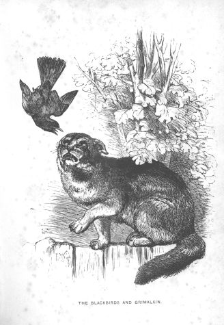 Two blackbirds had built their nest in the thick bough of a tree which overhung a high paling. Here they fancied themselves secure from the prying eyes of idle boys or marauding cats. The hen laid her eggs in her new abode, and in due time several fledgelings were hatched, which her faithful mate assisted her to rear. While in the full enjoyment of their happiness, watching over their helpless young ones, they one day saw what to them appeared a terrific monster—a large cat—leap to the top of the paling, and begin cautiously creeping along it. So narrow was it, however, that even Grimalkin could not venture to move fast.