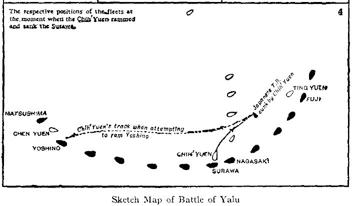 The carpenter returned after about five minutes’ absence, and reported that already there was more than ten feet of water in the fore end of the ship, while in the engine-room it was almost up to the bedplates, and that consequently the stokers were drawing the furnaces as quickly as they could in order to avert an explosion. He also added that, during the brief period while he had been sounding the well, the water had risen almost a foot, and that therefore the vessel could not be expected to float much longer. Indeed it was now evident that, although the bows of the Chih’ Yuen were supported on a ridge or pinnacle of rock, the after portion of the ship was in deep water, in which it was quickly sinking lower and lower, so that it was almost a question of minutes before she must either break in two or else slide backward off the rock and founder.