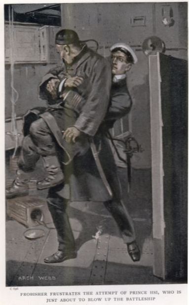 After this generous and unparalleled gift, will it surprise readers very much to learn that the lieutenant who was once cashiered from the Navy for losing his ship is now Captain Sir Murray Frobisher, Baronet, holding the rank of post-captain on board one of the battleships which he himself presented to his country?