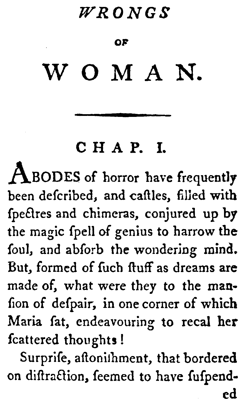 Abodes of horror have frequently been described, and castles, filled with spectres and chimeras, conjured up by the magic spell of genius to harrow the soul, and absorb the wondering mind. But, formed of such stuff as dreams are made of, what were they to the mansion of despair, in one corner of which Maria sat, endeavouring to recal her scattered thoughts!
