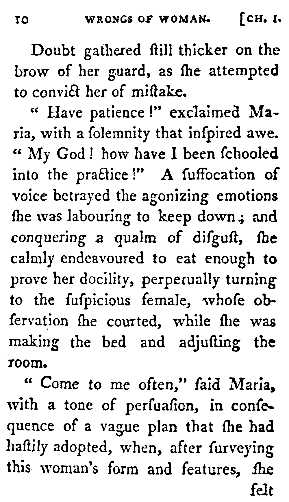 "Have patience!" exclaimed Maria, with a solemnity that inspired awe. "My God! how have I been schooled into the practice!" A suffocation of voice betrayed the agonizing emotions she was labouring to keep down; and conquering a qualm of disgust, she calmly endeavoured to eat enough to prove her docility, perpetually turning to the suspicious female, whose observation she courted, while she was making the bed and adjusting the room.