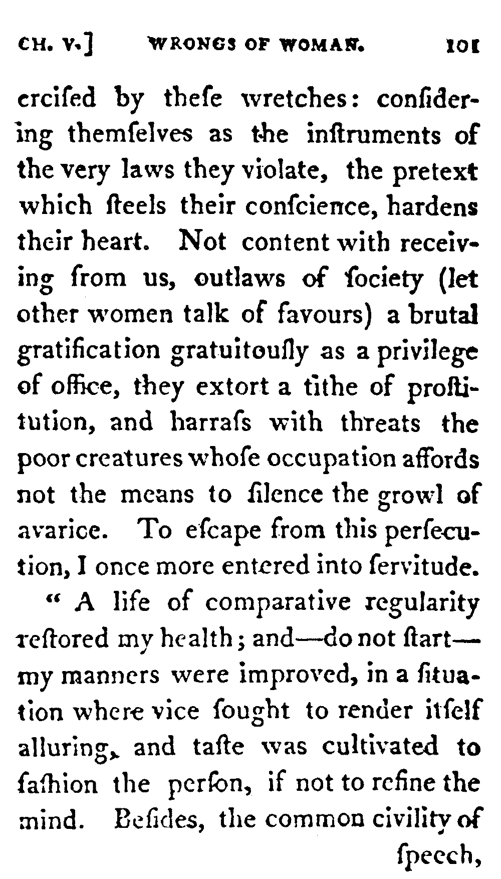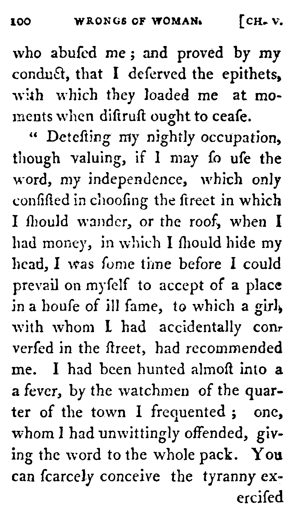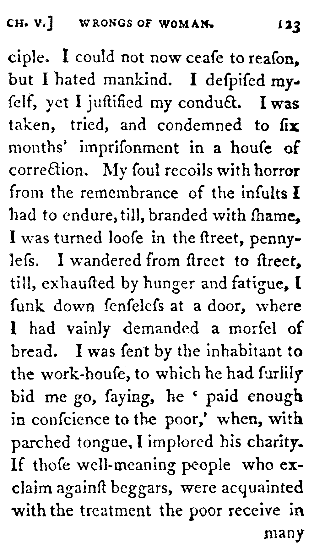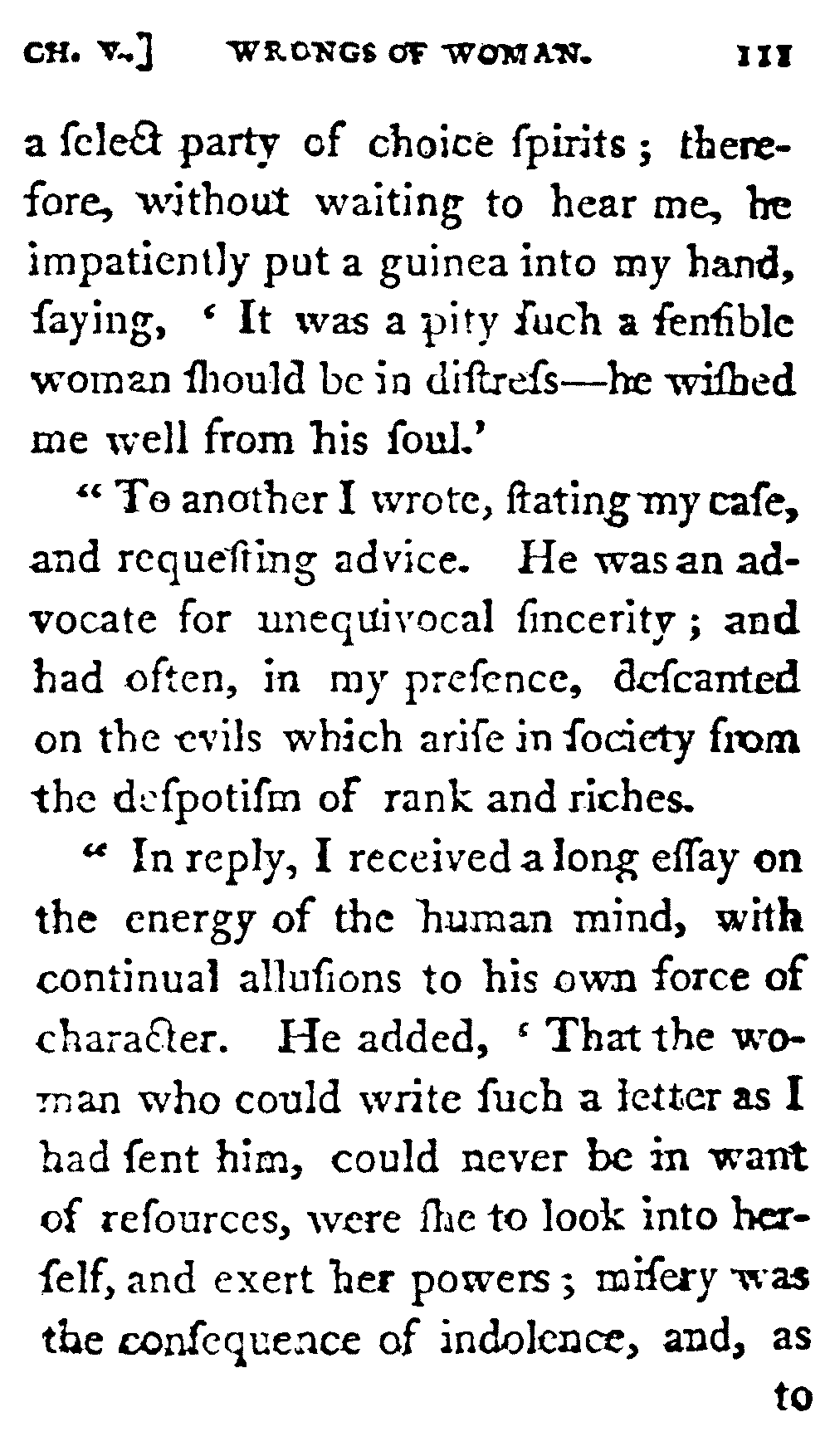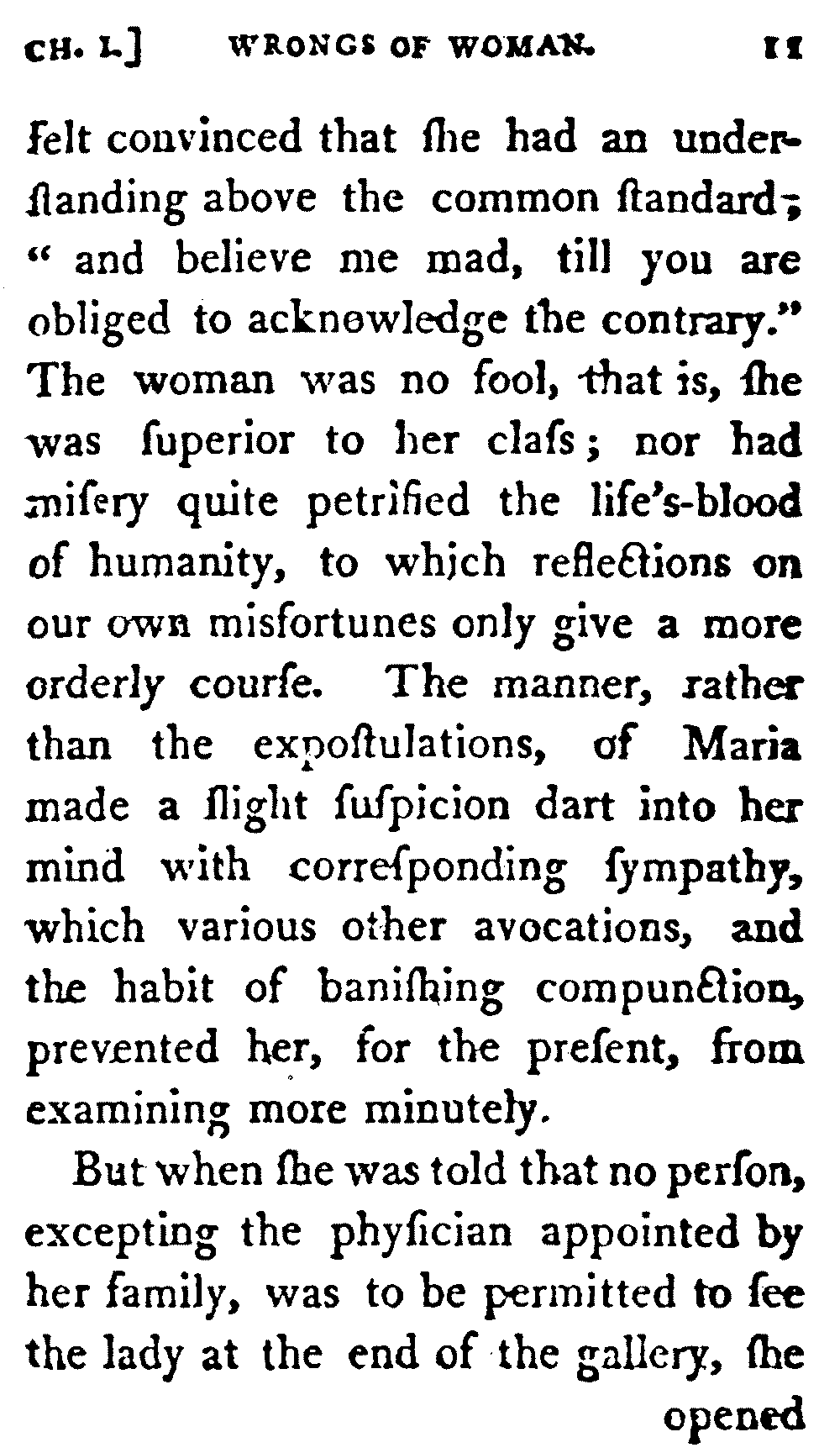 "Come to me often," said Maria, with a tone of persuasion, in consequence of a vague plan that she had hastily adopted, when, after surveying this woman's form and features, she[11] felt convinced that she had an understanding above the common standard; "and believe me mad, till you are obliged to acknowledge the contrary." The woman was no fool, that is, she was superior to her class; nor had misery quite petrified the life's-blood of humanity, to which reflections on our own misfortunes only give a more orderly course. The manner, rather than the expostulations, of Maria made a slight suspicion dart into her mind with corresponding sympathy, which various other avocations, and the habit of banishing compunction, prevented her, for the present, from examining more minutely.