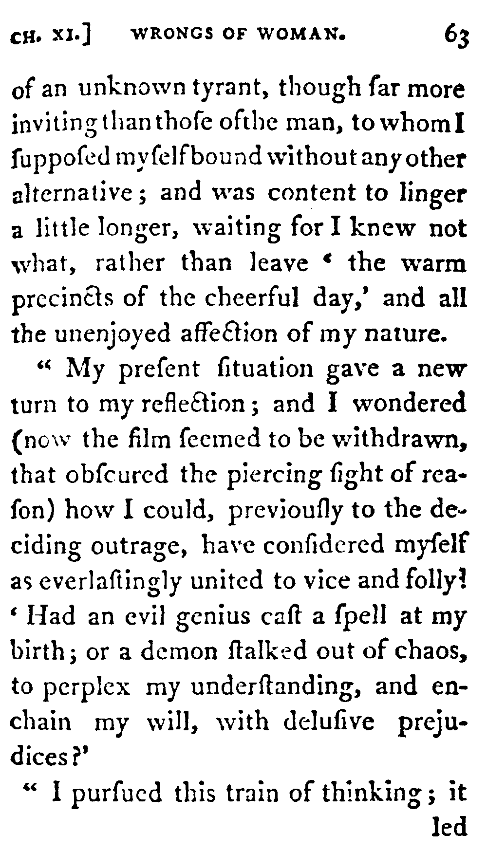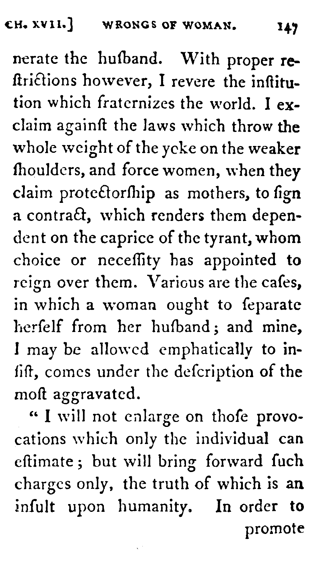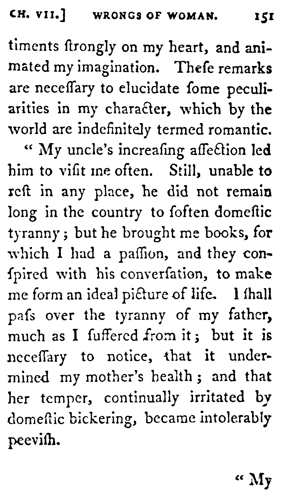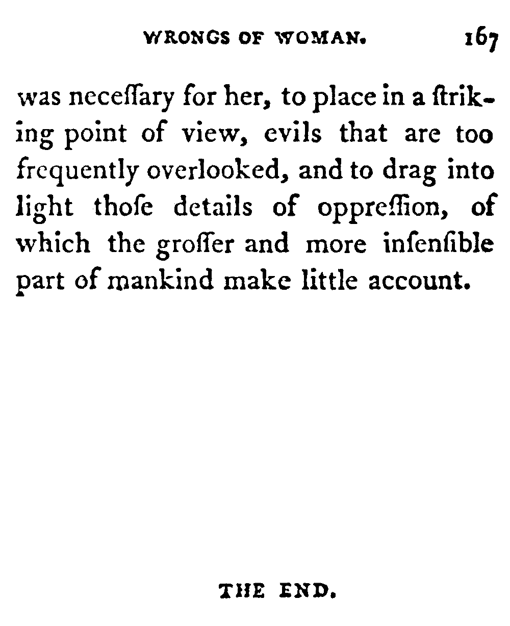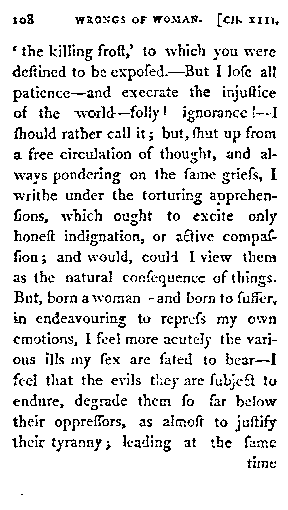 These appear to me (matrimonial despotism of heart and conduct) to be the peculiar Wrongs of Woman, be[xvii]cause they degrade the mind. What are termed great misfortunes, may more forcibly impress the mind of common readers; they have more of what may justly be termed stage-effect; but it is the delineation of finer sensations, which, in my opinion, constitutes the merit of our best novels. This is what I have in view; and to show the wrongs of different classes of women, equally oppressive, though, from the difference of education, necessarily various.