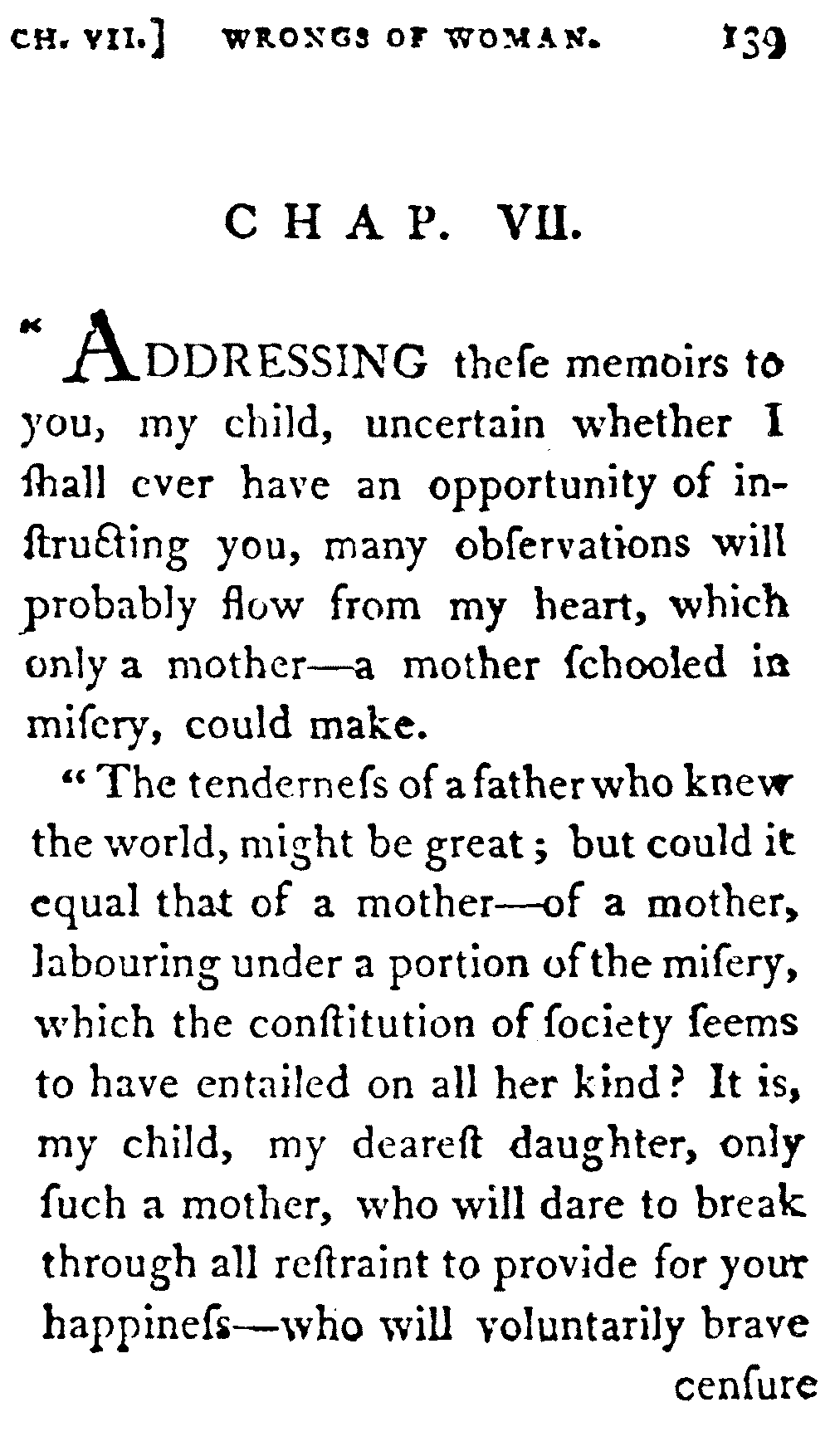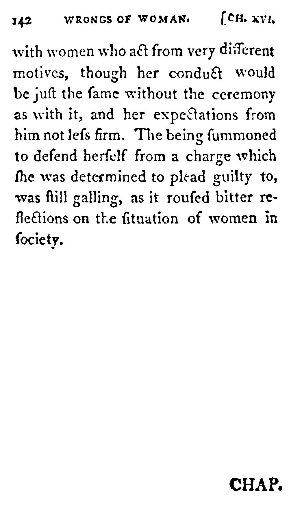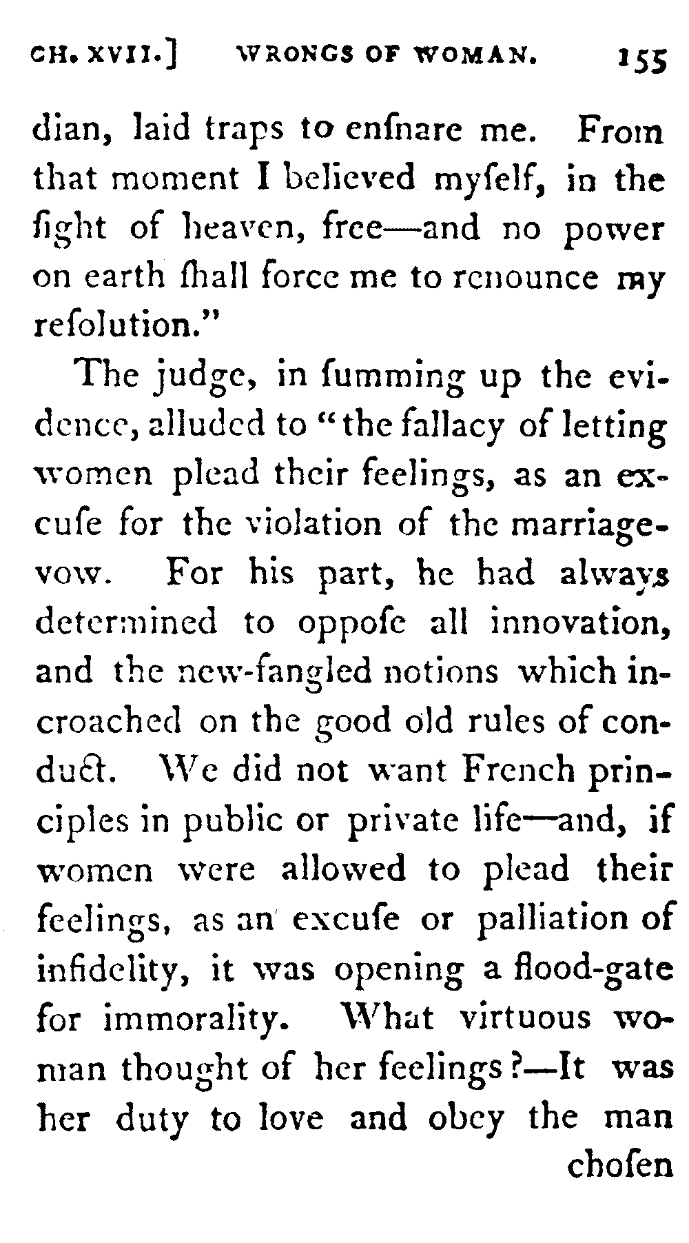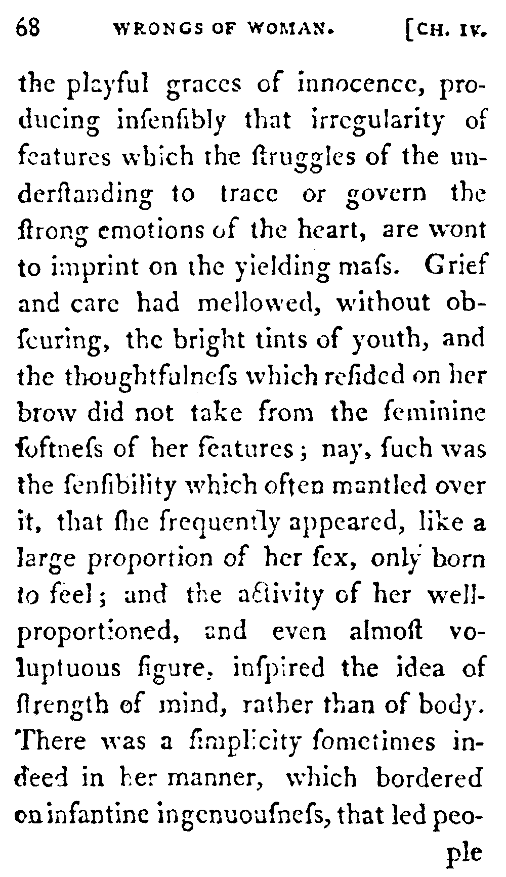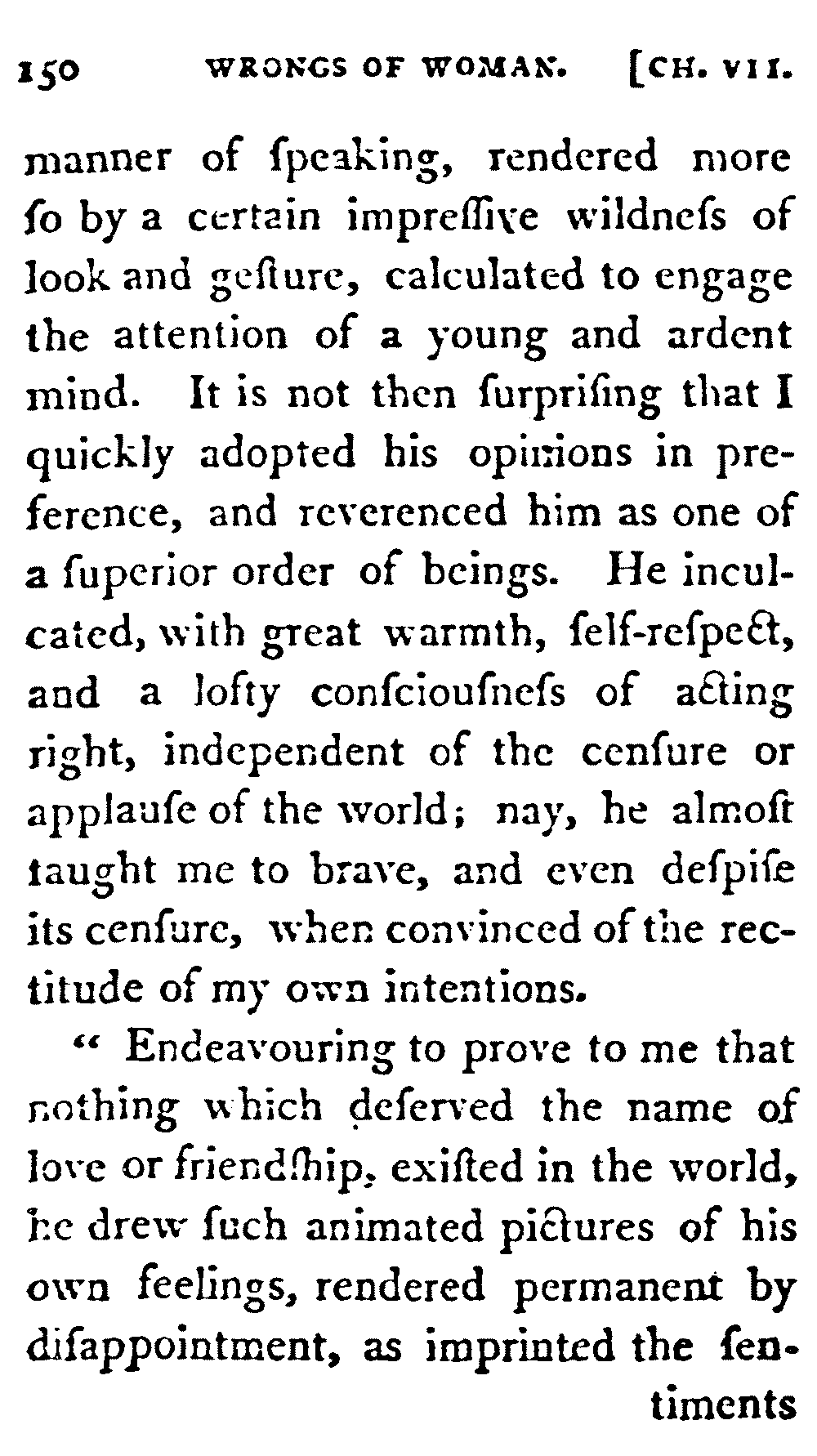 These appear to me (matrimonial despotism of heart and conduct) to be the peculiar Wrongs of Woman, be[xvii]cause they degrade the mind. What are termed great misfortunes, may more forcibly impress the mind of common readers; they have more of what may justly be termed stage-effect; but it is the delineation of finer sensations, which, in my opinion, constitutes the merit of our best novels. This is what I have in view; and to show the wrongs of different classes of women, equally oppressive, though, from the difference of education, necessarily various.