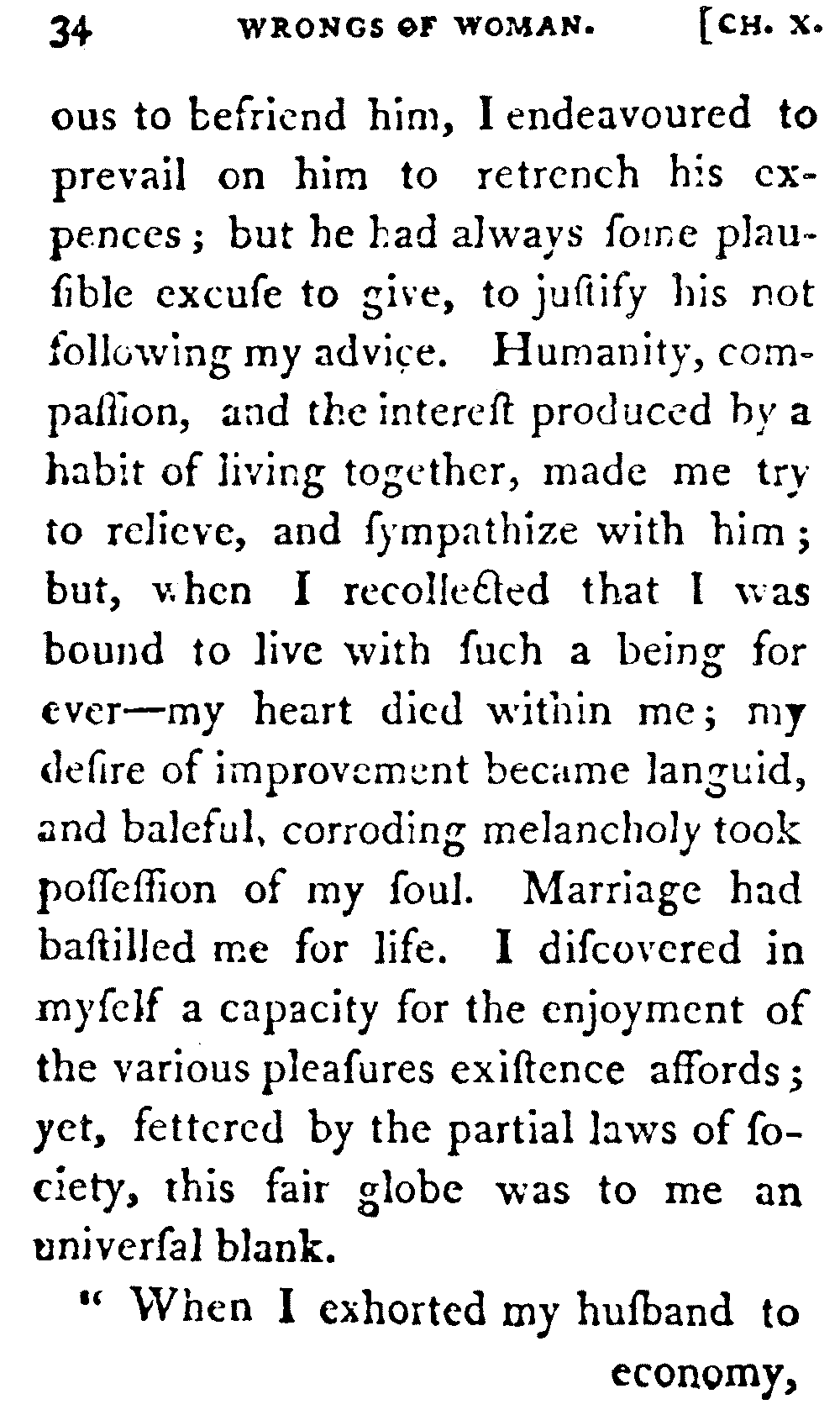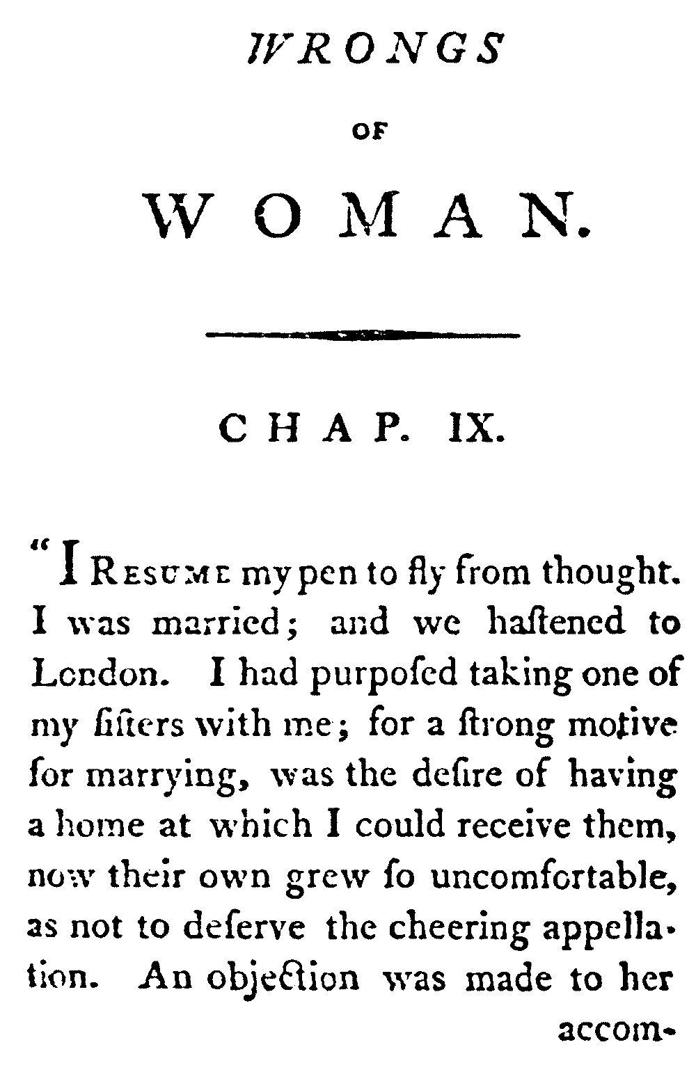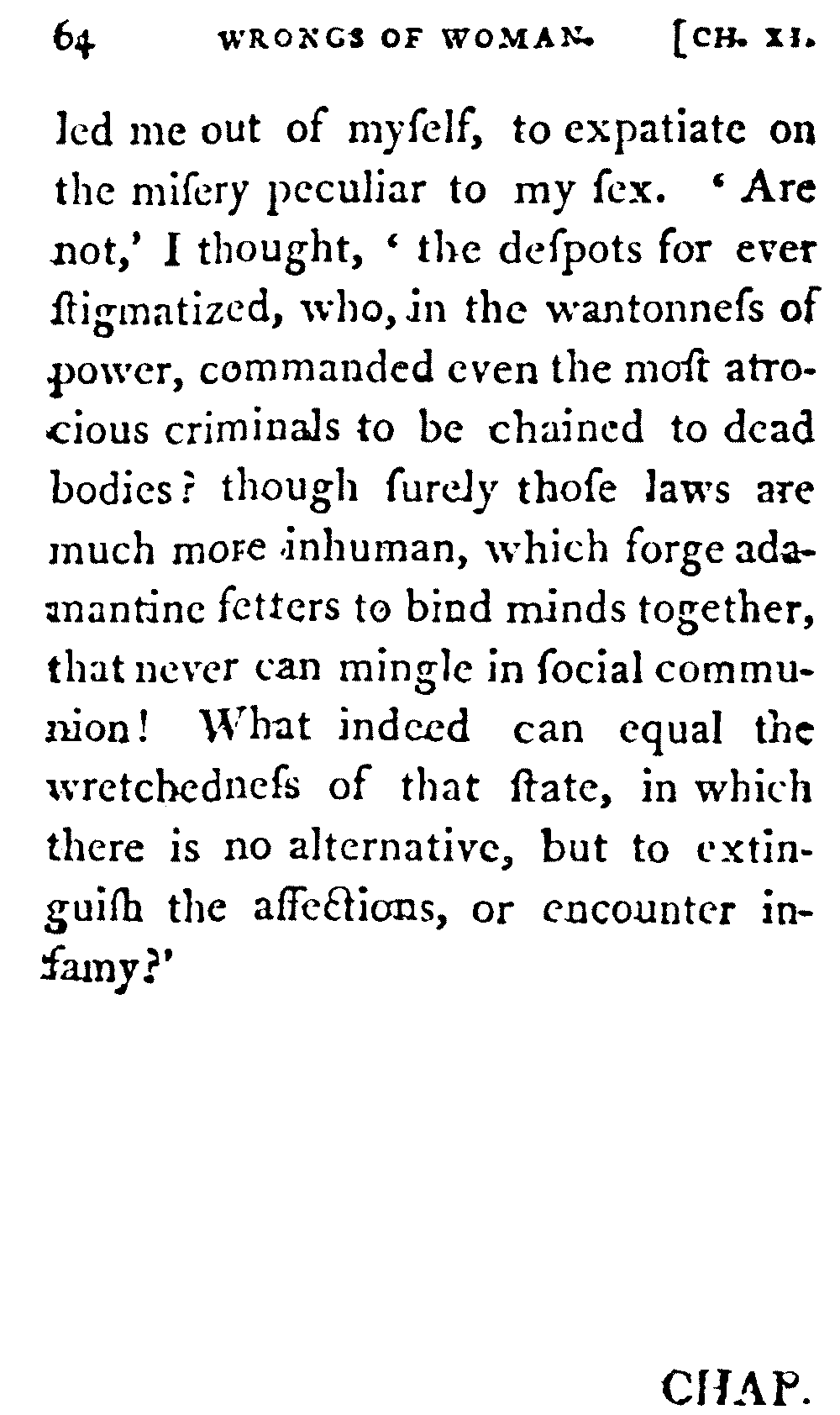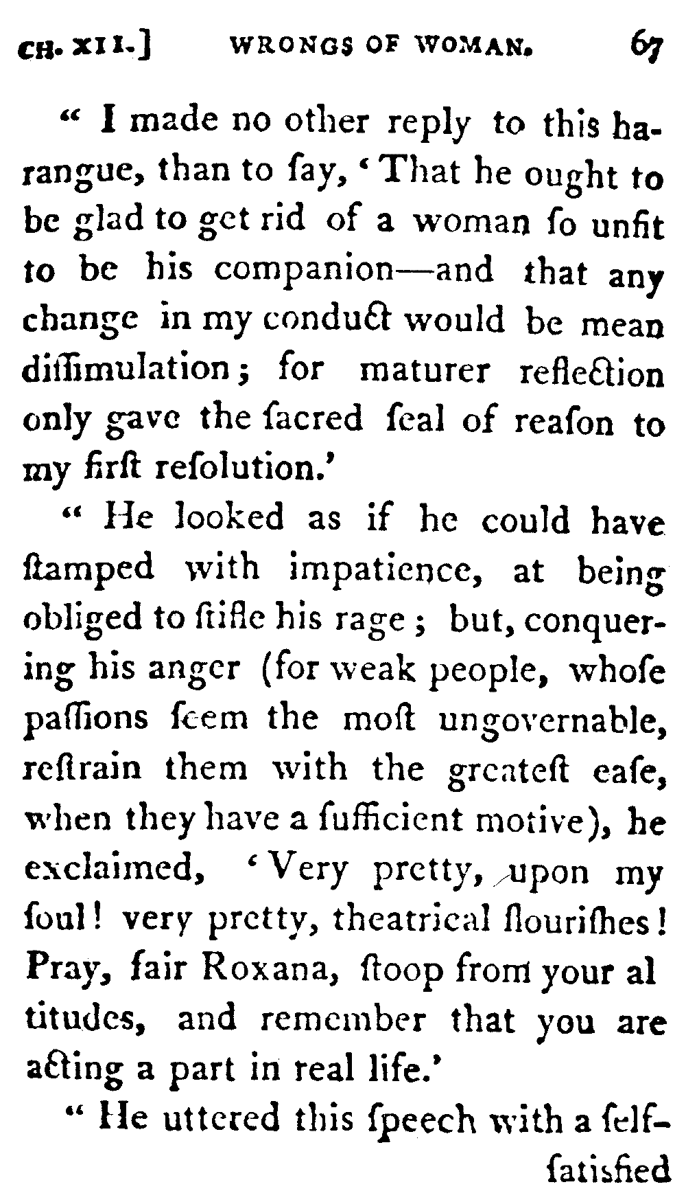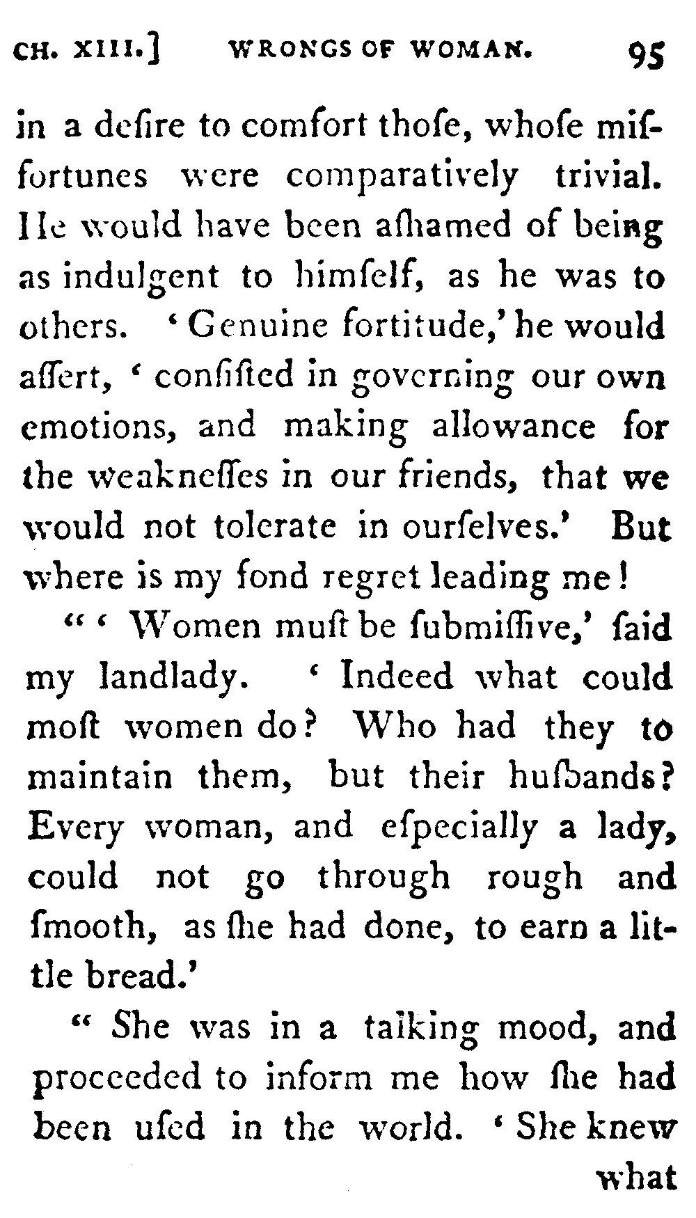 These appear to me (matrimonial despotism of heart and conduct) to be the peculiar Wrongs of Woman, be[xvii]cause they degrade the mind. What are termed great misfortunes, may more forcibly impress the mind of common readers; they have more of what may justly be termed stage-effect; but it is the delineation of finer sensations, which, in my opinion, constitutes the merit of our best novels. This is what I have in view; and to show the wrongs of different classes of women, equally oppressive, though, from the difference of education, necessarily various.