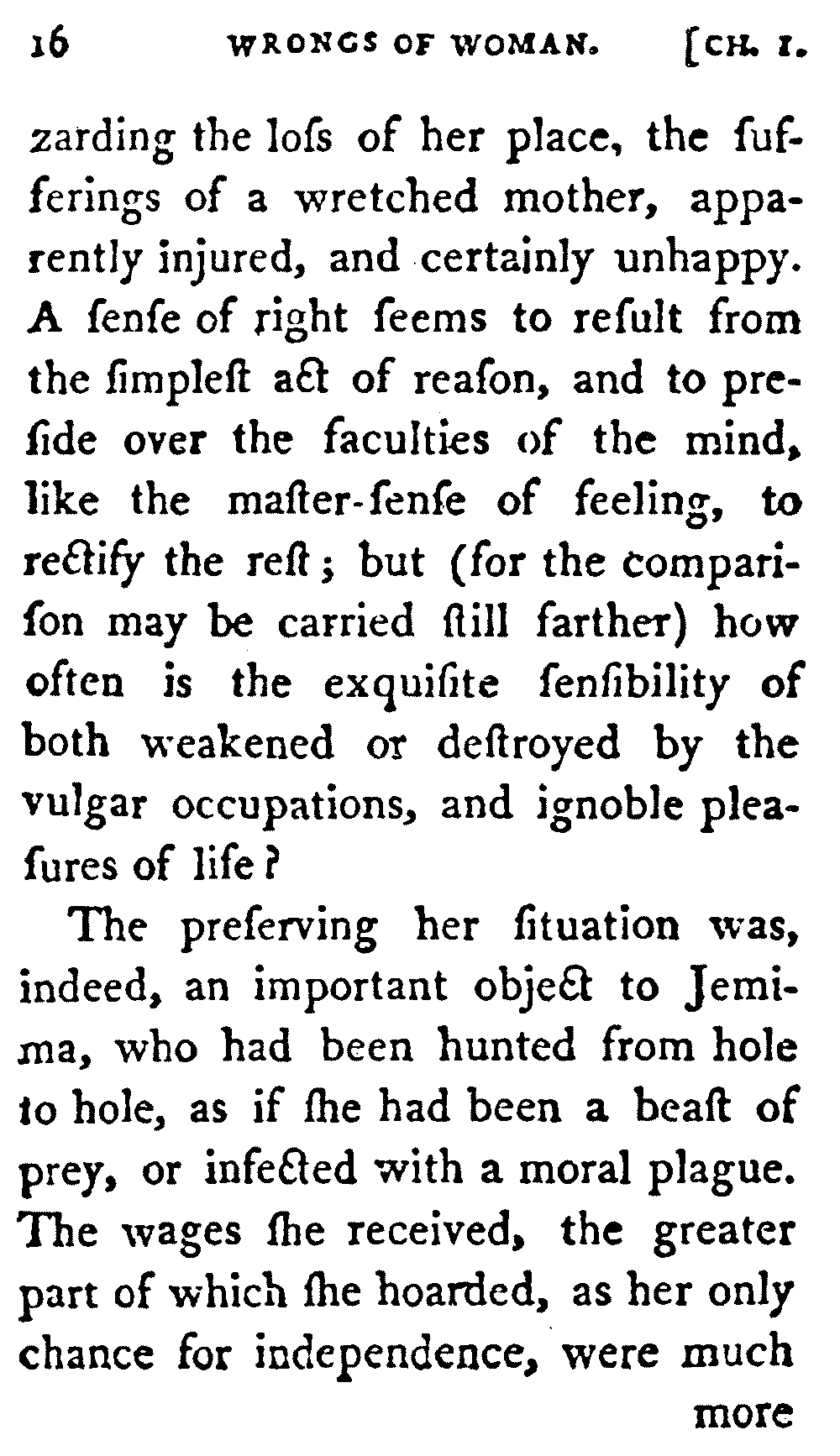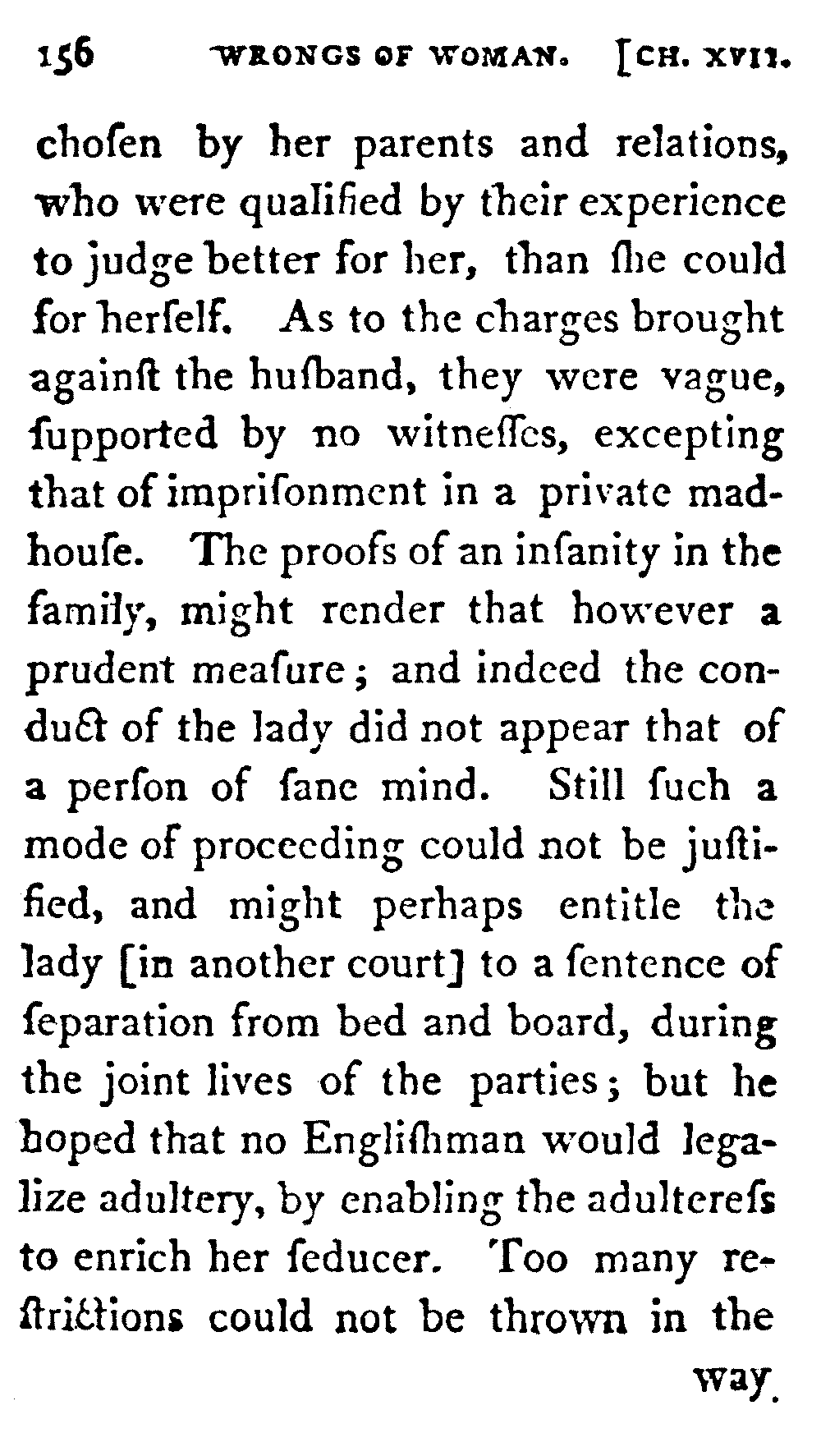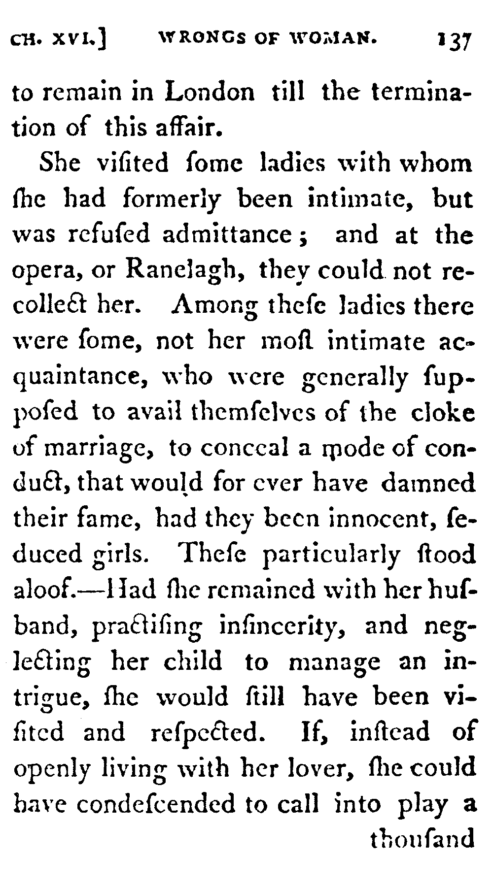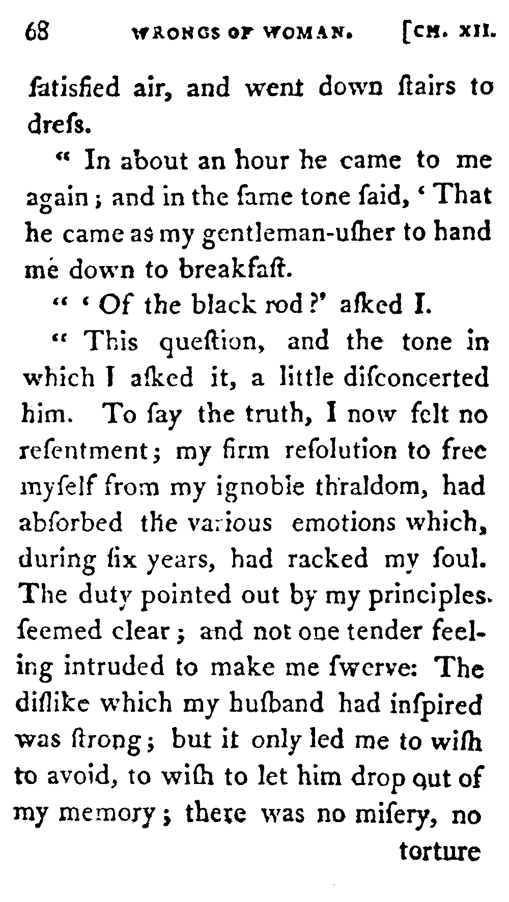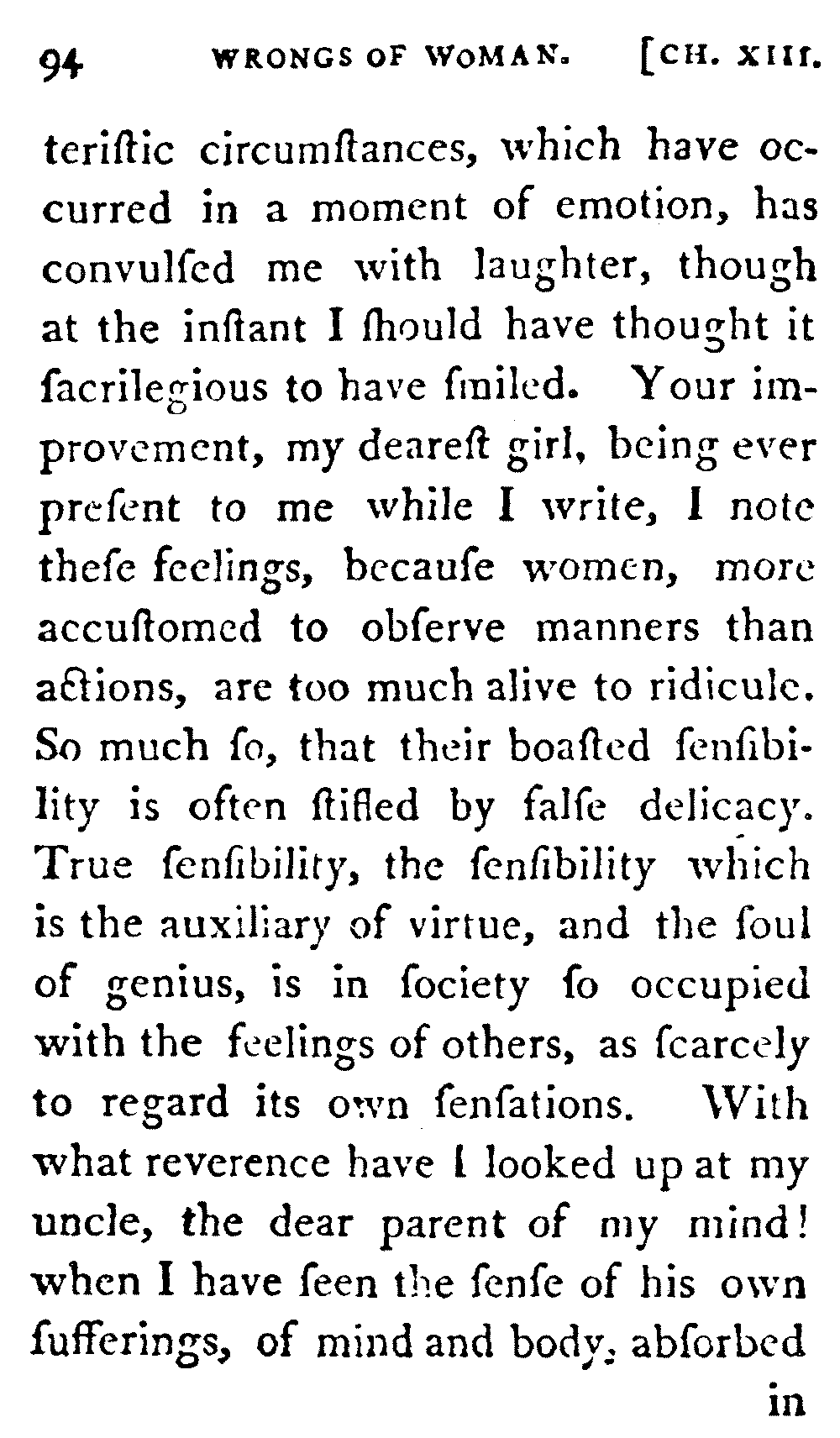 These appear to me (matrimonial despotism of heart and conduct) to be the peculiar Wrongs of Woman, be[xvii]cause they degrade the mind. What are termed great misfortunes, may more forcibly impress the mind of common readers; they have more of what may justly be termed stage-effect; but it is the delineation of finer sensations, which, in my opinion, constitutes the merit of our best novels. This is what I have in view; and to show the wrongs of different classes of women, equally oppressive, though, from the difference of education, necessarily various.