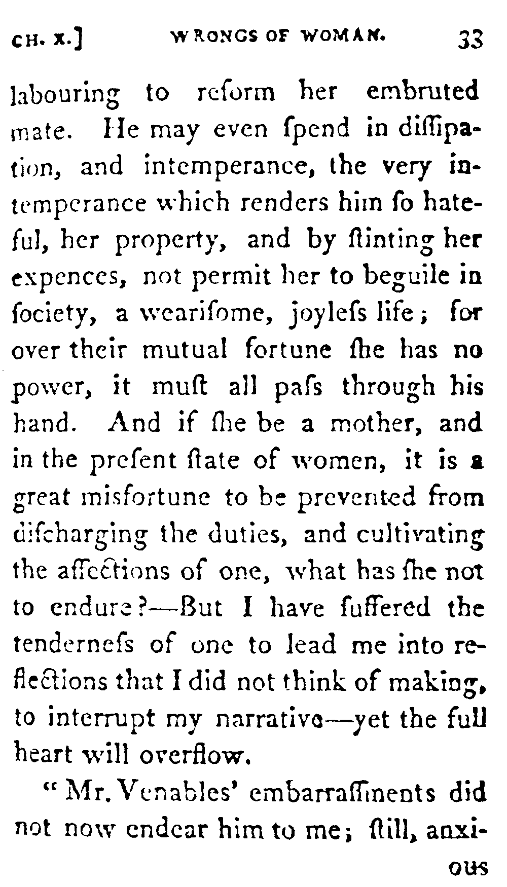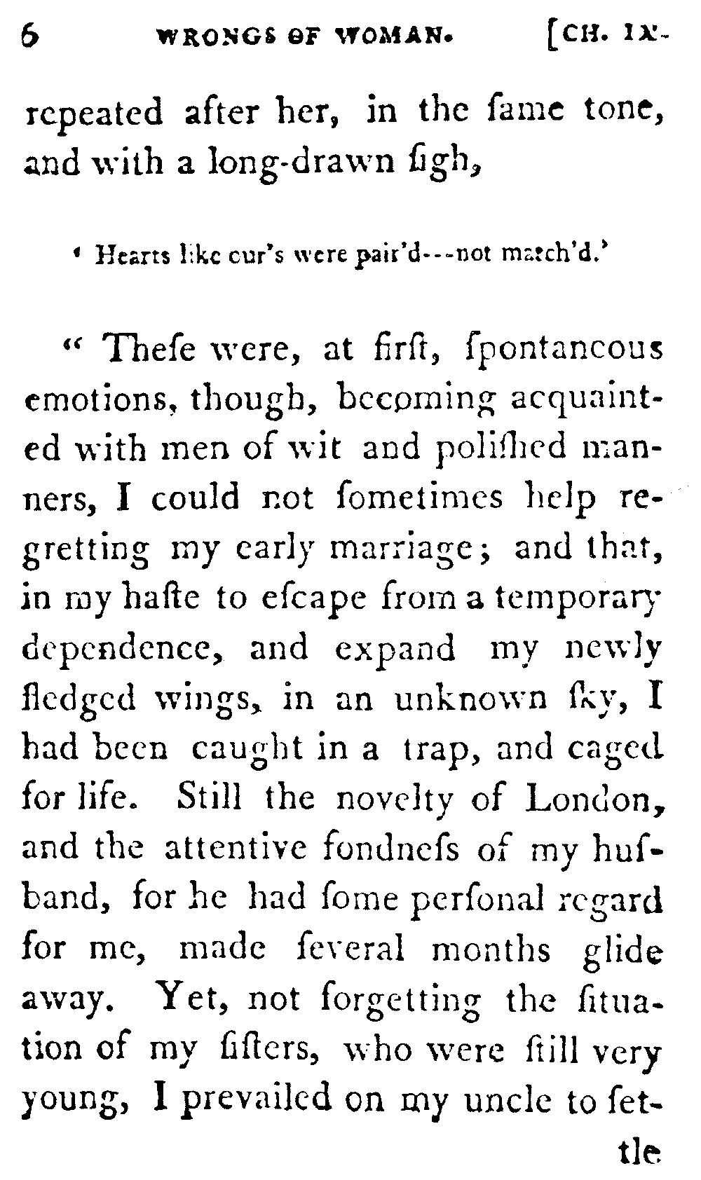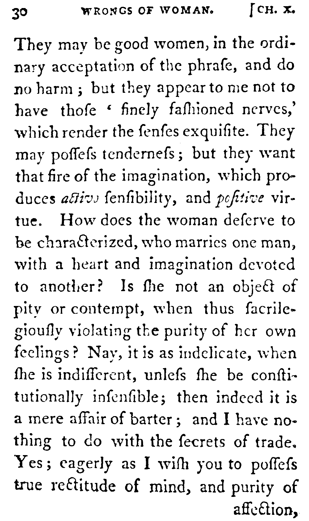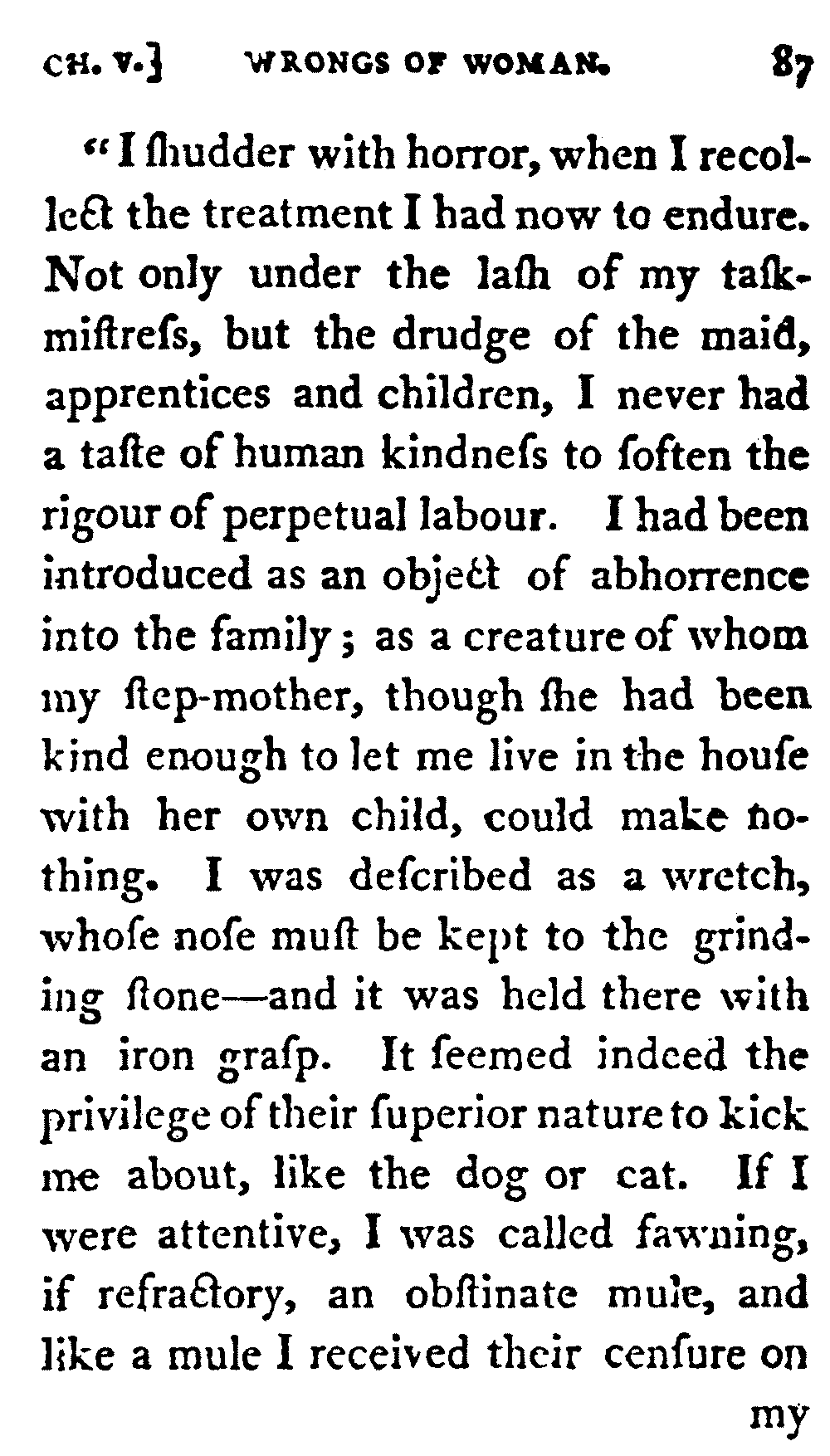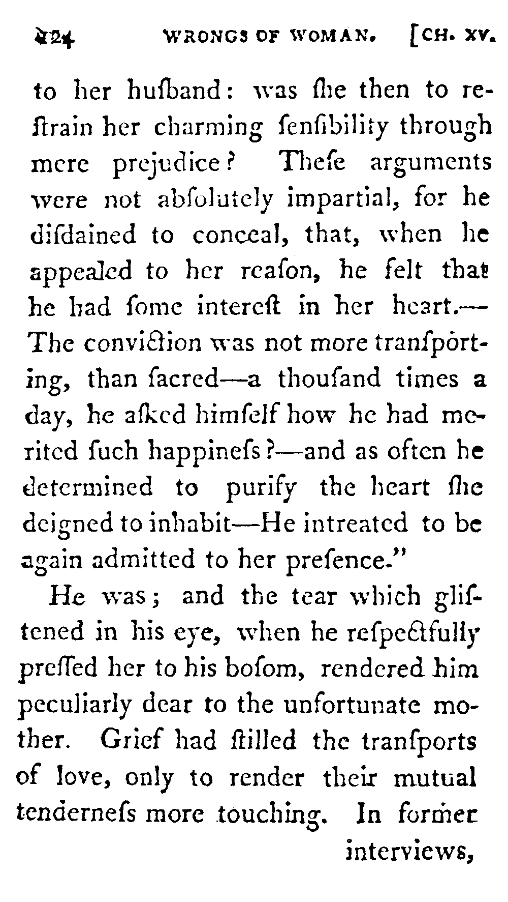 These appear to me (matrimonial despotism of heart and conduct) to be the peculiar Wrongs of Woman, be[xvii]cause they degrade the mind. What are termed great misfortunes, may more forcibly impress the mind of common readers; they have more of what may justly be termed stage-effect; but it is the delineation of finer sensations, which, in my opinion, constitutes the merit of our best novels. This is what I have in view; and to show the wrongs of different classes of women, equally oppressive, though, from the difference of education, necessarily various.