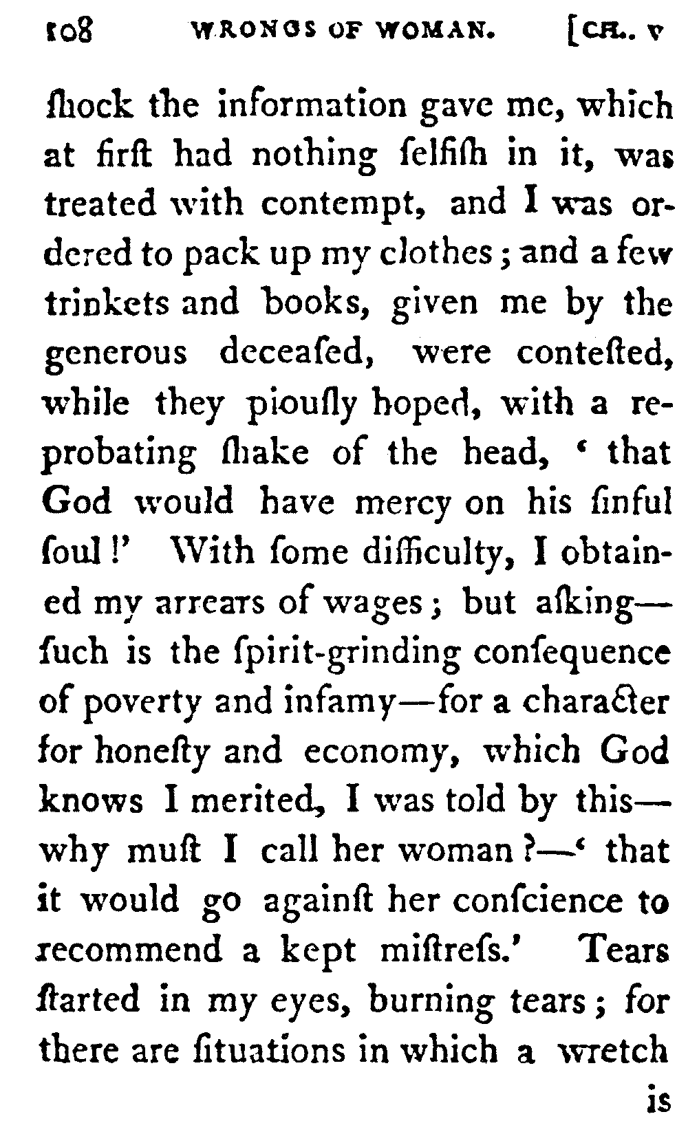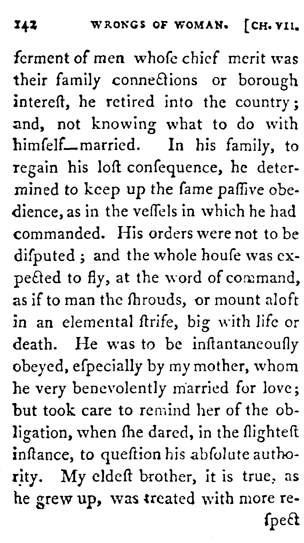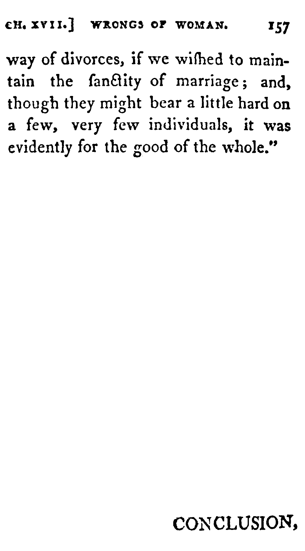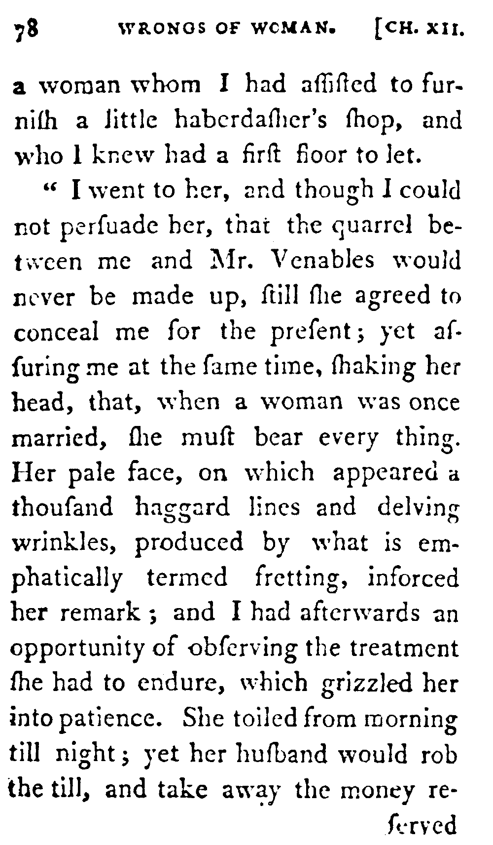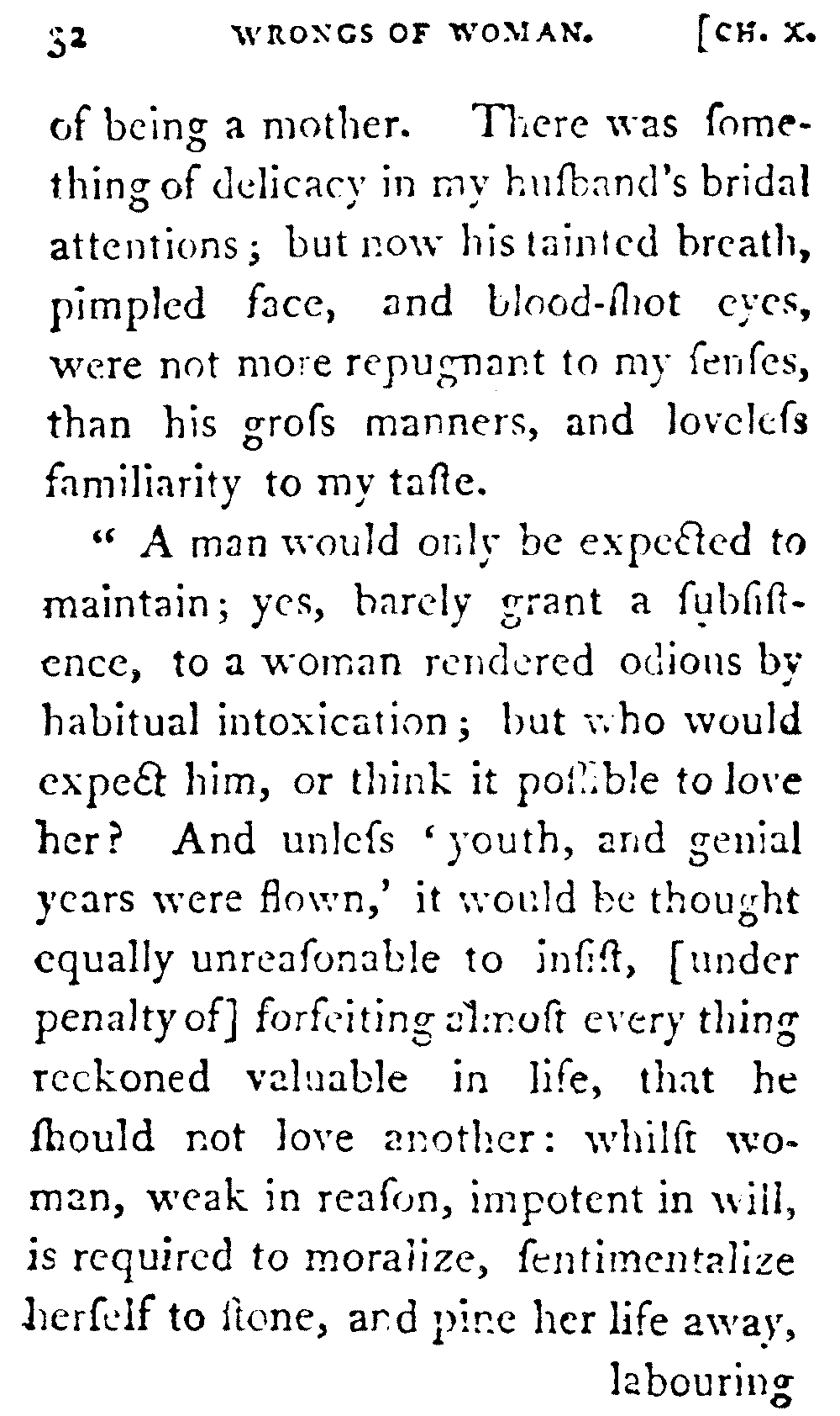 These appear to me (matrimonial despotism of heart and conduct) to be the peculiar Wrongs of Woman, be[xvii]cause they degrade the mind. What are termed great misfortunes, may more forcibly impress the mind of common readers; they have more of what may justly be termed stage-effect; but it is the delineation of finer sensations, which, in my opinion, constitutes the merit of our best novels. This is what I have in view; and to show the wrongs of different classes of women, equally oppressive, though, from the difference of education, necessarily various.