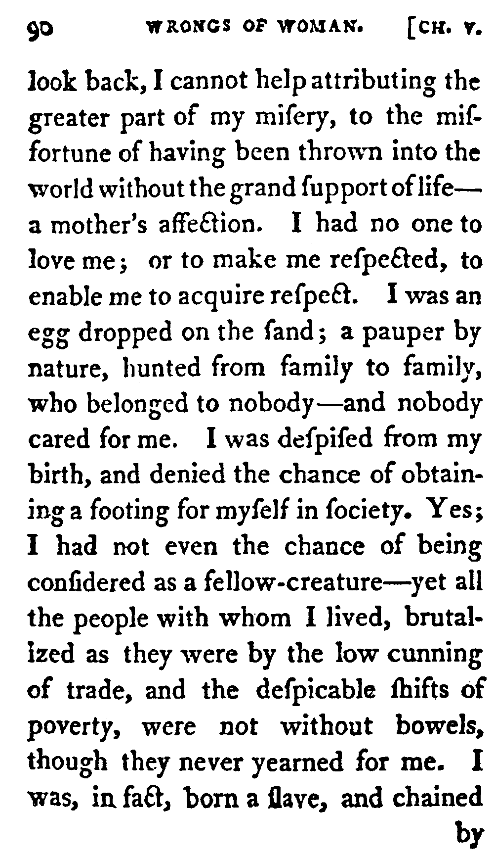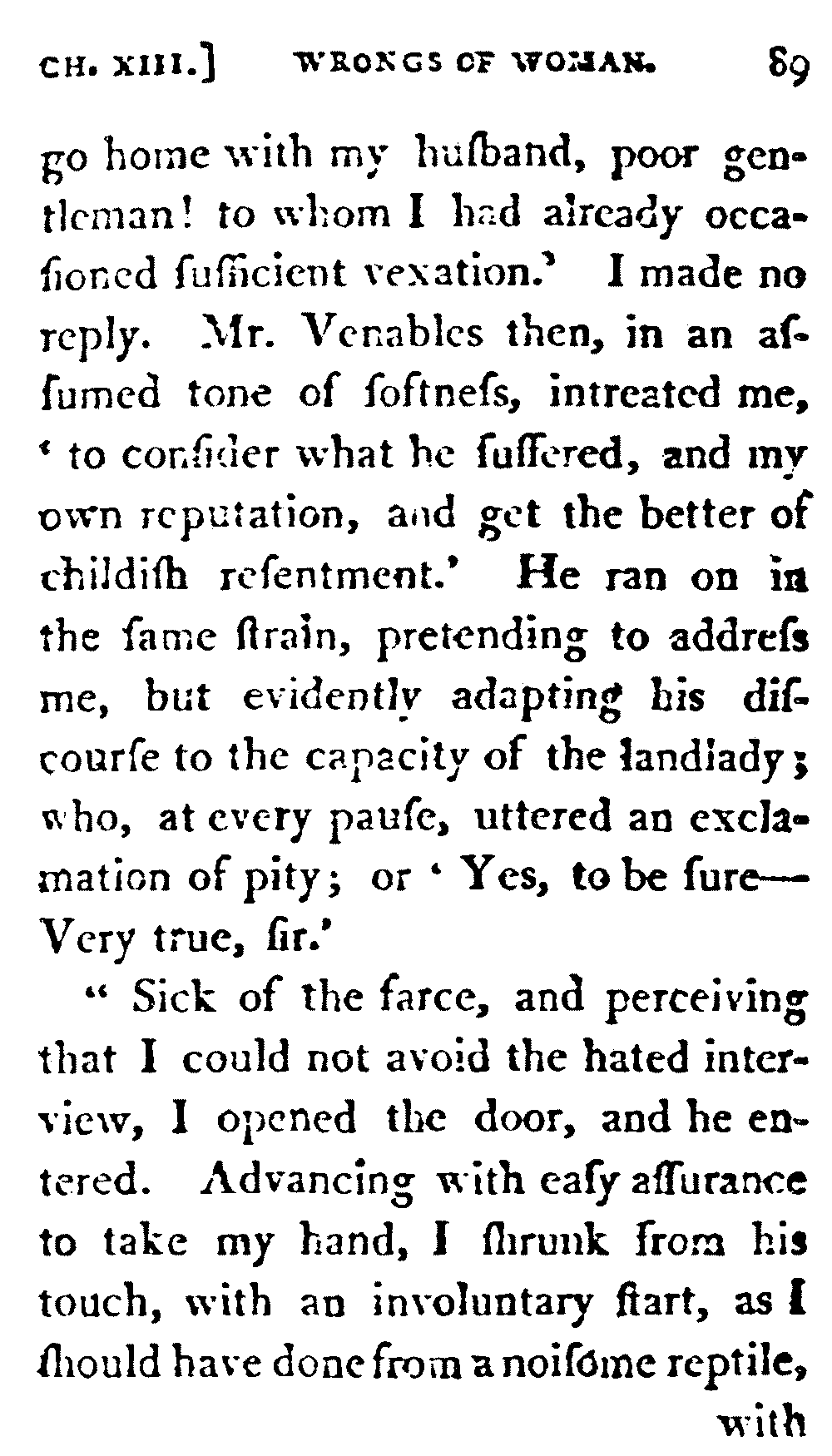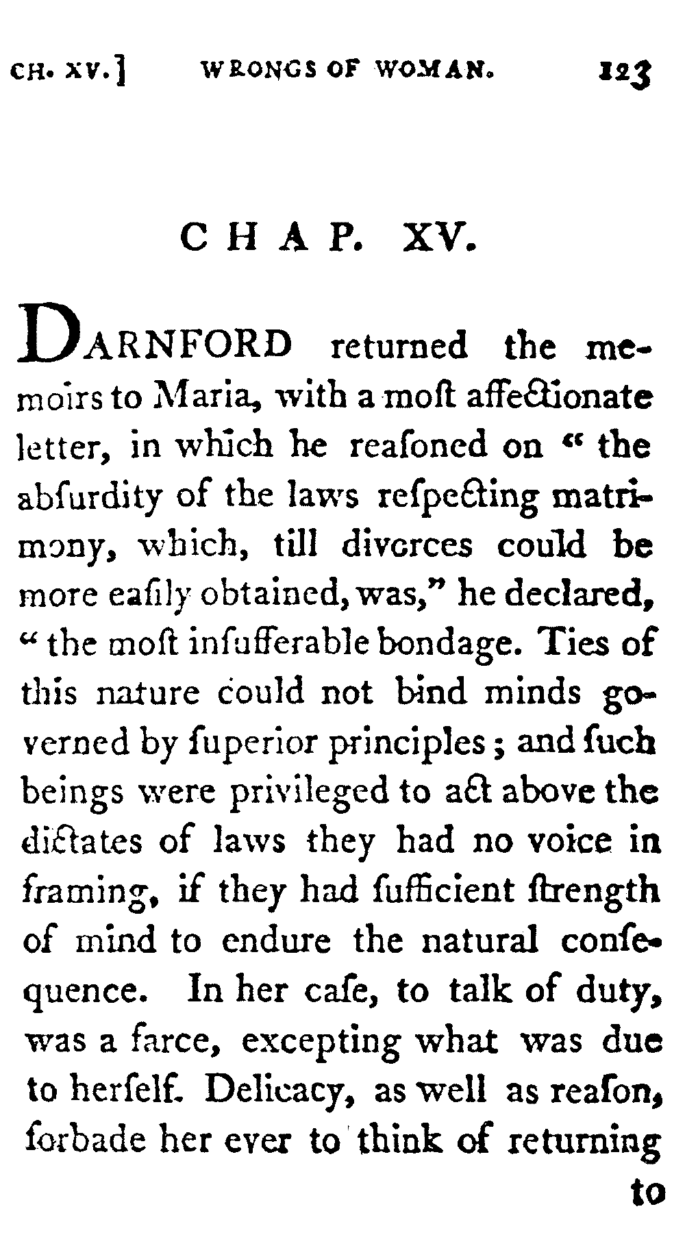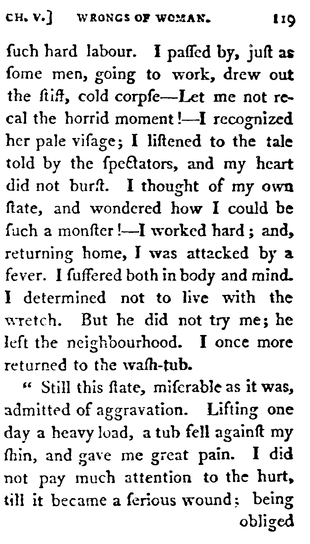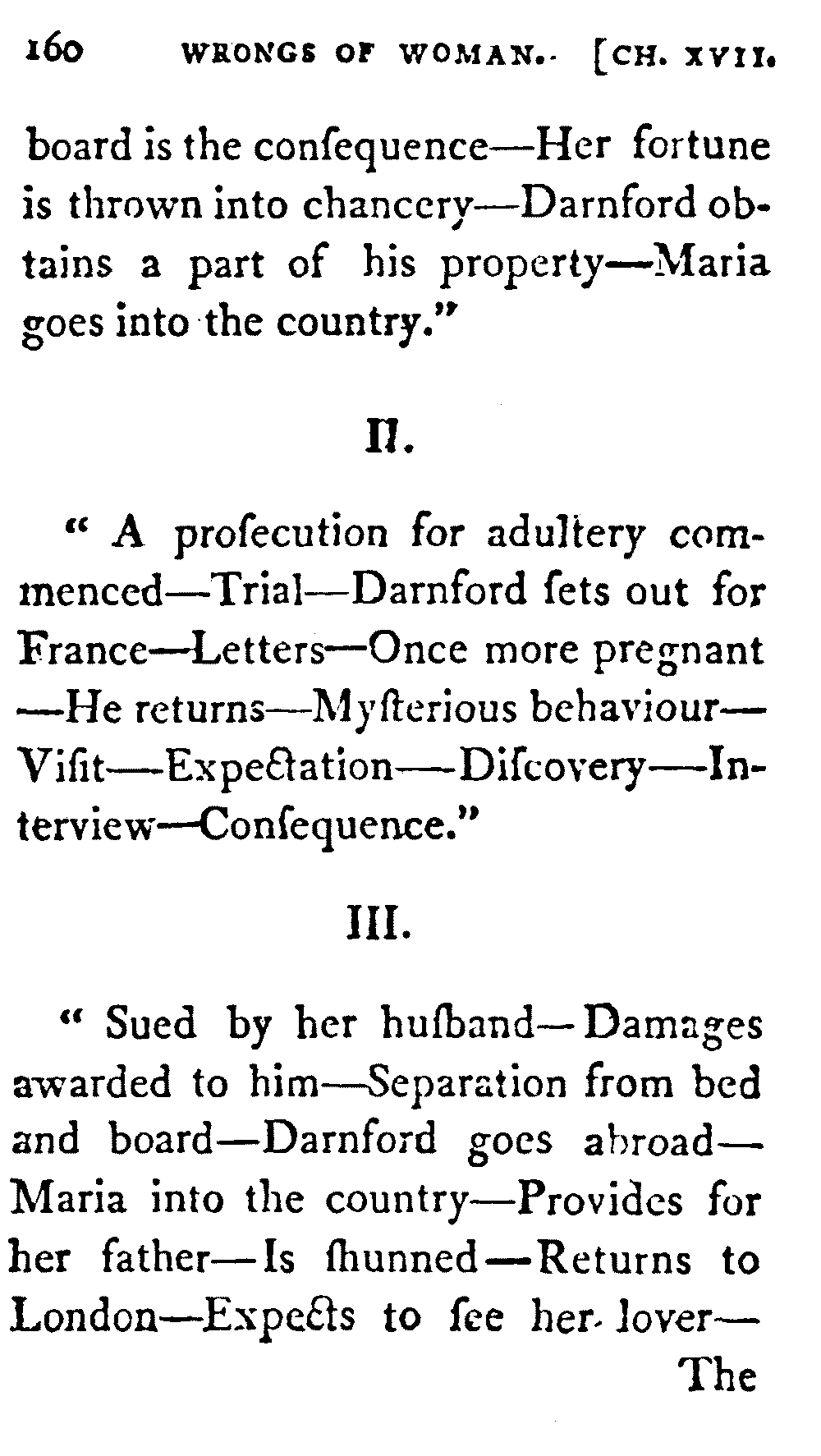 These appear to me (matrimonial despotism of heart and conduct) to be the peculiar Wrongs of Woman, be[xvii]cause they degrade the mind. What are termed great misfortunes, may more forcibly impress the mind of common readers; they have more of what may justly be termed stage-effect; but it is the delineation of finer sensations, which, in my opinion, constitutes the merit of our best novels. This is what I have in view; and to show the wrongs of different classes of women, equally oppressive, though, from the difference of education, necessarily various.