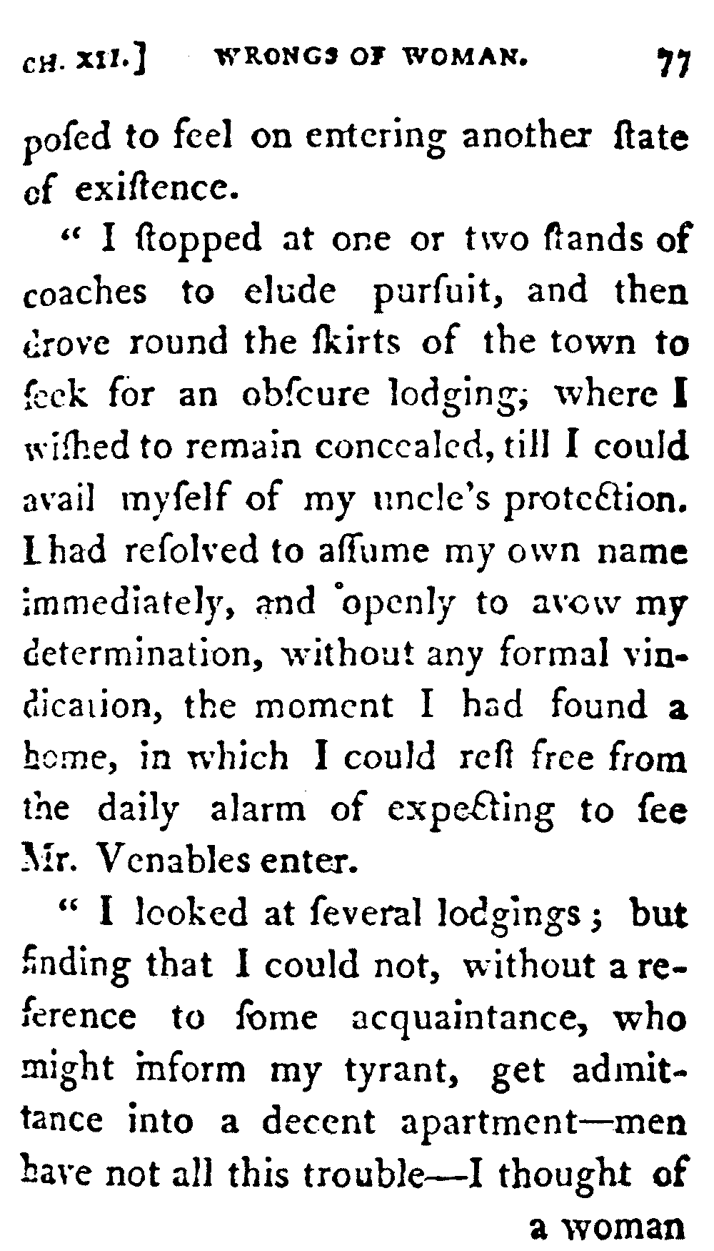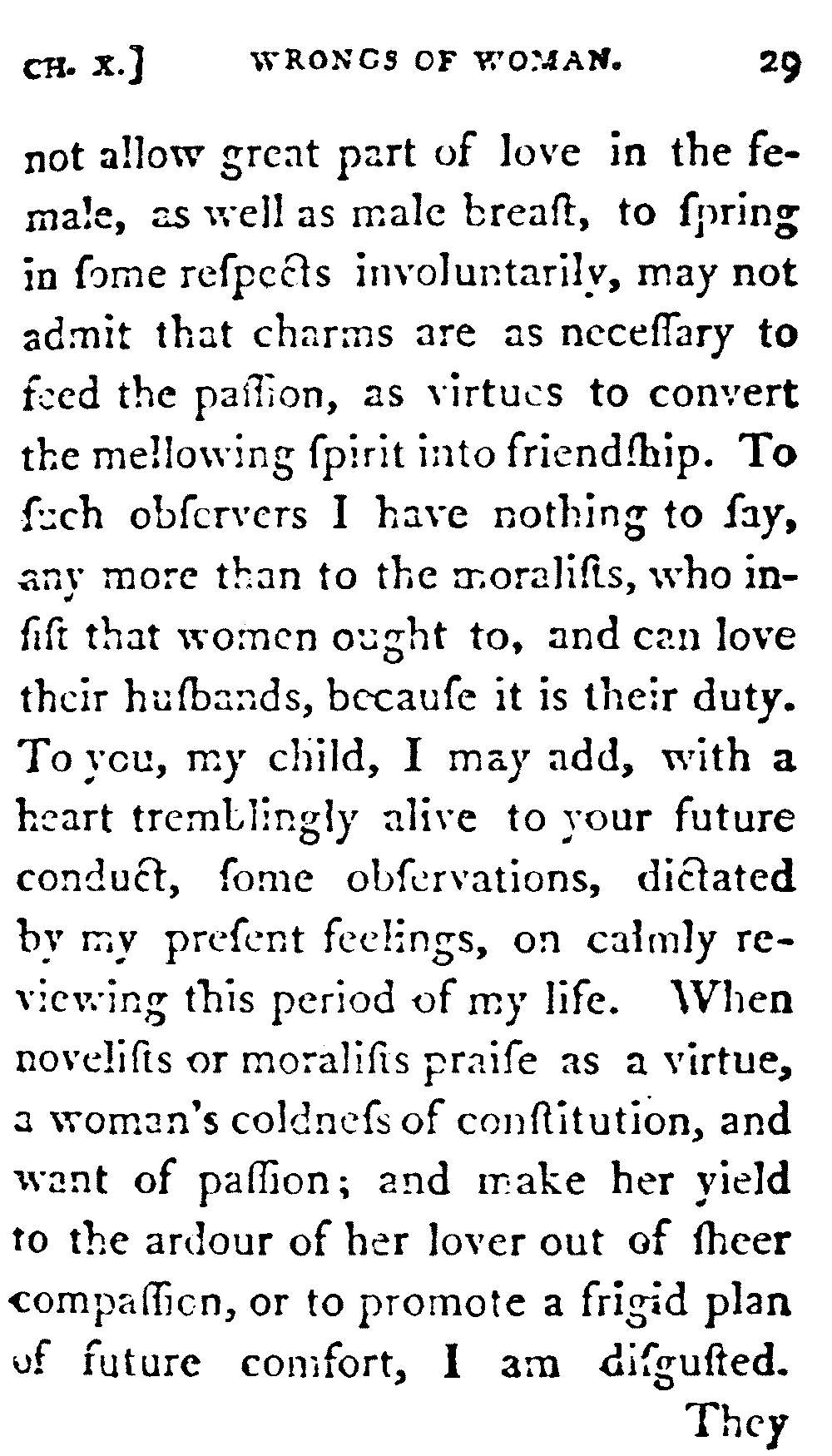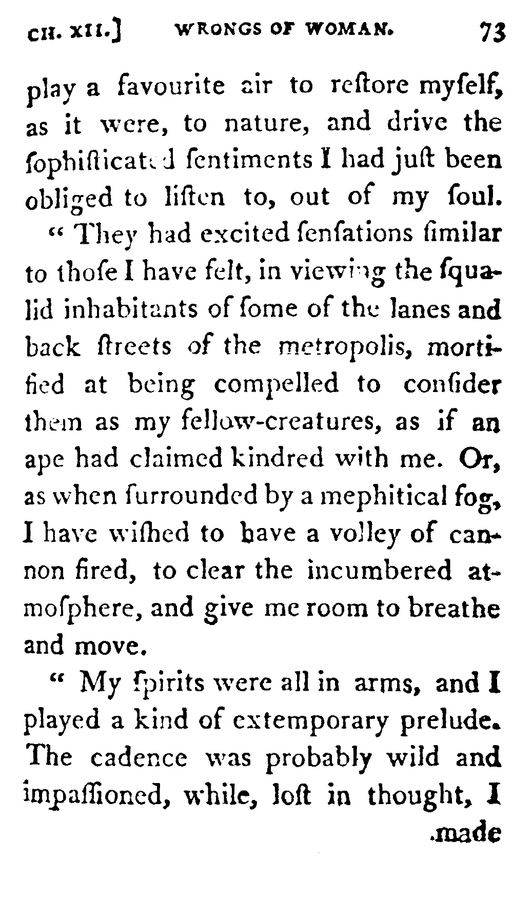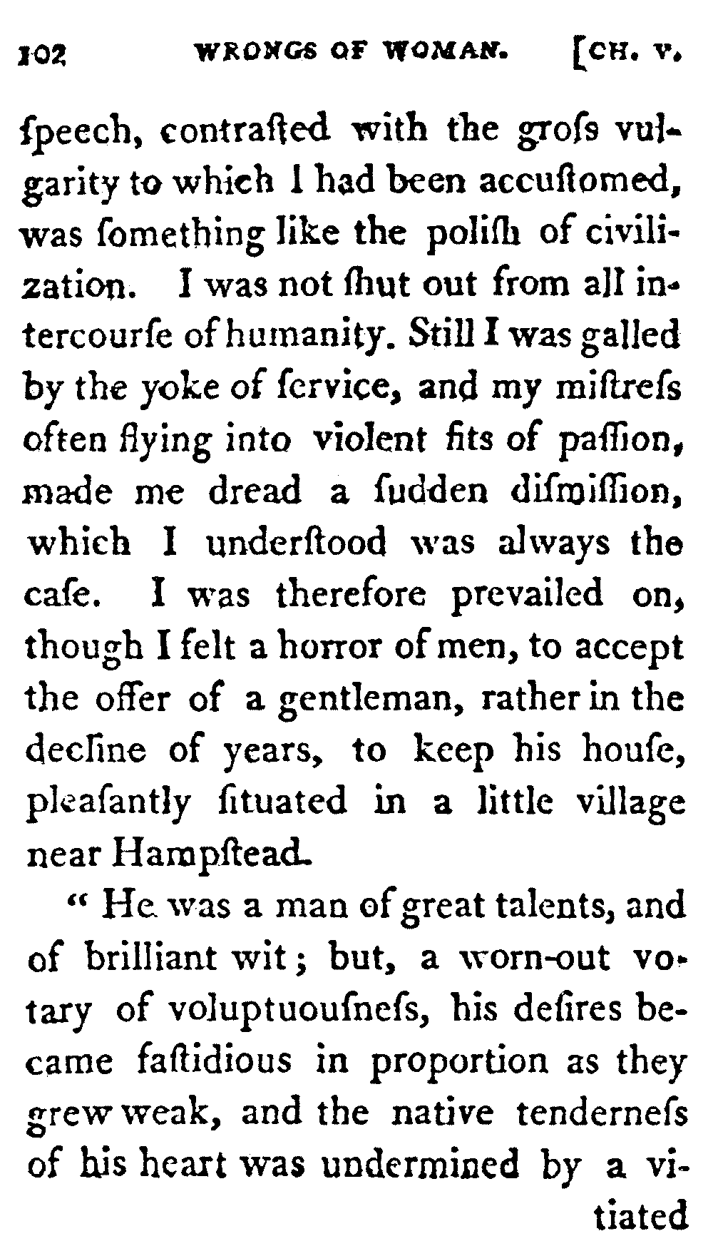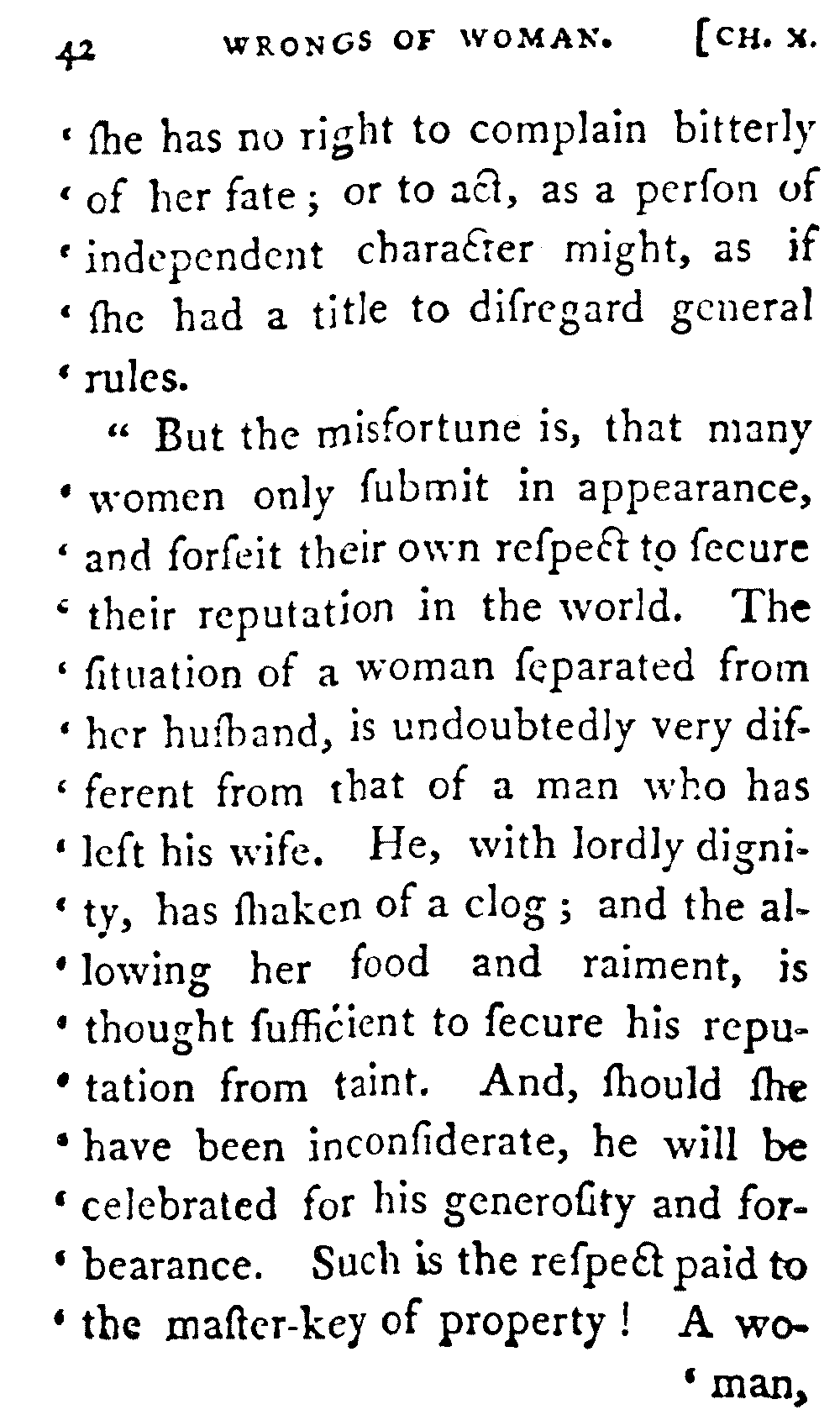 These appear to me (matrimonial despotism of heart and conduct) to be the peculiar Wrongs of Woman, be[xvii]cause they degrade the mind. What are termed great misfortunes, may more forcibly impress the mind of common readers; they have more of what may justly be termed stage-effect; but it is the delineation of finer sensations, which, in my opinion, constitutes the merit of our best novels. This is what I have in view; and to show the wrongs of different classes of women, equally oppressive, though, from the difference of education, necessarily various.