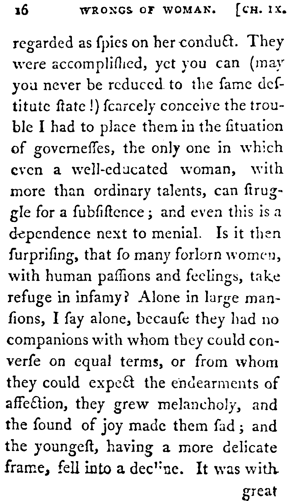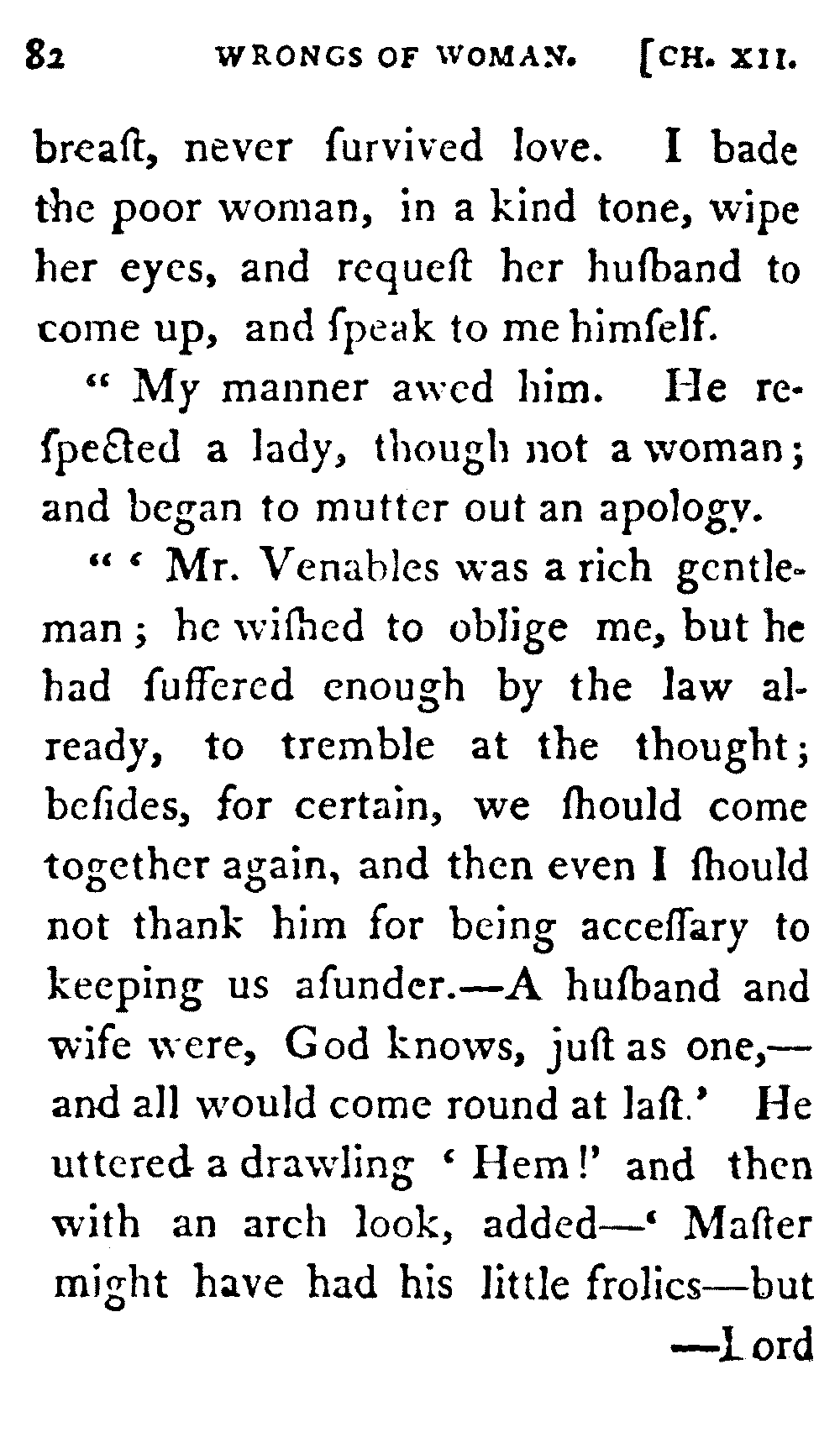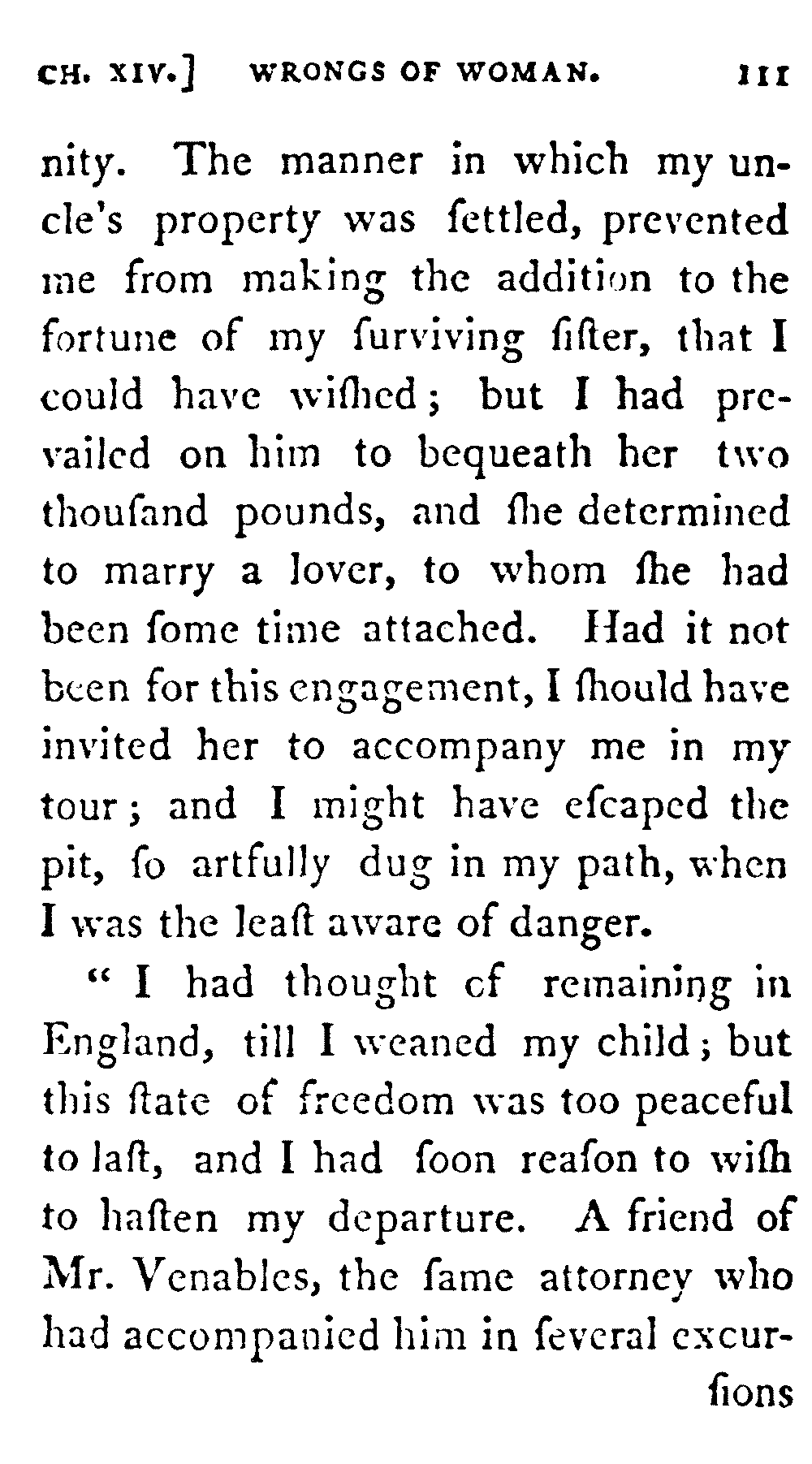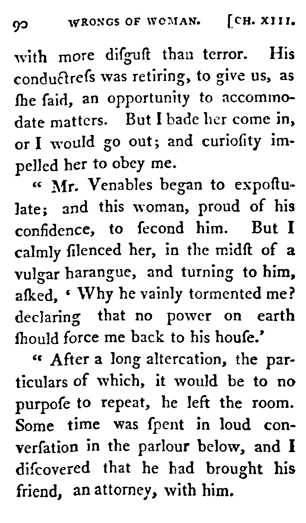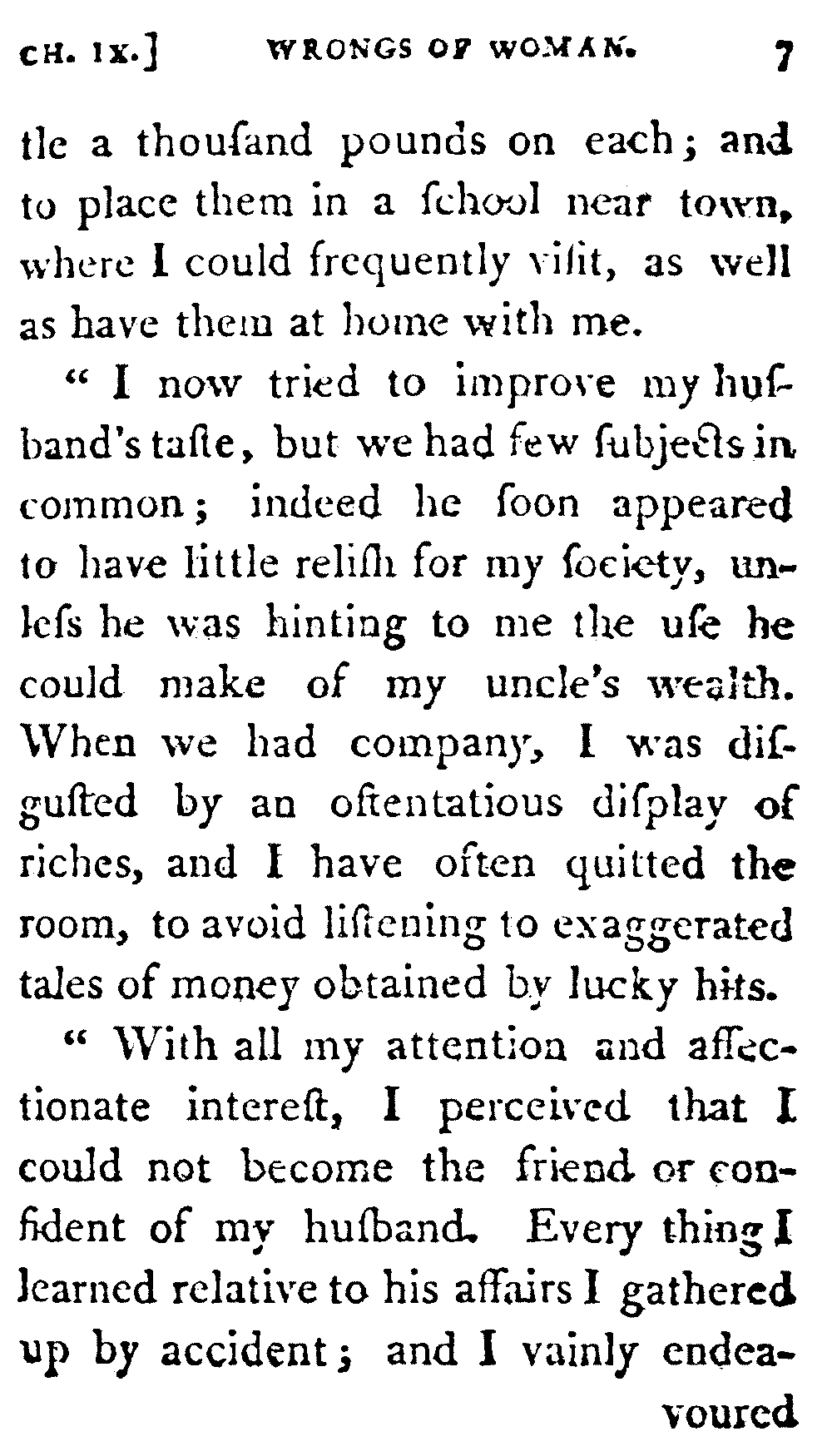 These appear to me (matrimonial despotism of heart and conduct) to be the peculiar Wrongs of Woman, be[xvii]cause they degrade the mind. What are termed great misfortunes, may more forcibly impress the mind of common readers; they have more of what may justly be termed stage-effect; but it is the delineation of finer sensations, which, in my opinion, constitutes the merit of our best novels. This is what I have in view; and to show the wrongs of different classes of women, equally oppressive, though, from the difference of education, necessarily various.