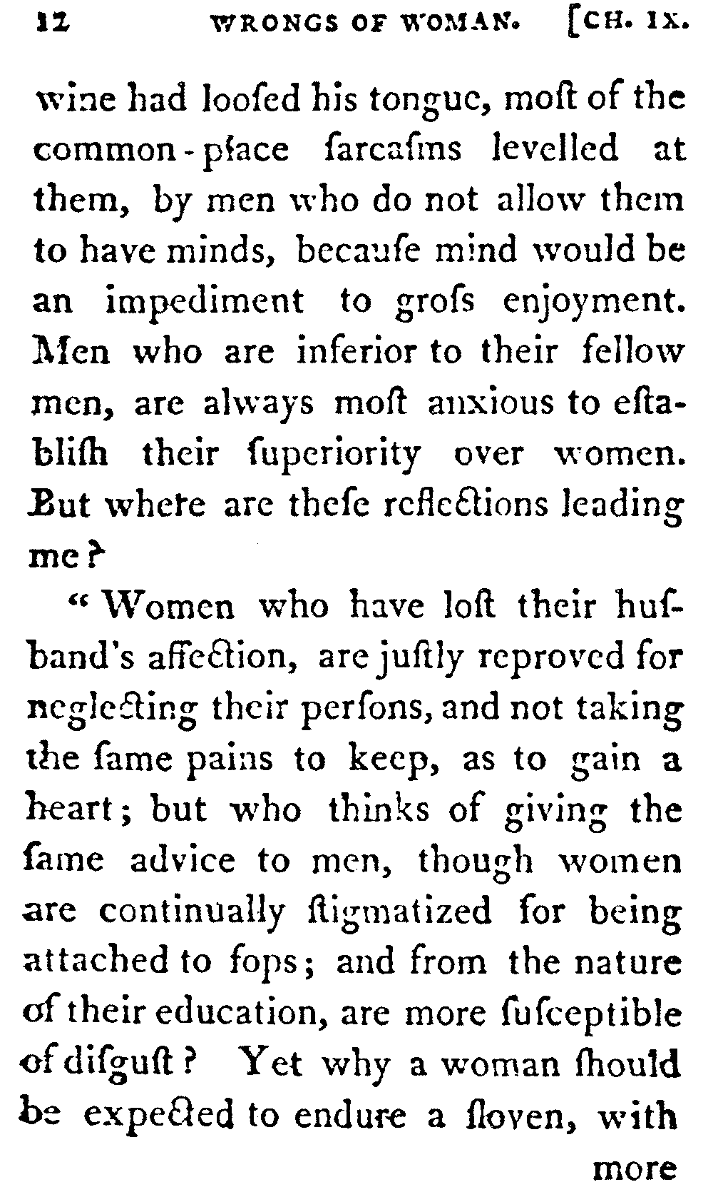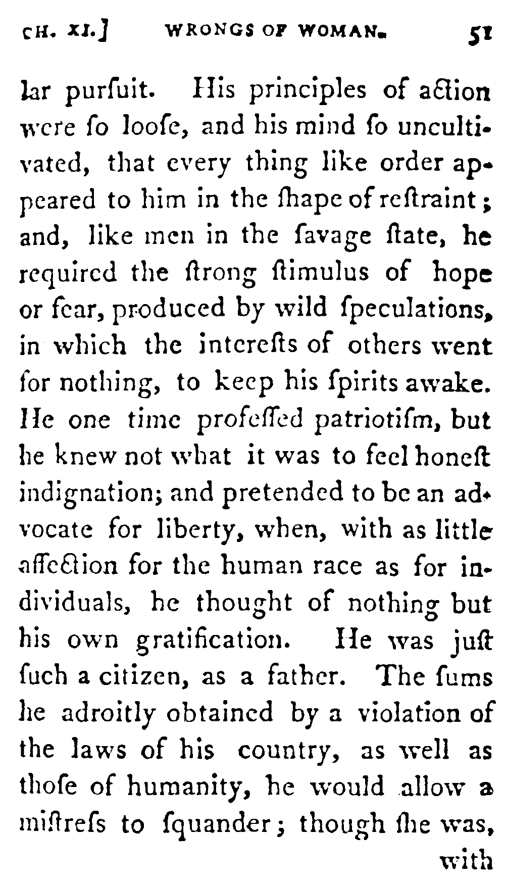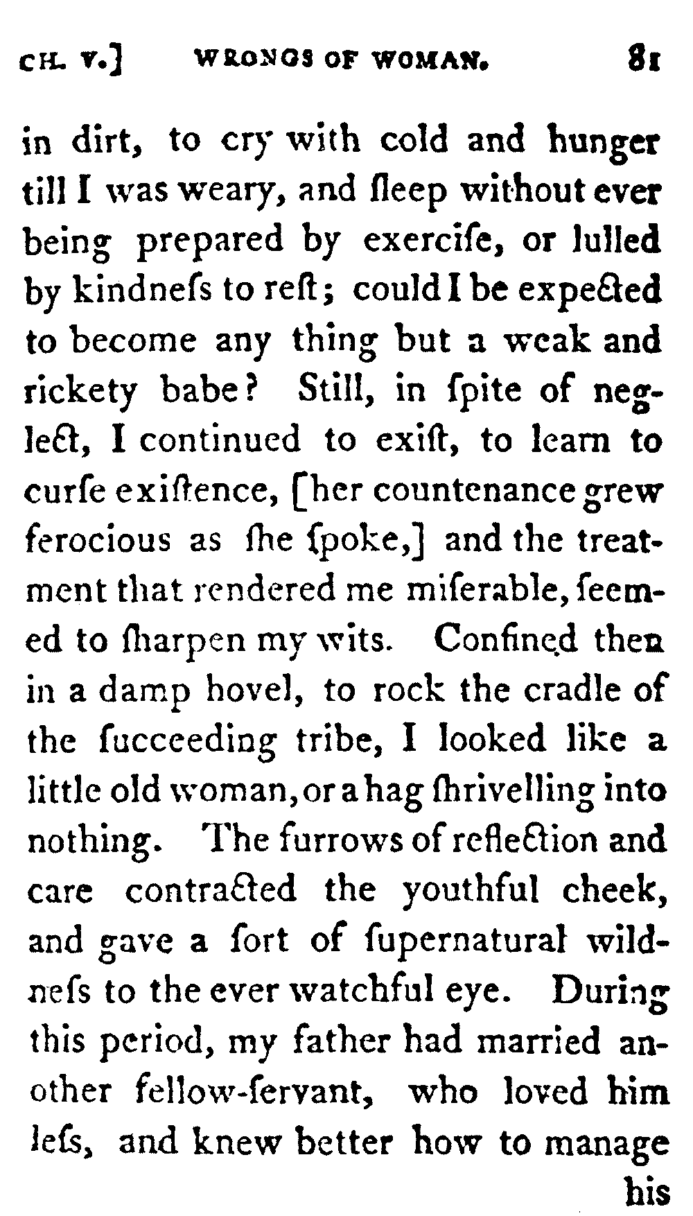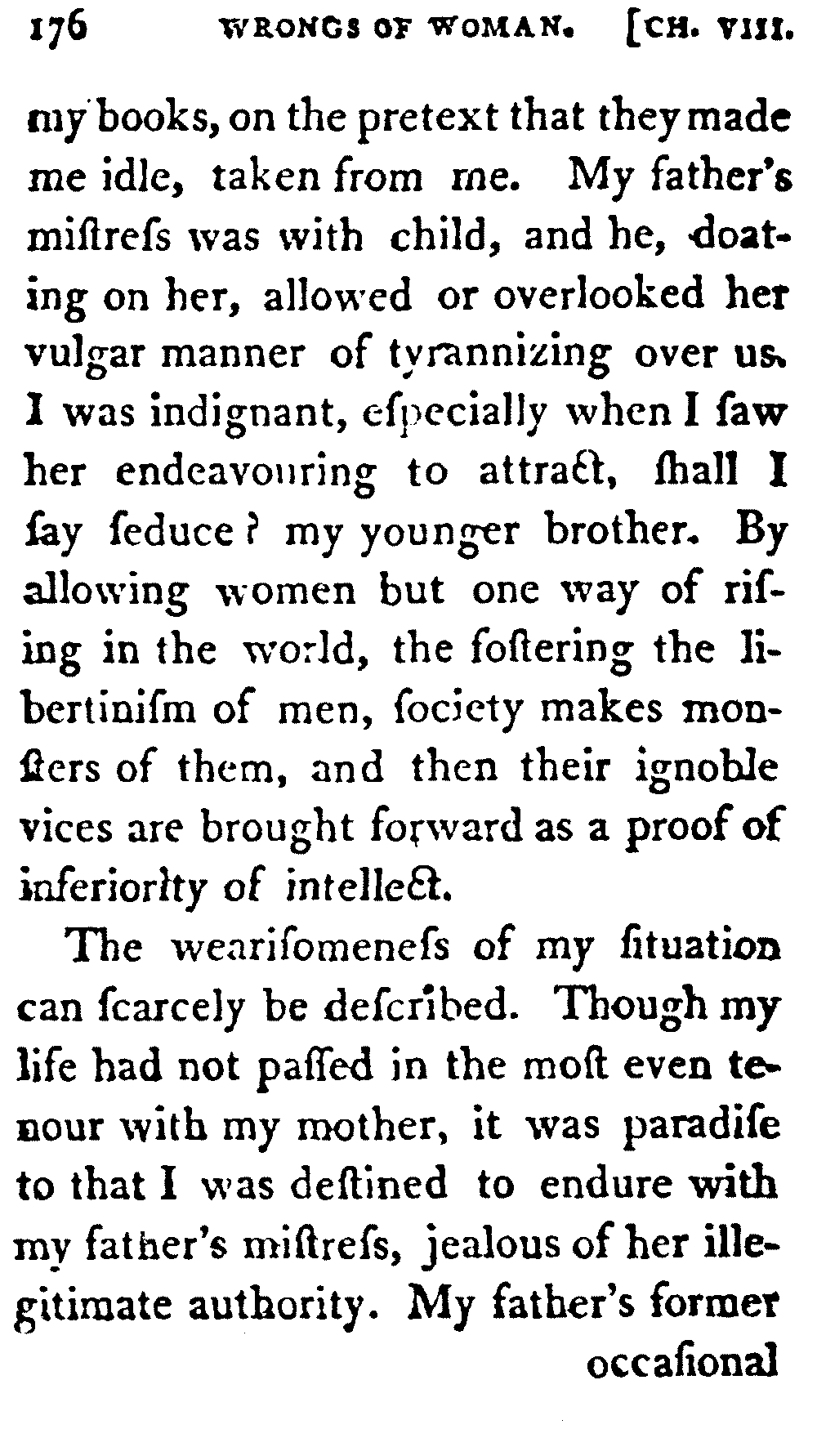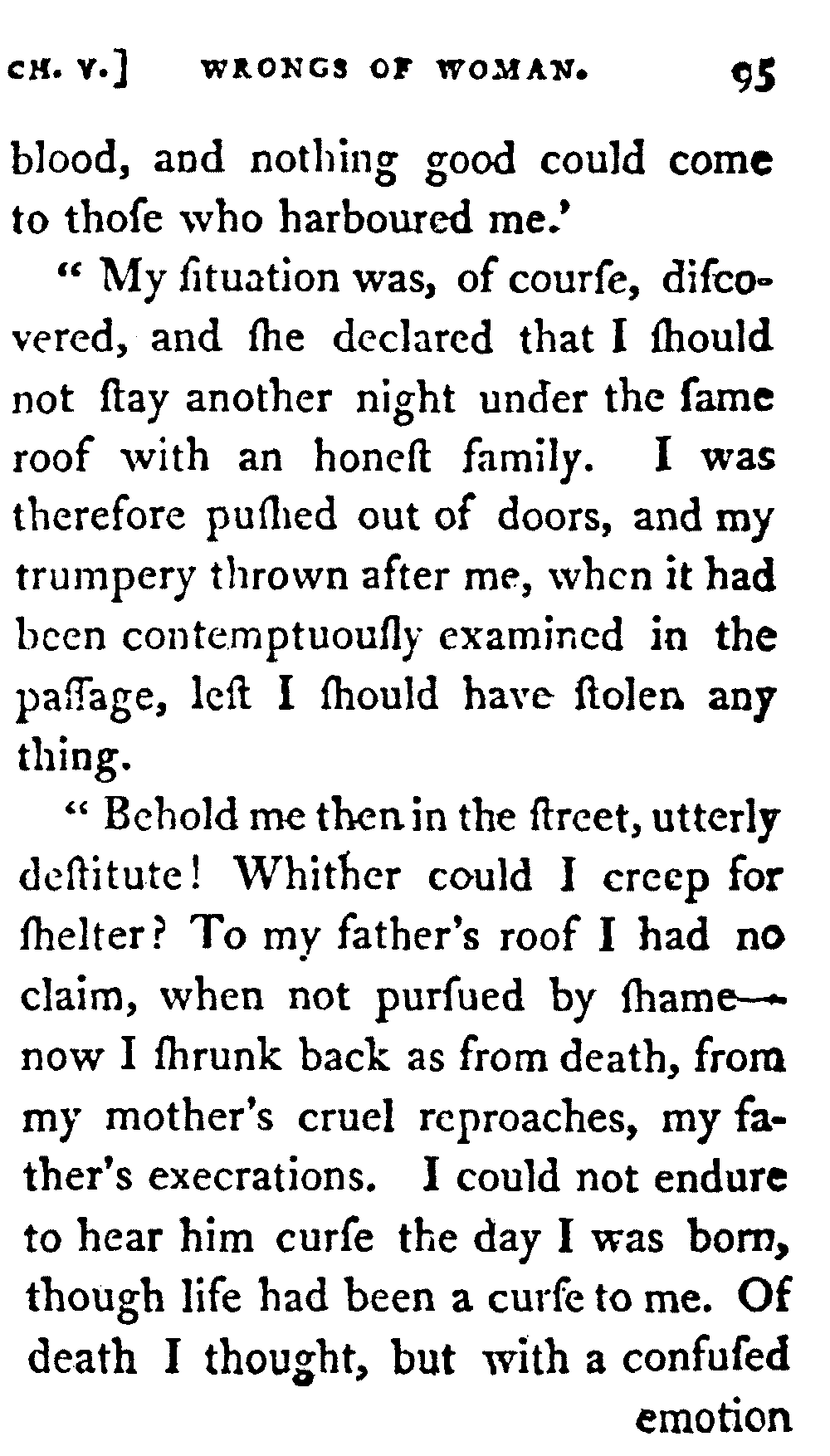 These appear to me (matrimonial despotism of heart and conduct) to be the peculiar Wrongs of Woman, be[xvii]cause they degrade the mind. What are termed great misfortunes, may more forcibly impress the mind of common readers; they have more of what may justly be termed stage-effect; but it is the delineation of finer sensations, which, in my opinion, constitutes the merit of our best novels. This is what I have in view; and to show the wrongs of different classes of women, equally oppressive, though, from the difference of education, necessarily various.