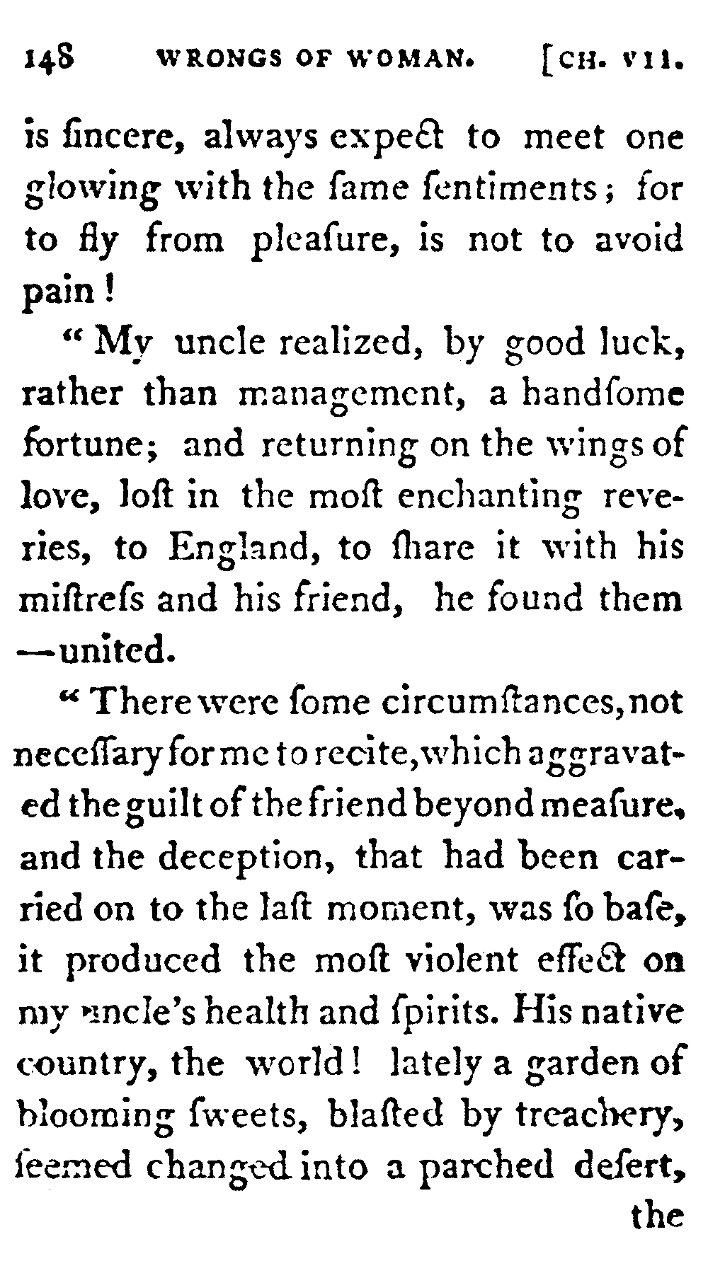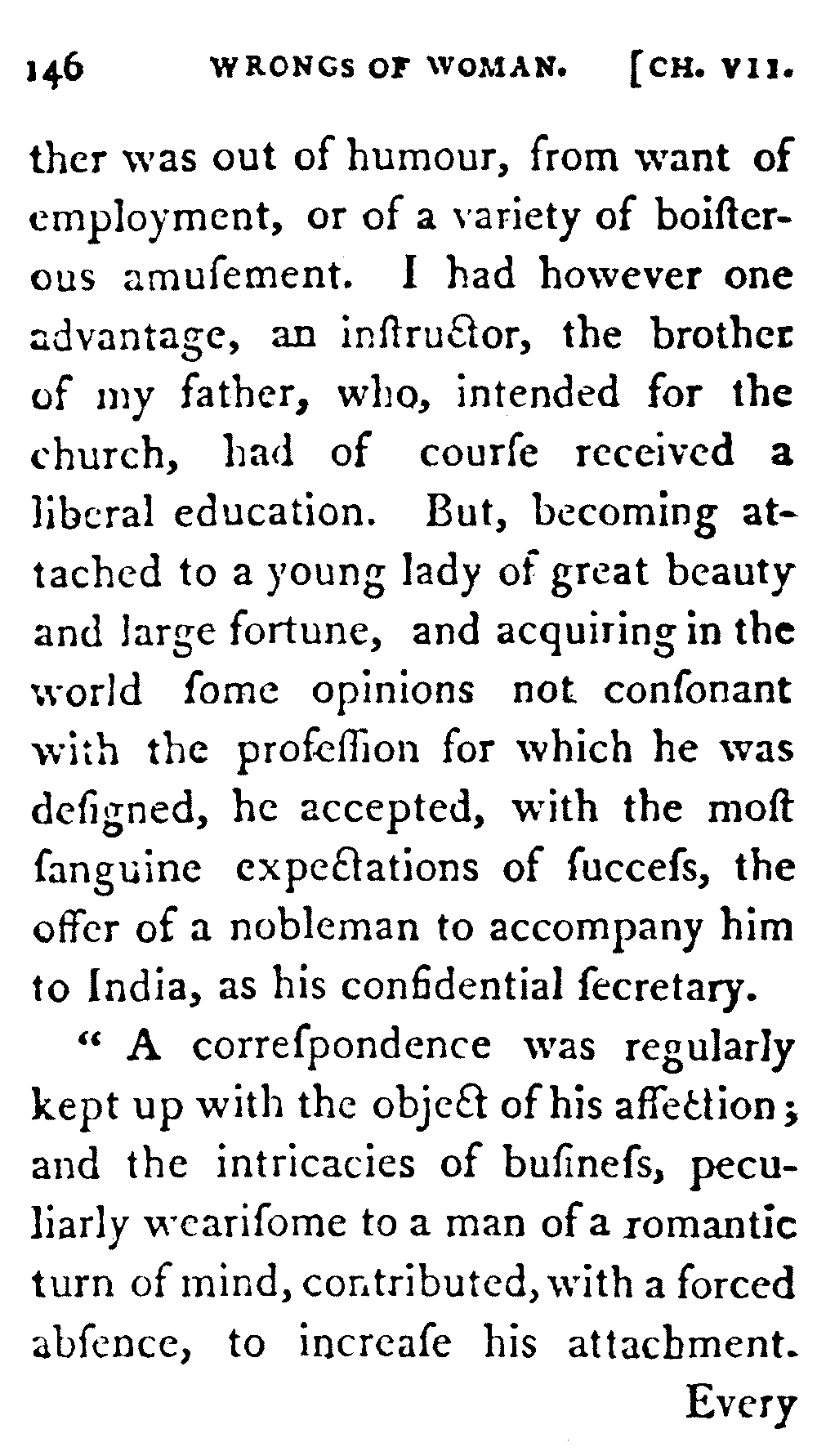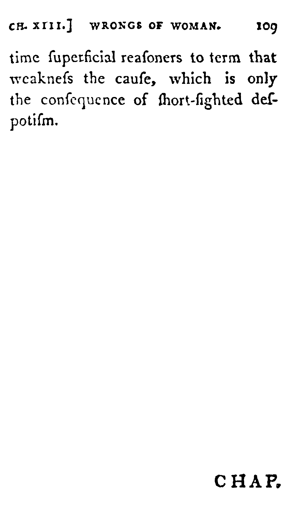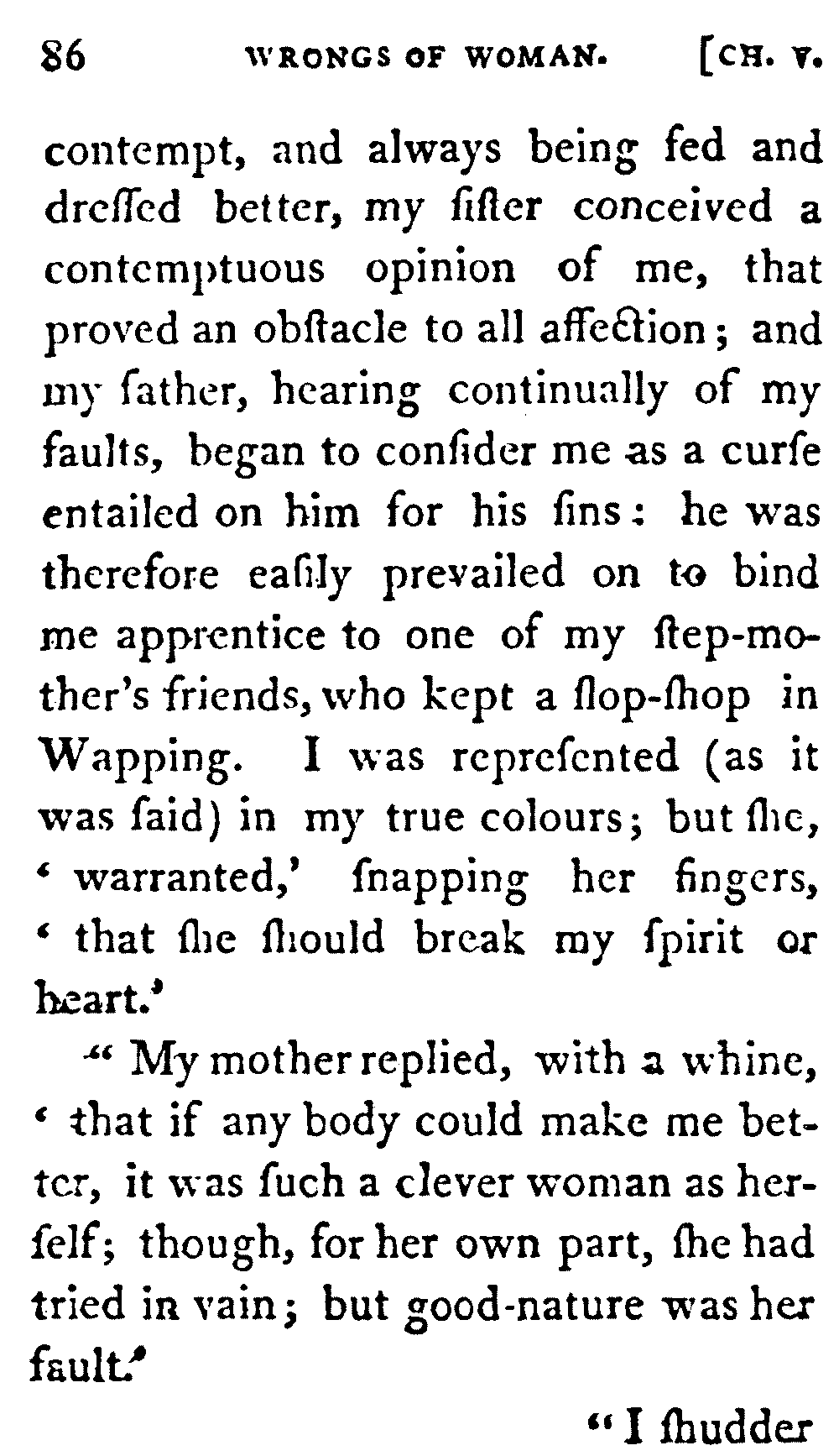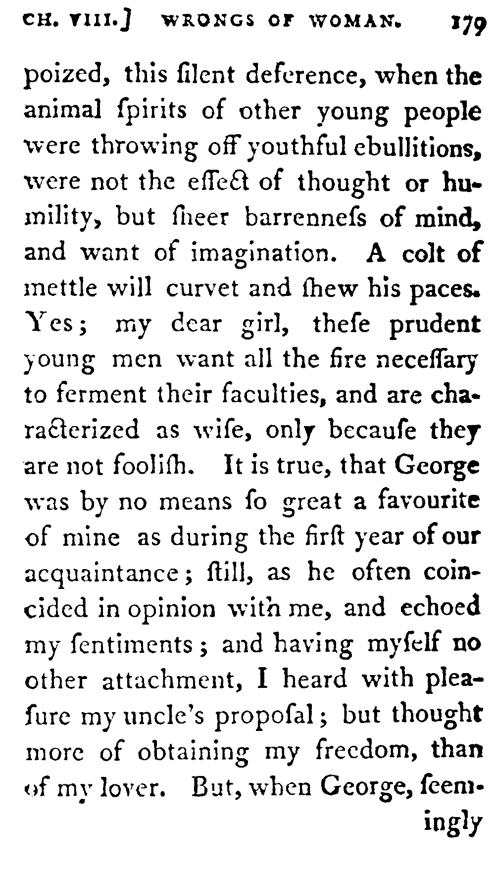 These appear to me (matrimonial despotism of heart and conduct) to be the peculiar Wrongs of Woman, be[xvii]cause they degrade the mind. What are termed great misfortunes, may more forcibly impress the mind of common readers; they have more of what may justly be termed stage-effect; but it is the delineation of finer sensations, which, in my opinion, constitutes the merit of our best novels. This is what I have in view; and to show the wrongs of different classes of women, equally oppressive, though, from the difference of education, necessarily various.