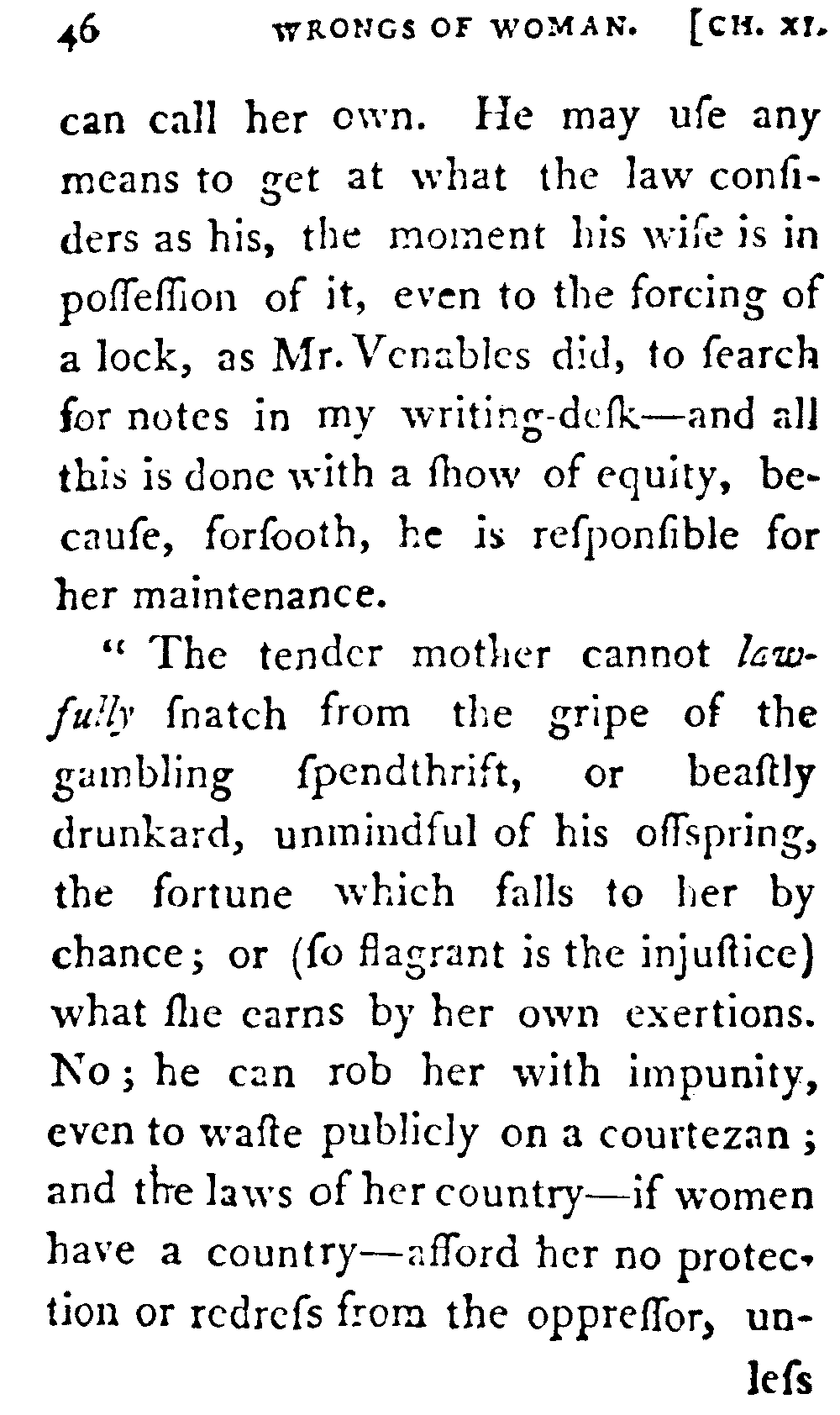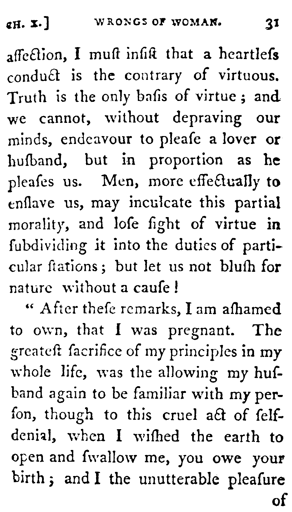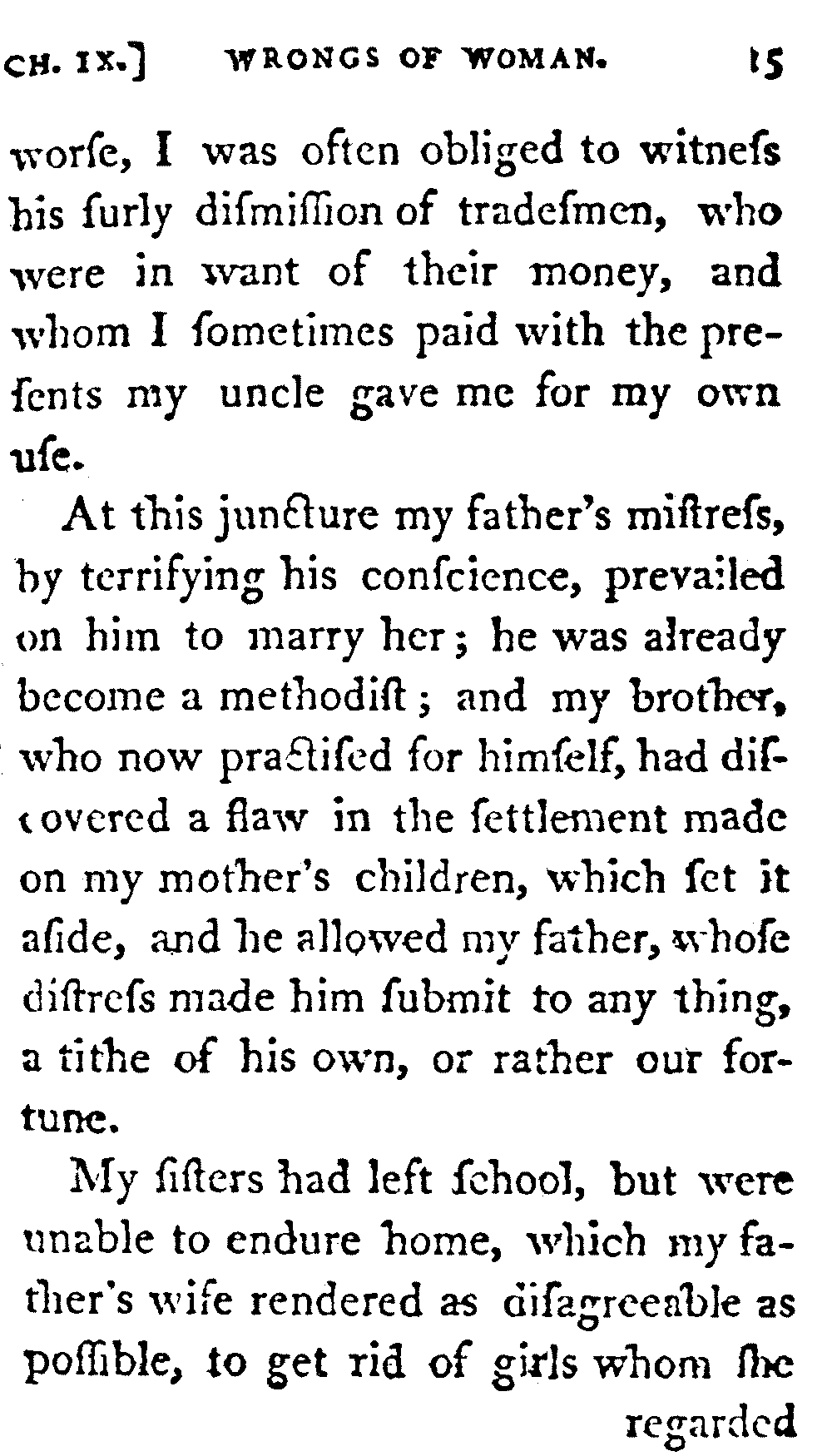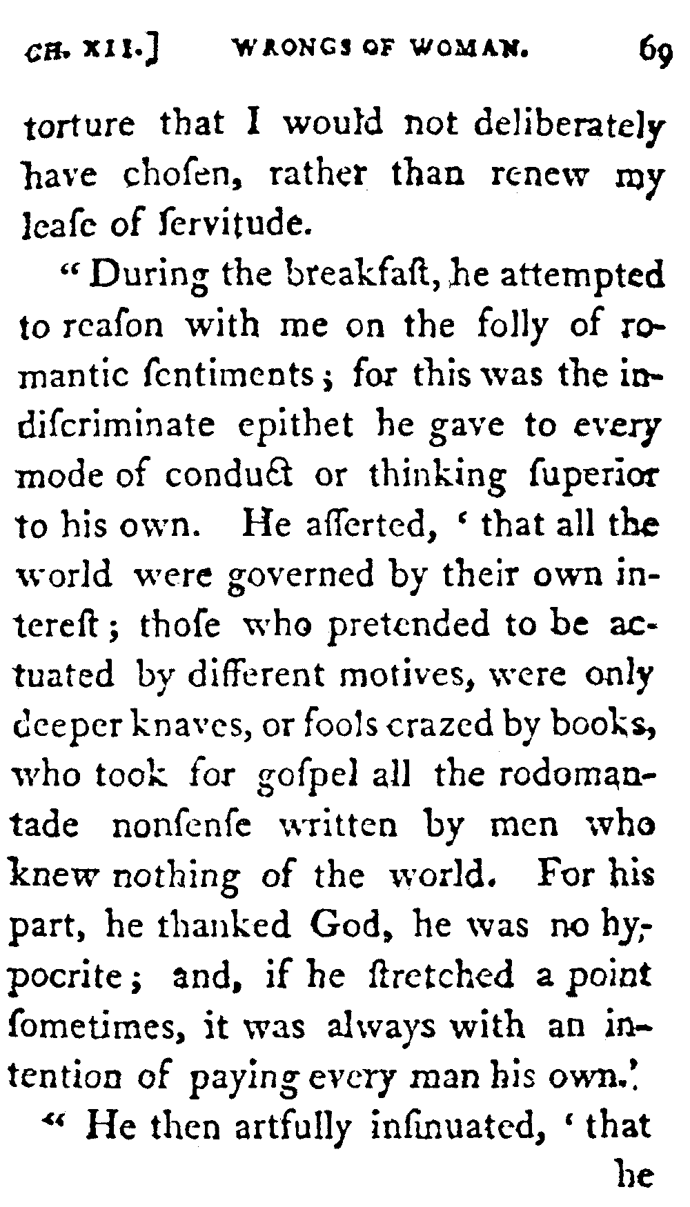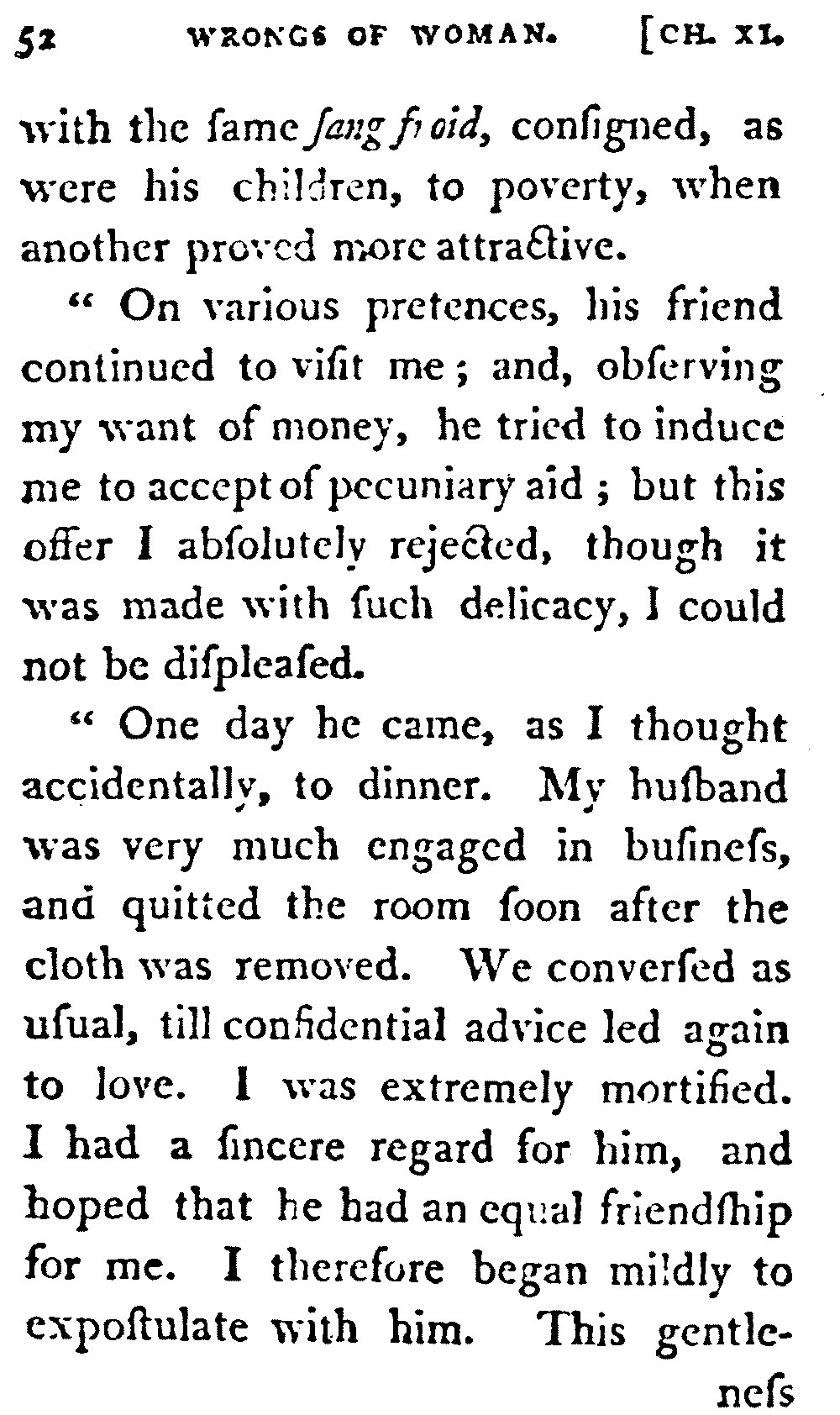 These appear to me (matrimonial despotism of heart and conduct) to be the peculiar Wrongs of Woman, be[xvii]cause they degrade the mind. What are termed great misfortunes, may more forcibly impress the mind of common readers; they have more of what may justly be termed stage-effect; but it is the delineation of finer sensations, which, in my opinion, constitutes the merit of our best novels. This is what I have in view; and to show the wrongs of different classes of women, equally oppressive, though, from the difference of education, necessarily various.