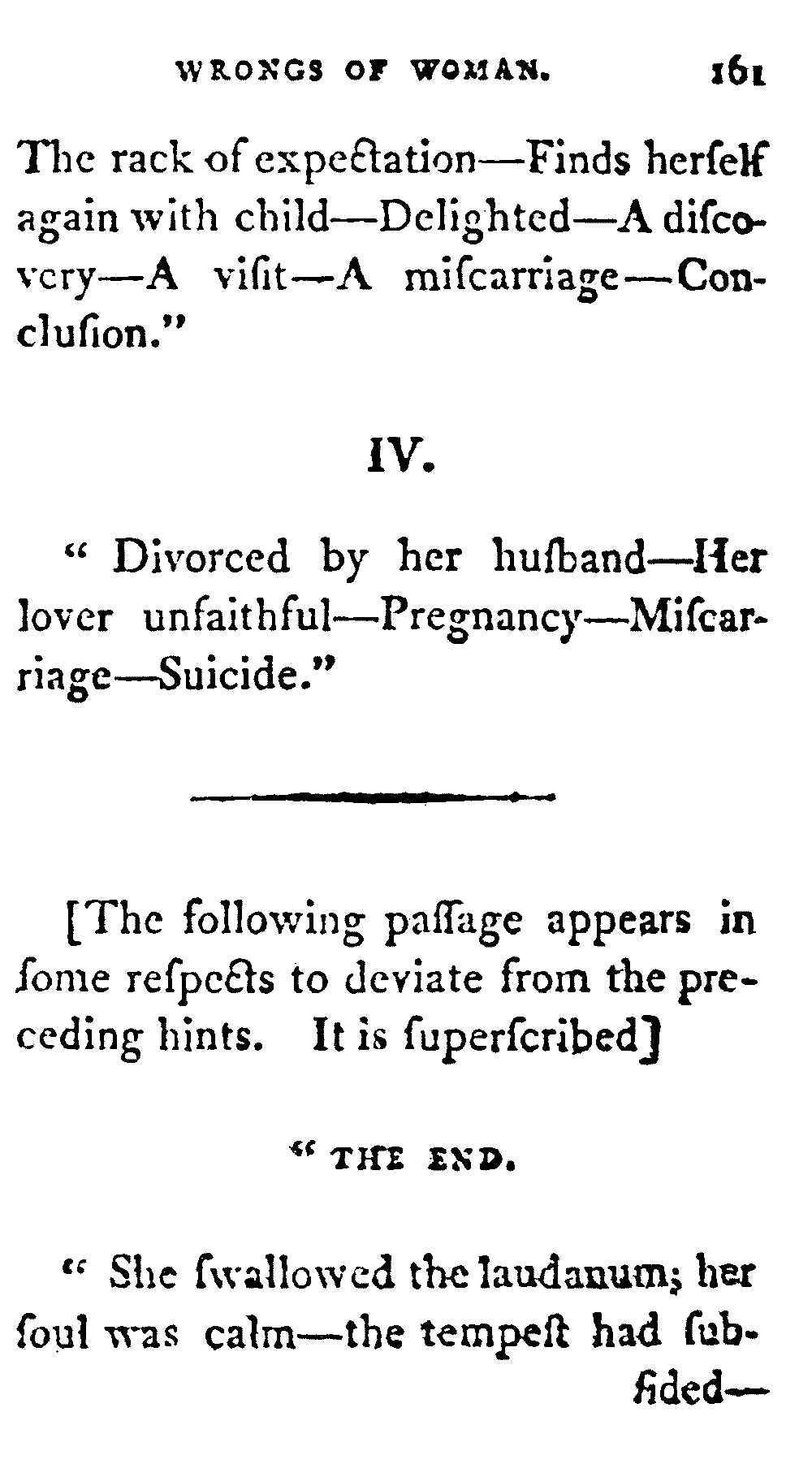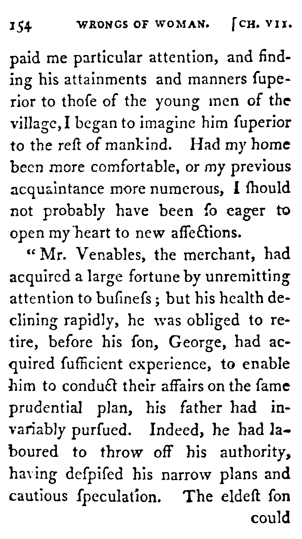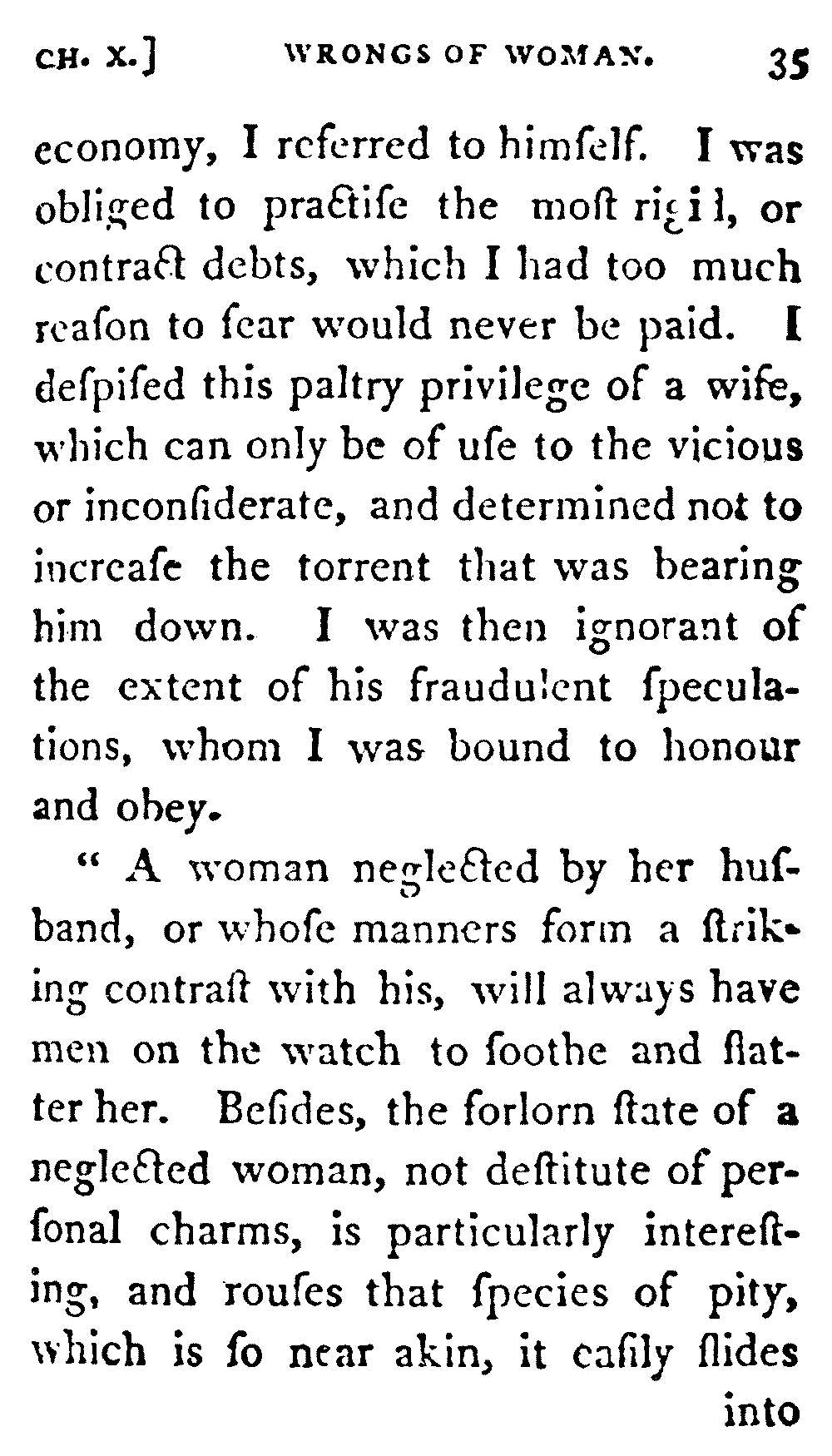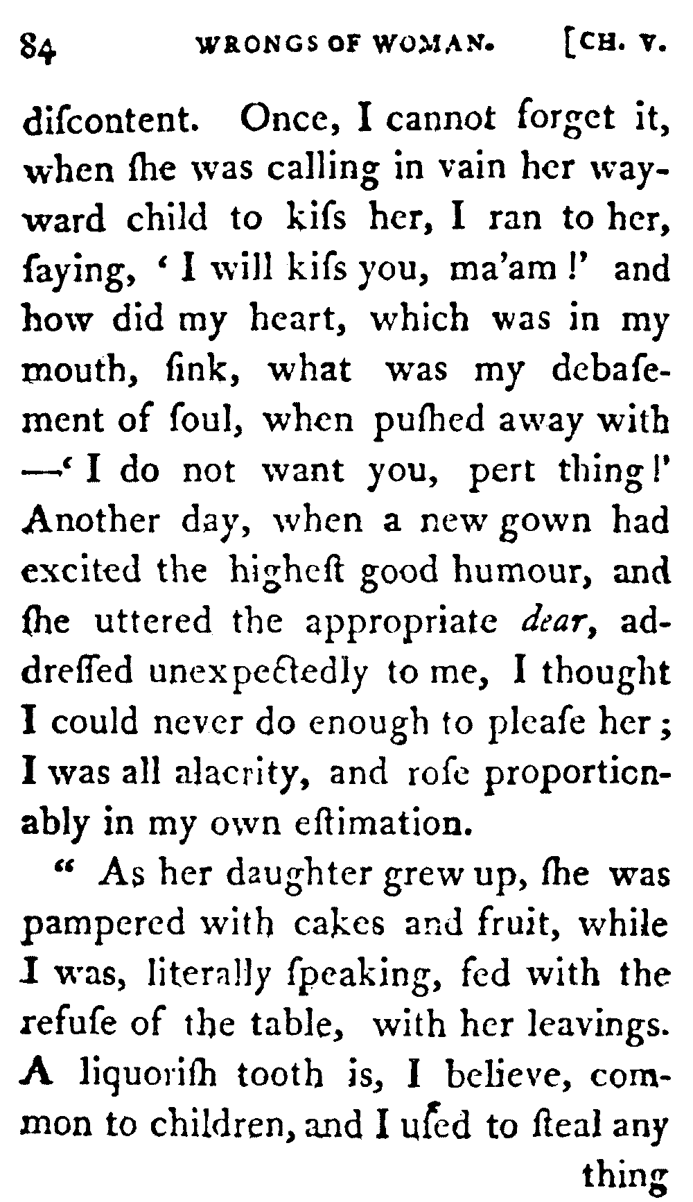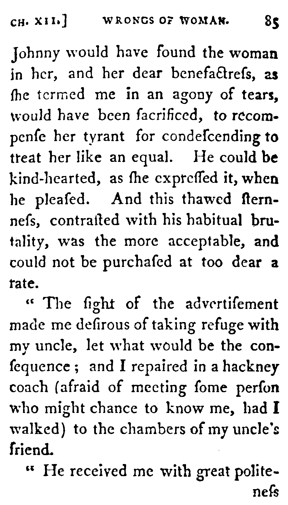 These appear to me (matrimonial despotism of heart and conduct) to be the peculiar Wrongs of Woman, be[xvii]cause they degrade the mind. What are termed great misfortunes, may more forcibly impress the mind of common readers; they have more of what may justly be termed stage-effect; but it is the delineation of finer sensations, which, in my opinion, constitutes the merit of our best novels. This is what I have in view; and to show the wrongs of different classes of women, equally oppressive, though, from the difference of education, necessarily various.