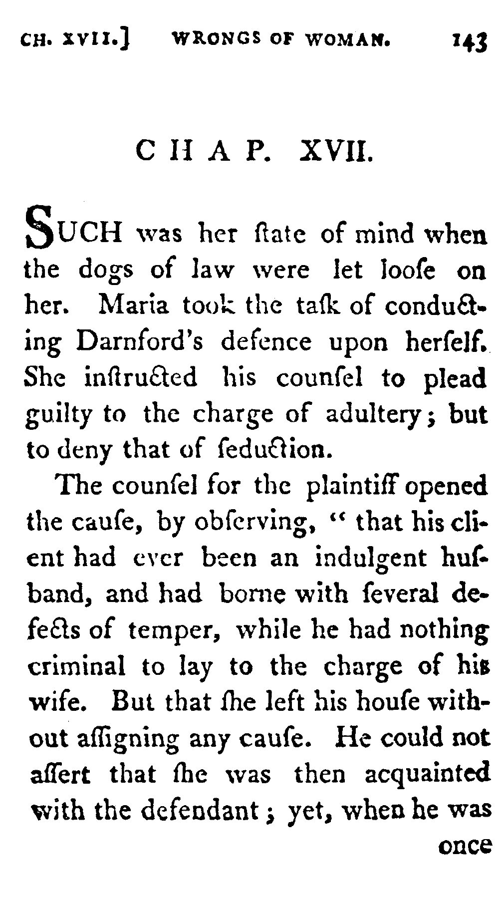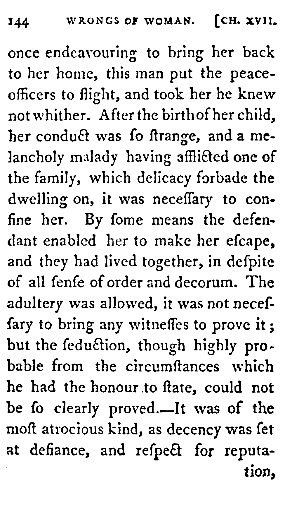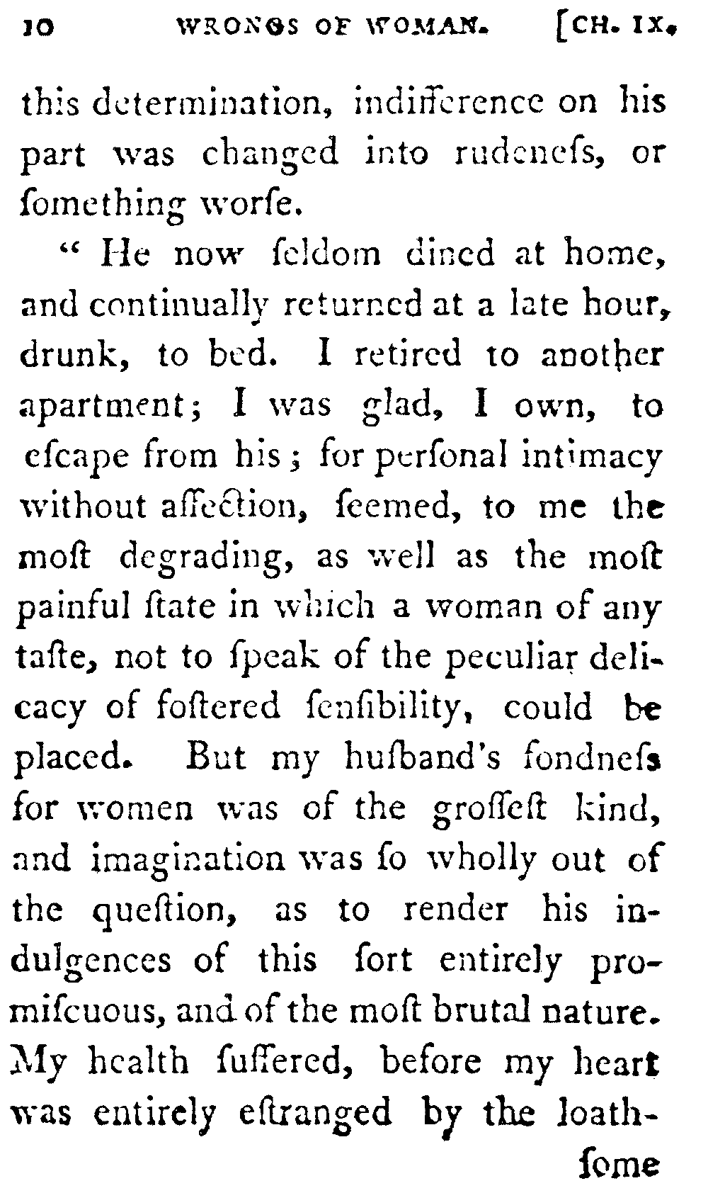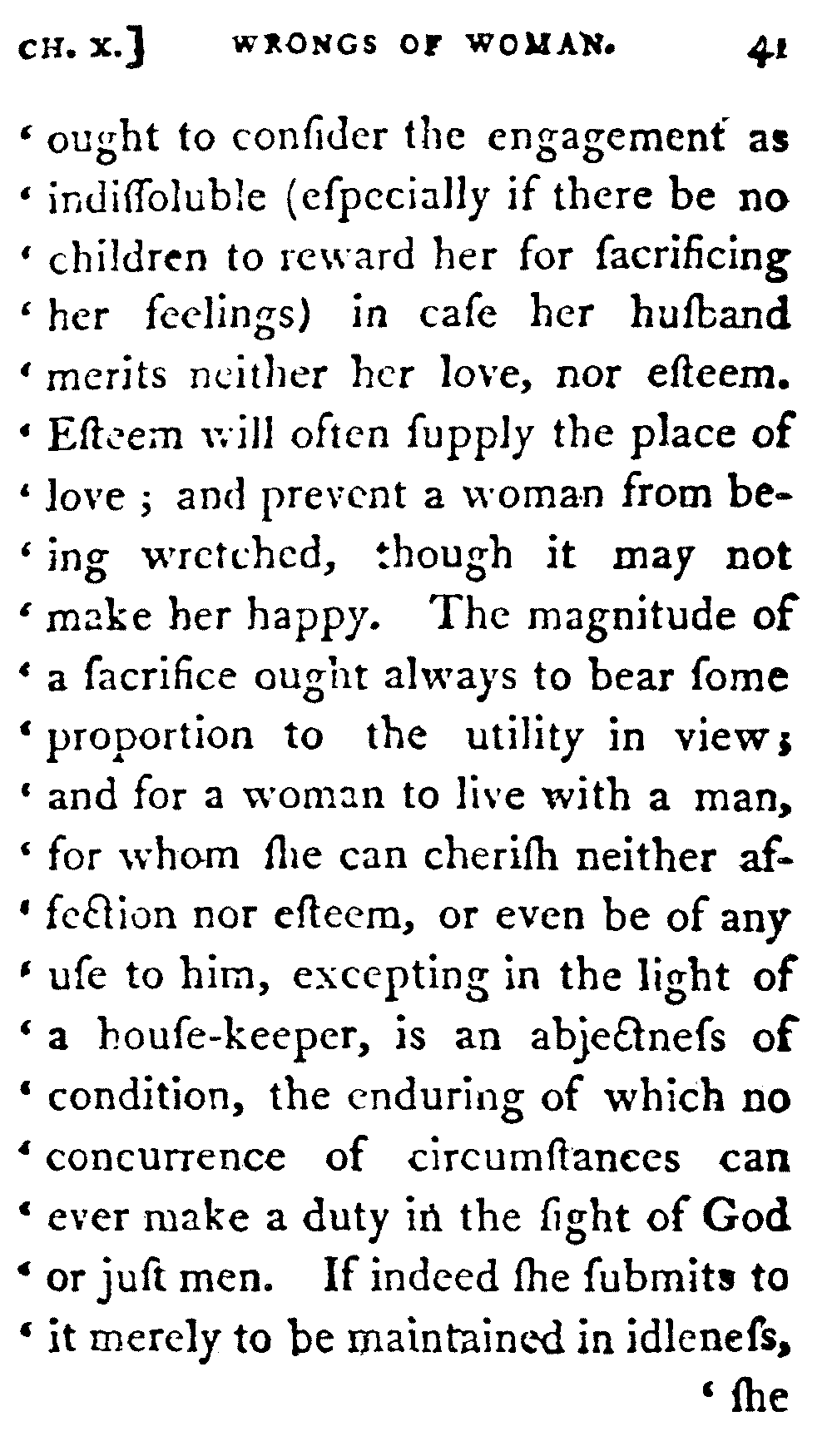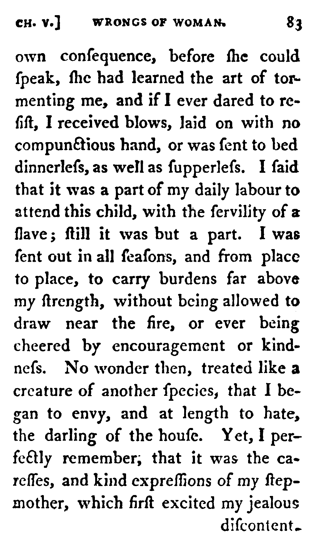 These appear to me (matrimonial despotism of heart and conduct) to be the peculiar Wrongs of Woman, be[xvii]cause they degrade the mind. What are termed great misfortunes, may more forcibly impress the mind of common readers; they have more of what may justly be termed stage-effect; but it is the delineation of finer sensations, which, in my opinion, constitutes the merit of our best novels. This is what I have in view; and to show the wrongs of different classes of women, equally oppressive, though, from the difference of education, necessarily various.