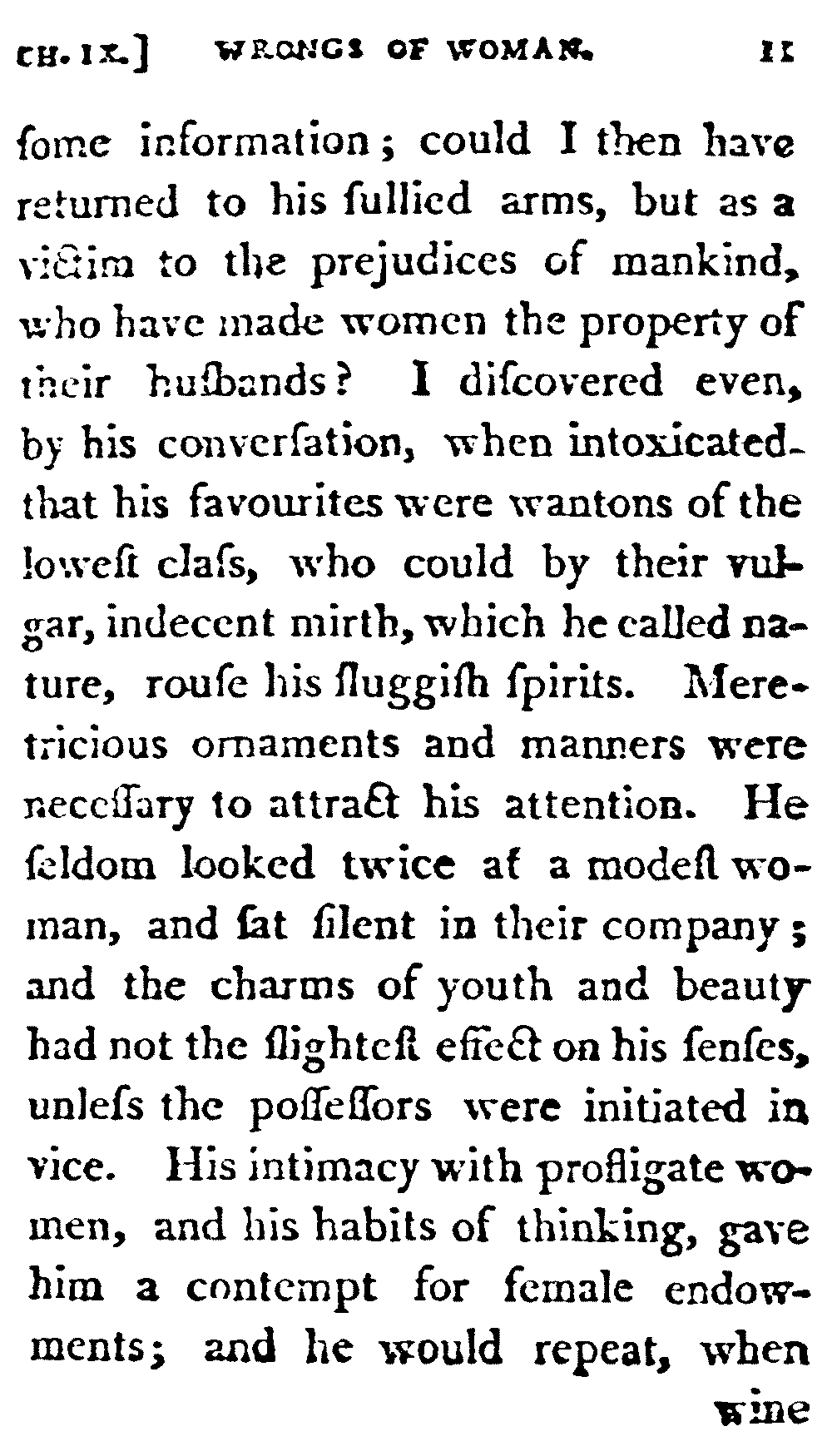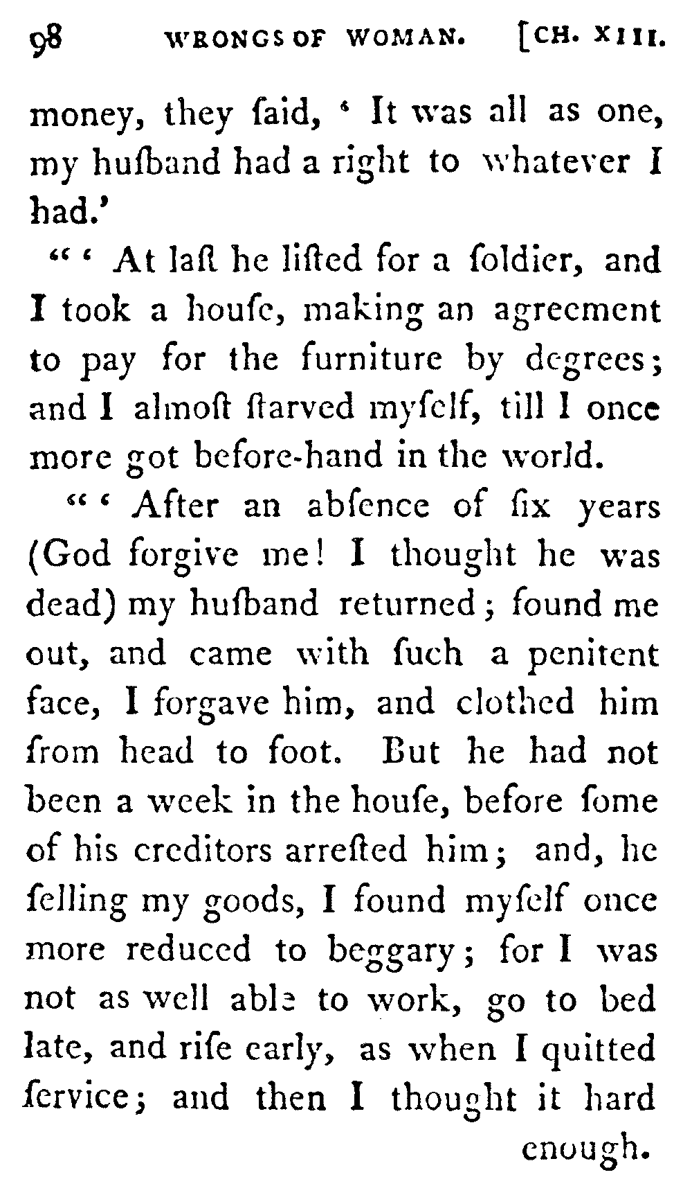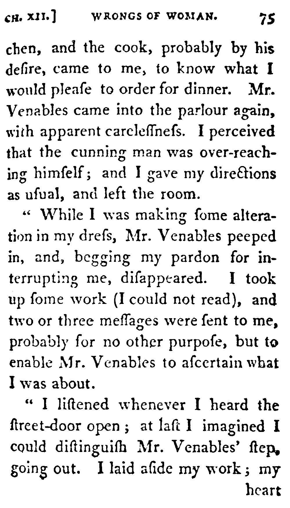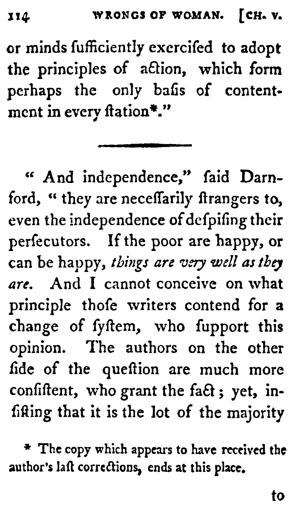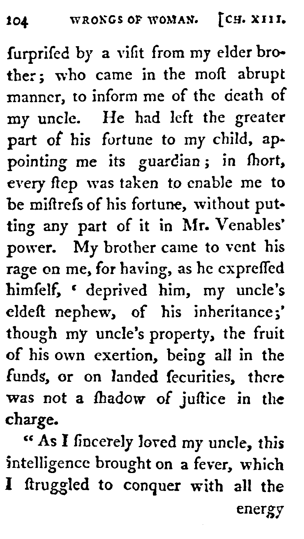 These appear to me (matrimonial despotism of heart and conduct) to be the peculiar Wrongs of Woman, be[xvii]cause they degrade the mind. What are termed great misfortunes, may more forcibly impress the mind of common readers; they have more of what may justly be termed stage-effect; but it is the delineation of finer sensations, which, in my opinion, constitutes the merit of our best novels. This is what I have in view; and to show the wrongs of different classes of women, equally oppressive, though, from the difference of education, necessarily various.