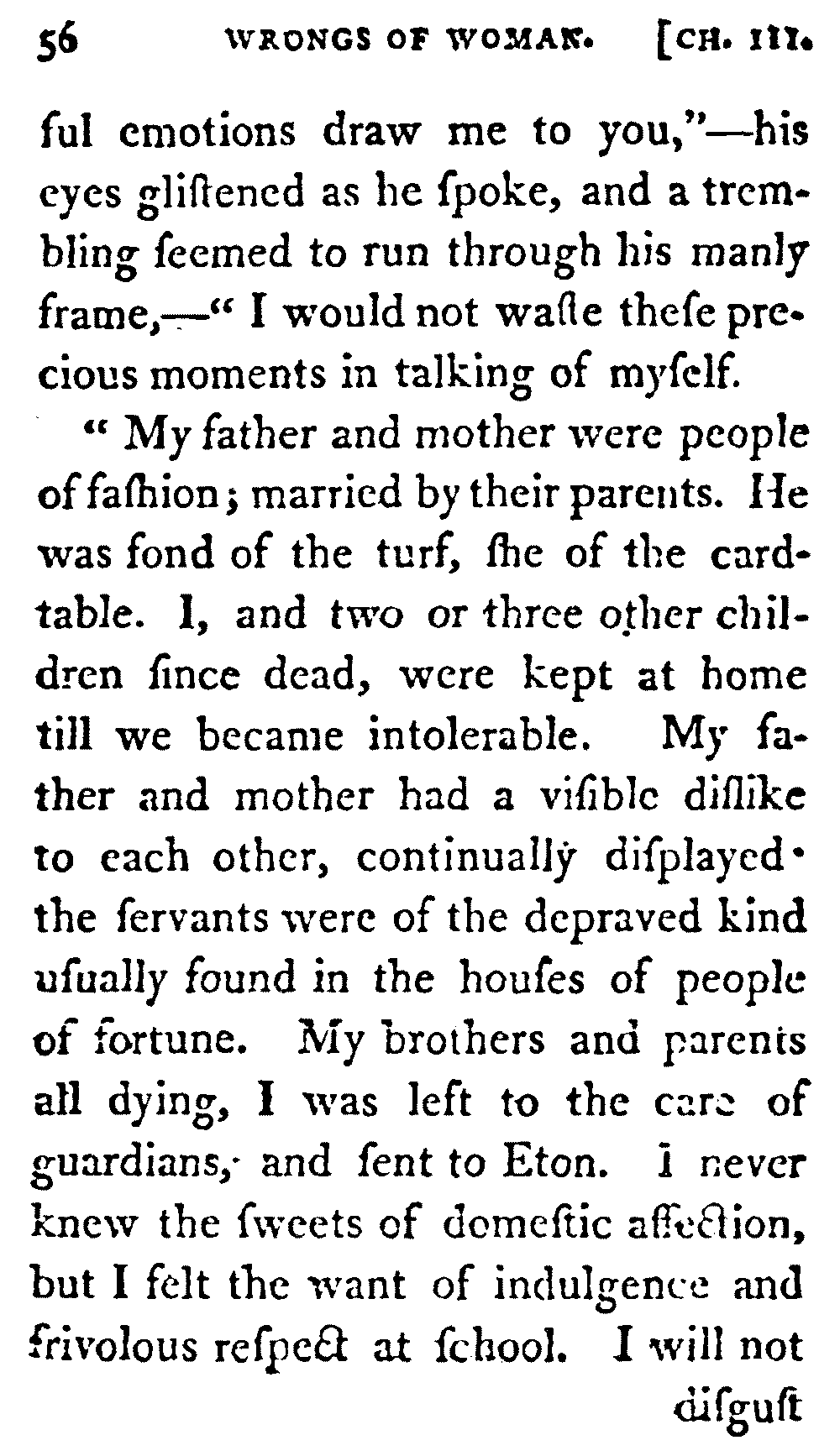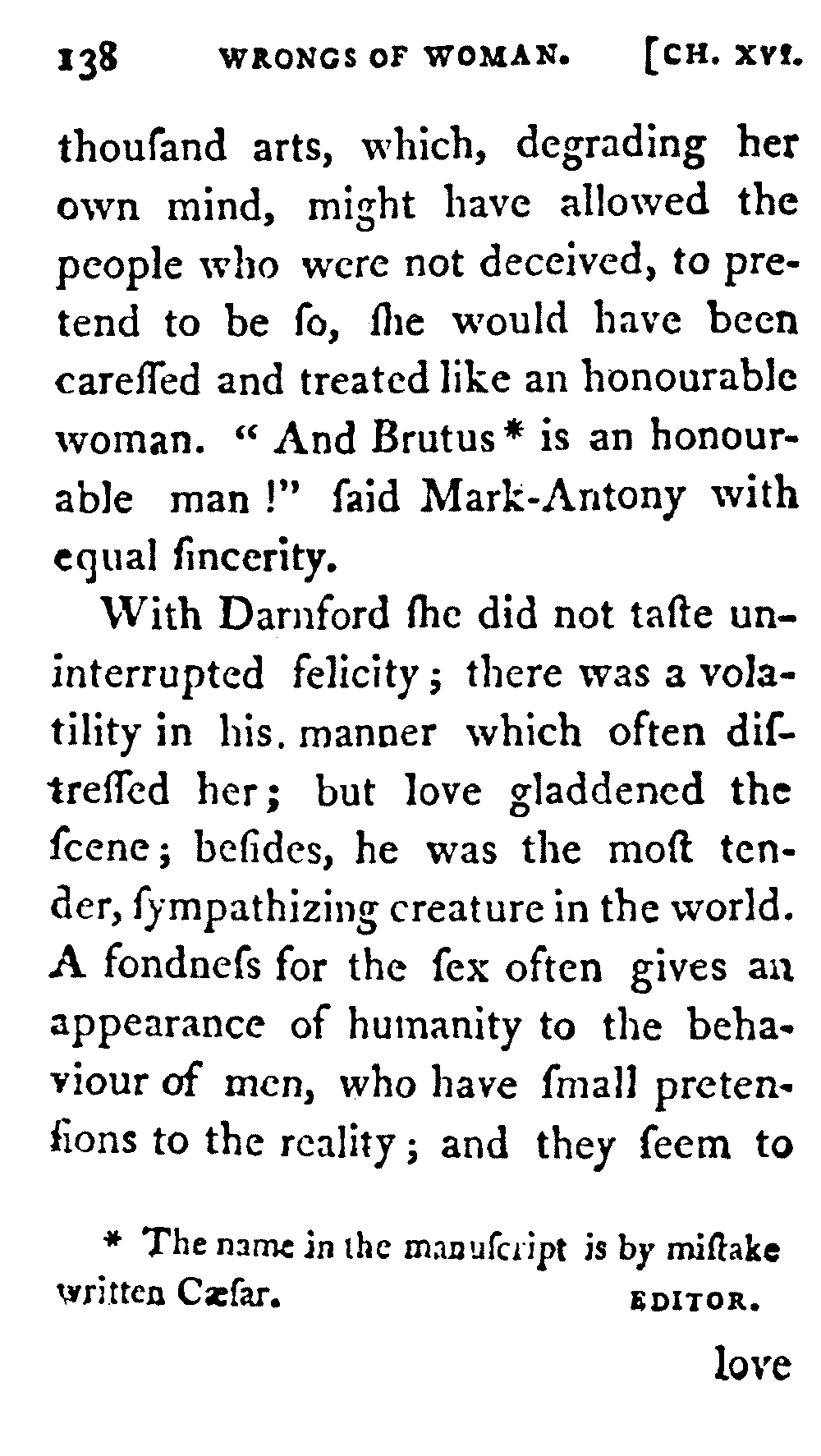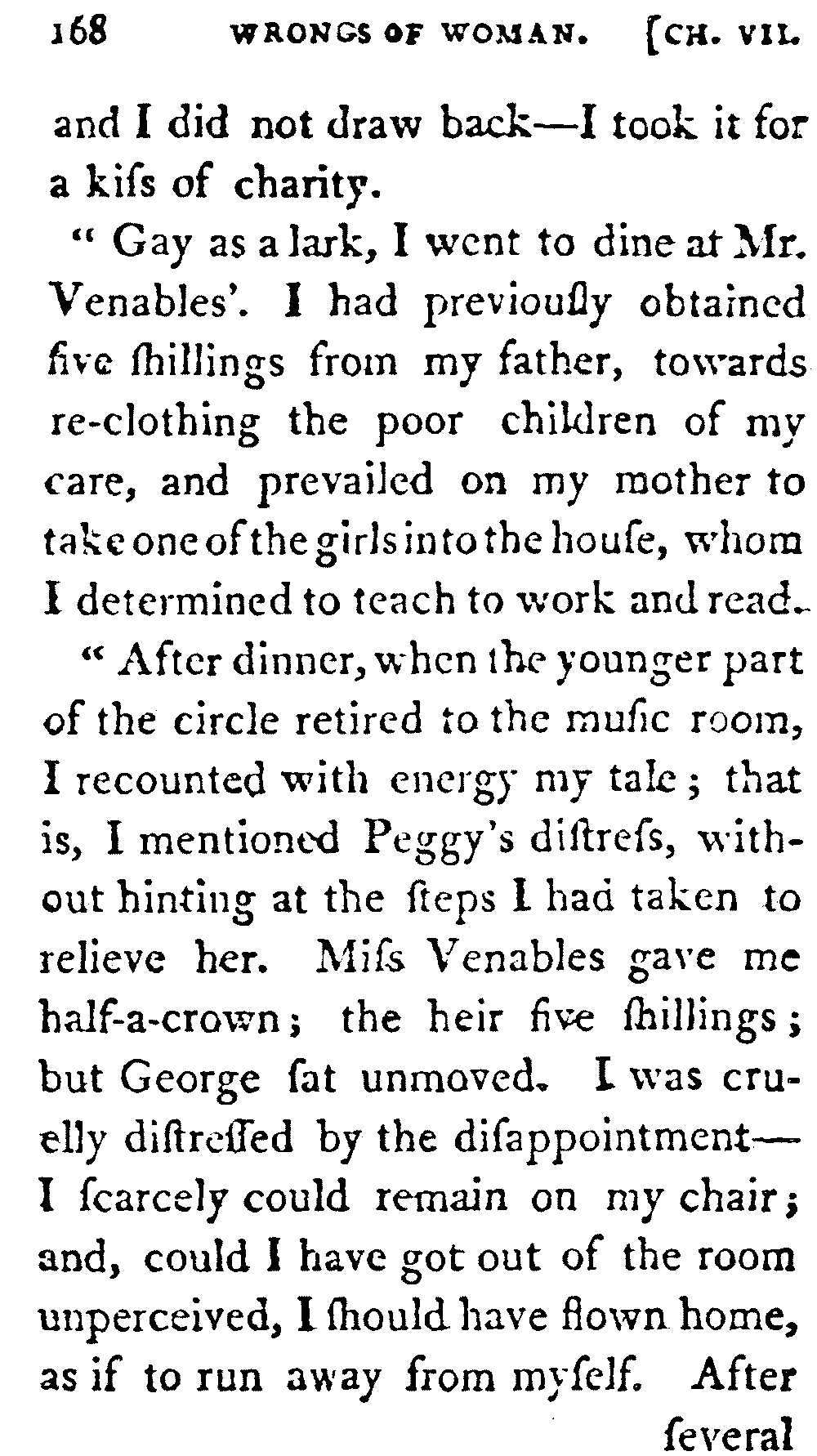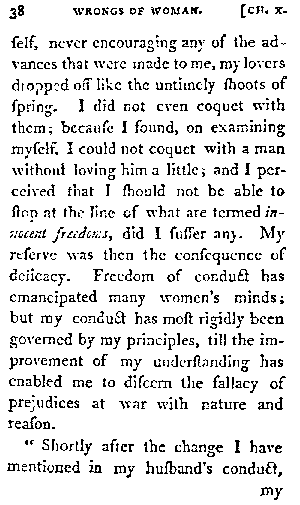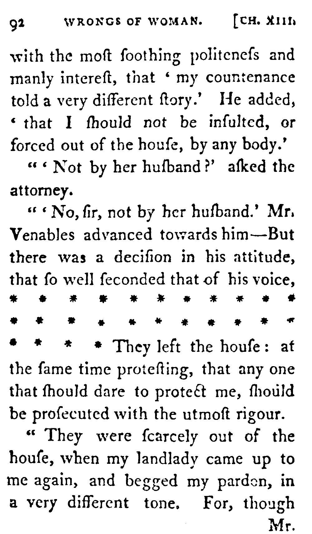 These appear to me (matrimonial despotism of heart and conduct) to be the peculiar Wrongs of Woman, be[xvii]cause they degrade the mind. What are termed great misfortunes, may more forcibly impress the mind of common readers; they have more of what may justly be termed stage-effect; but it is the delineation of finer sensations, which, in my opinion, constitutes the merit of our best novels. This is what I have in view; and to show the wrongs of different classes of women, equally oppressive, though, from the difference of education, necessarily various.