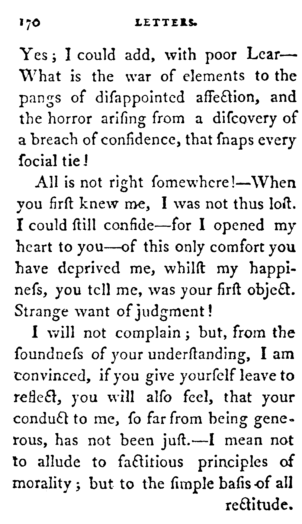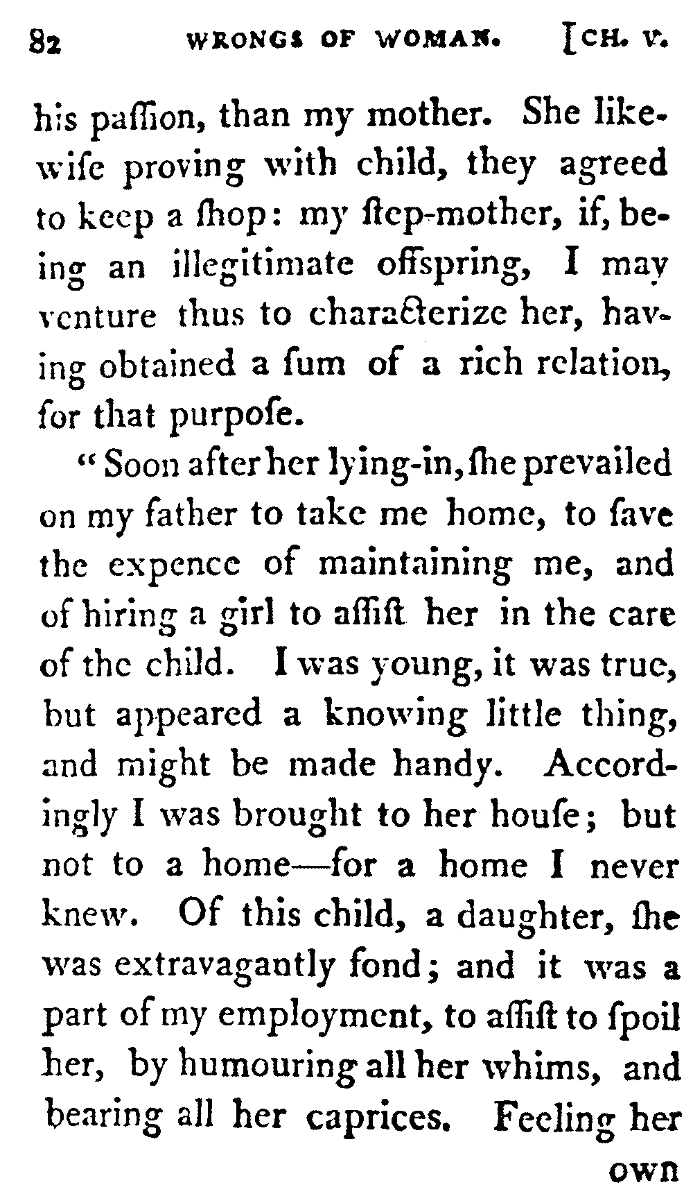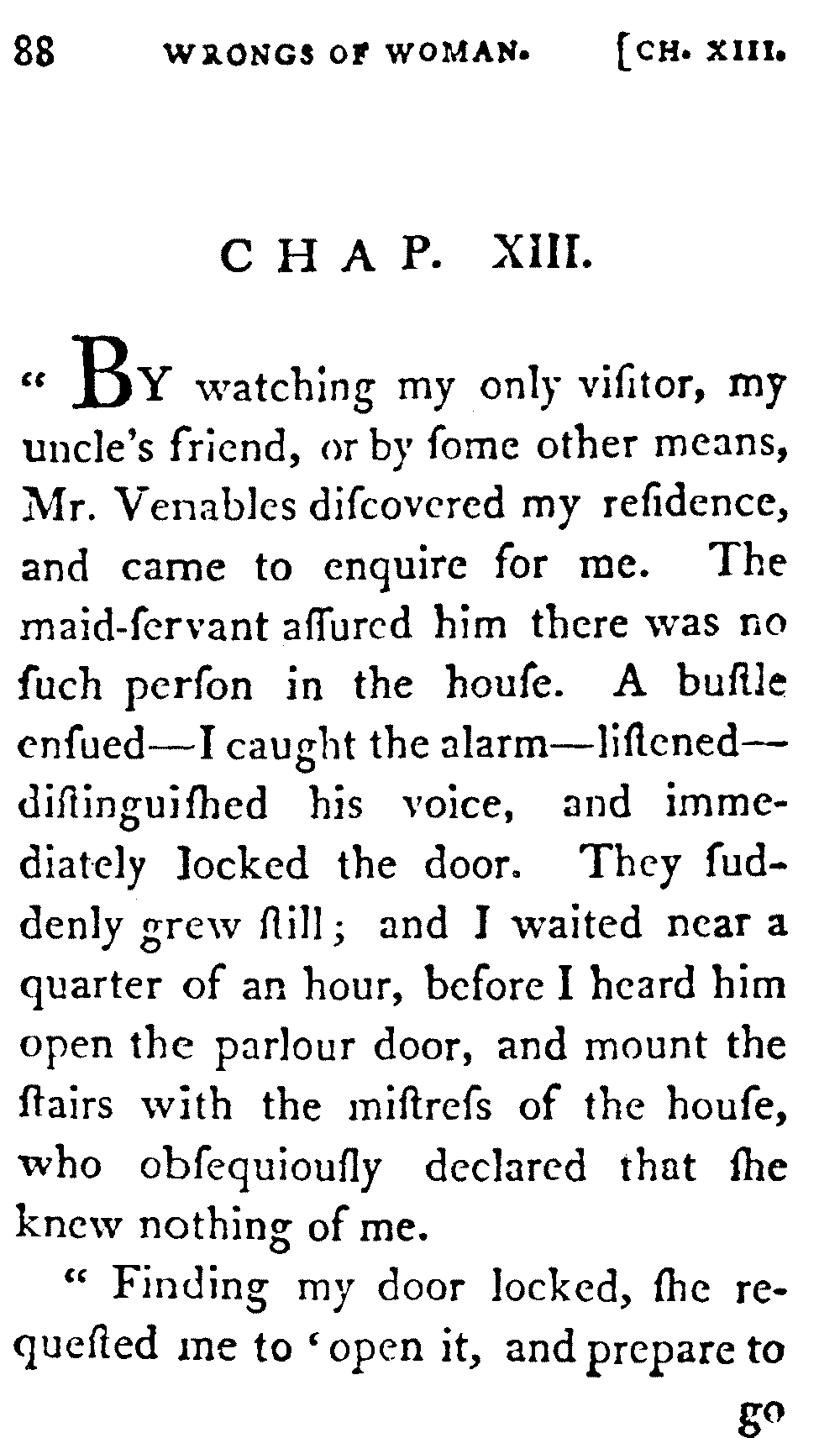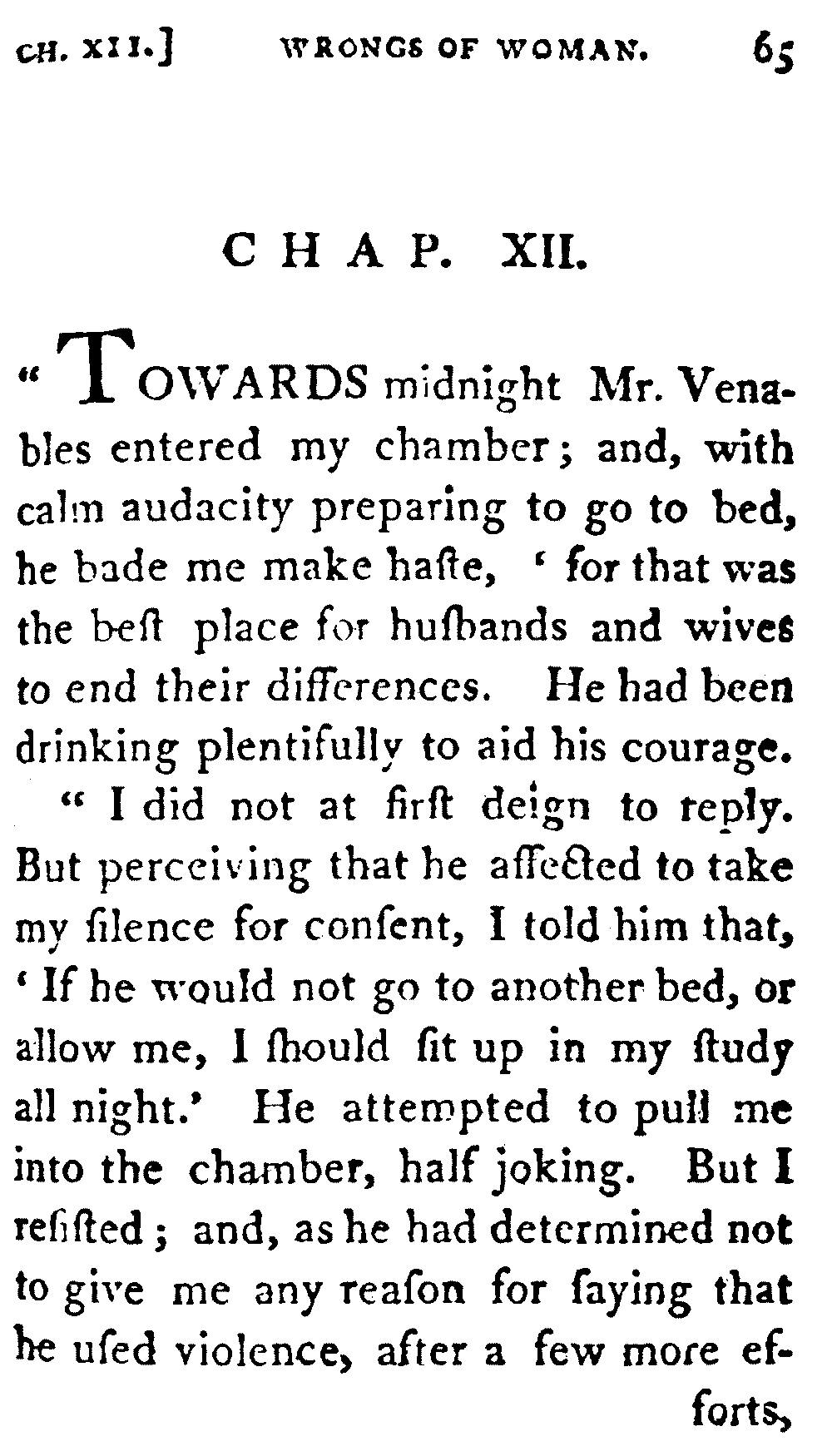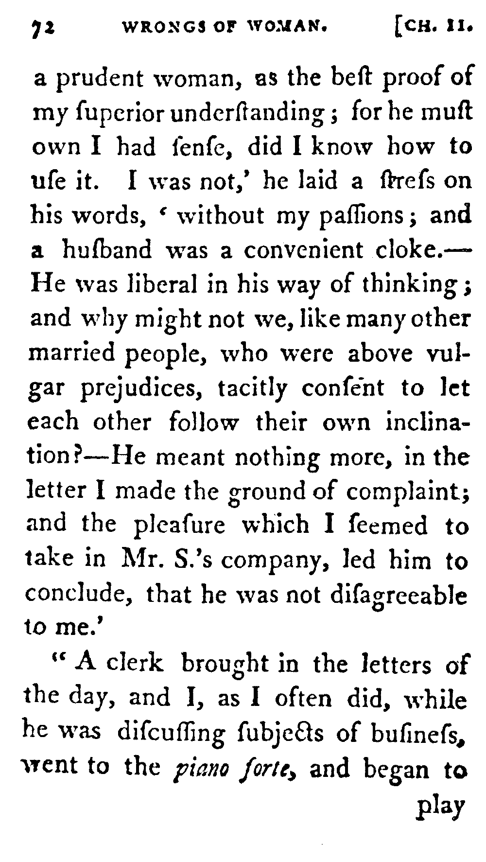 These appear to me (matrimonial despotism of heart and conduct) to be the peculiar Wrongs of Woman, be[xvii]cause they degrade the mind. What are termed great misfortunes, may more forcibly impress the mind of common readers; they have more of what may justly be termed stage-effect; but it is the delineation of finer sensations, which, in my opinion, constitutes the merit of our best novels. This is what I have in view; and to show the wrongs of different classes of women, equally oppressive, though, from the difference of education, necessarily various.
