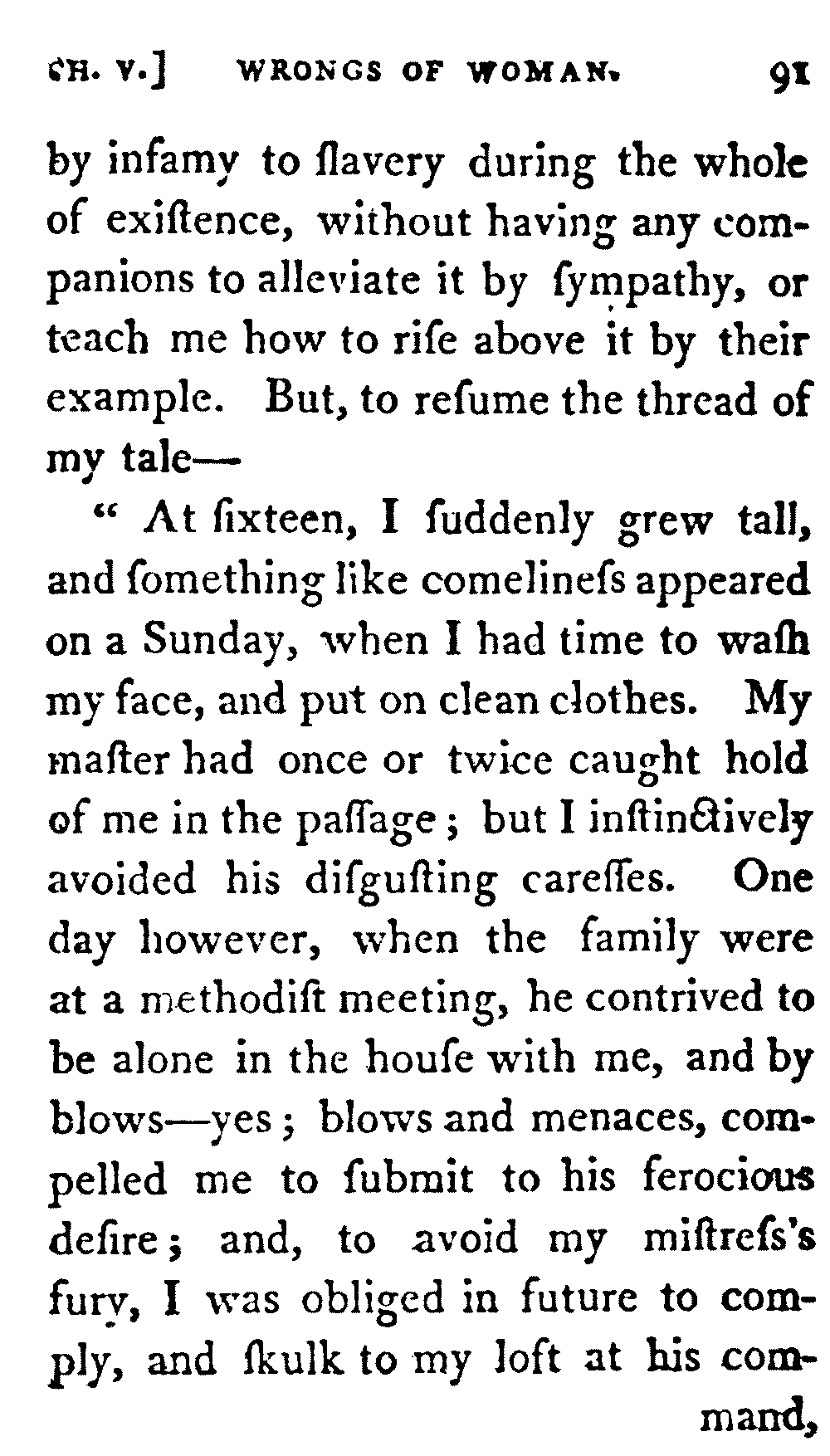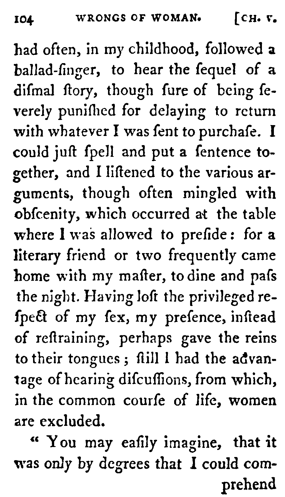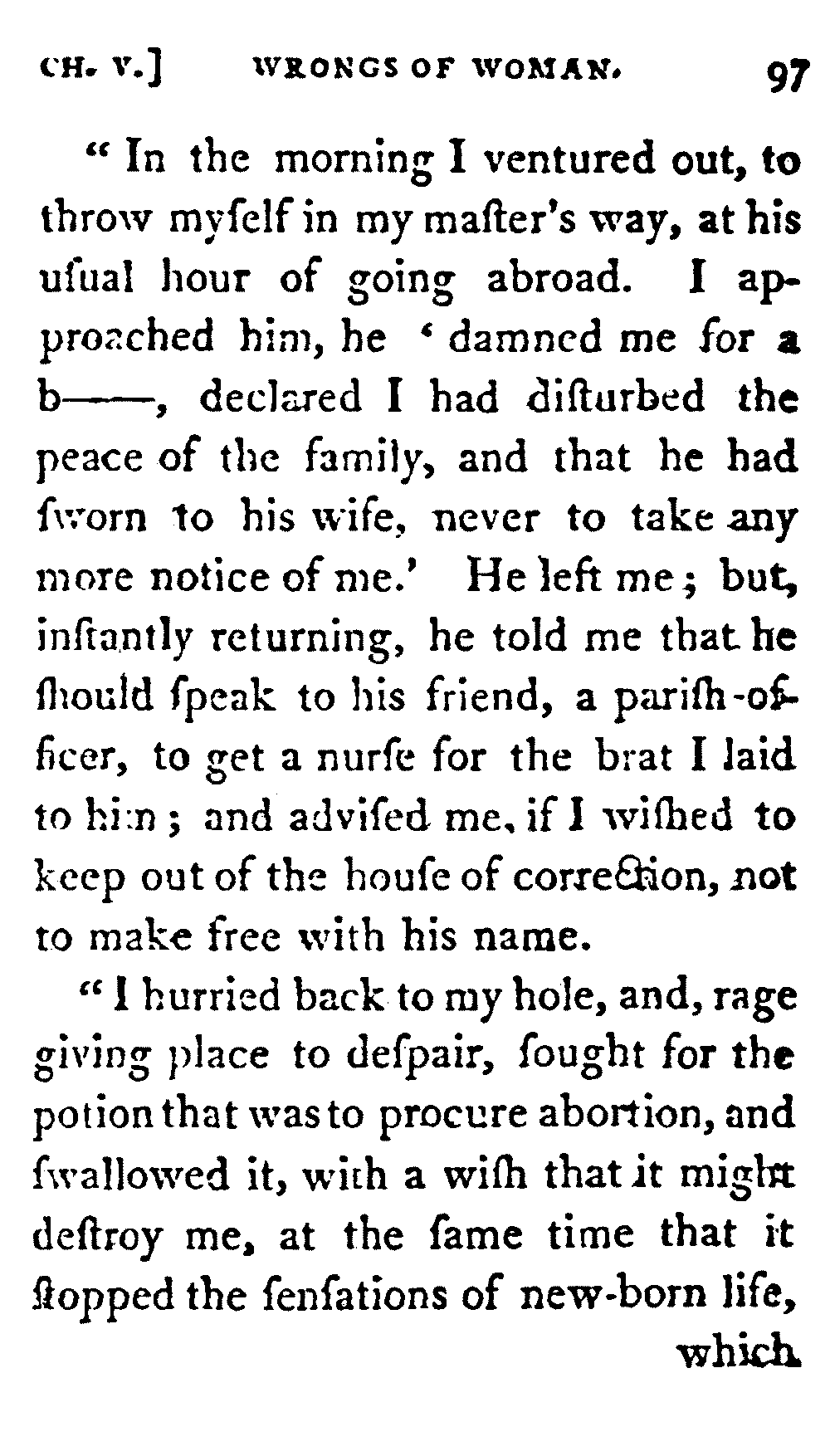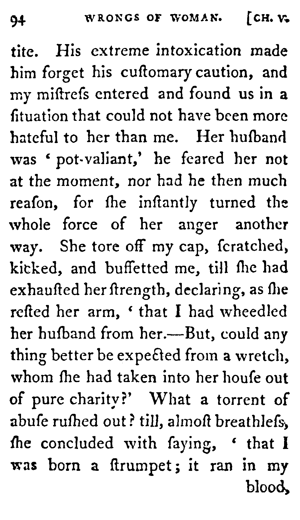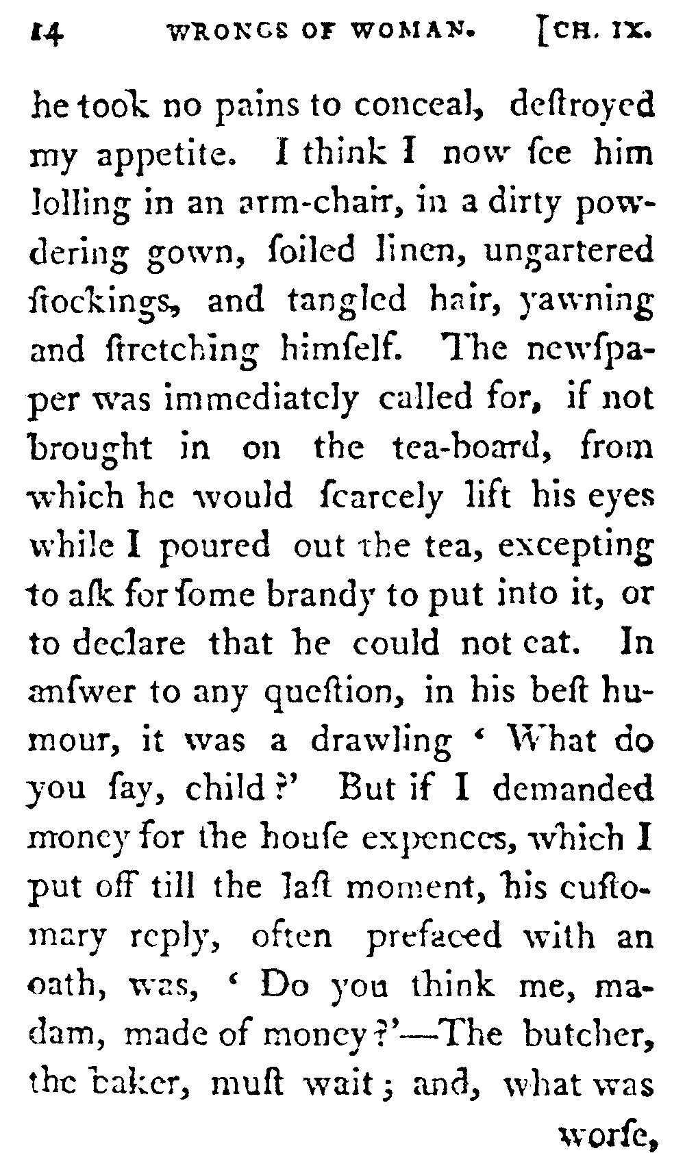 These appear to me (matrimonial despotism of heart and conduct) to be the peculiar Wrongs of Woman, be[xvii]cause they degrade the mind. What are termed great misfortunes, may more forcibly impress the mind of common readers; they have more of what may justly be termed stage-effect; but it is the delineation of finer sensations, which, in my opinion, constitutes the merit of our best novels. This is what I have in view; and to show the wrongs of different classes of women, equally oppressive, though, from the difference of education, necessarily various.
