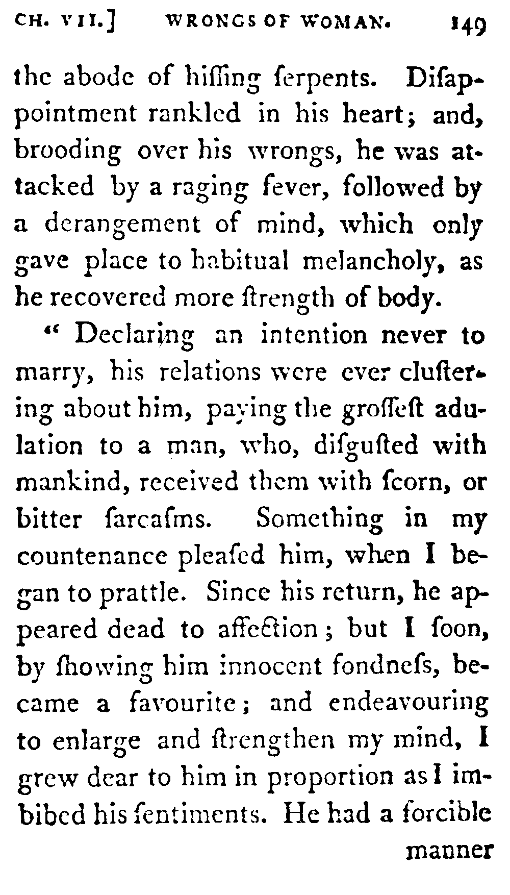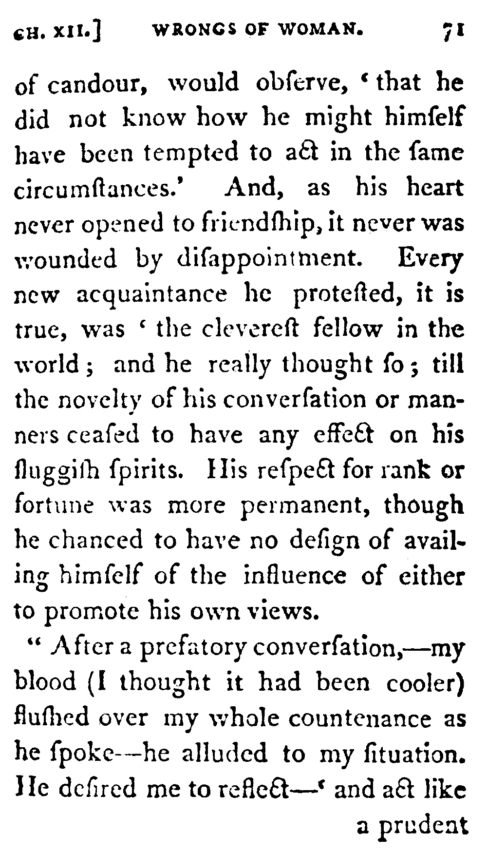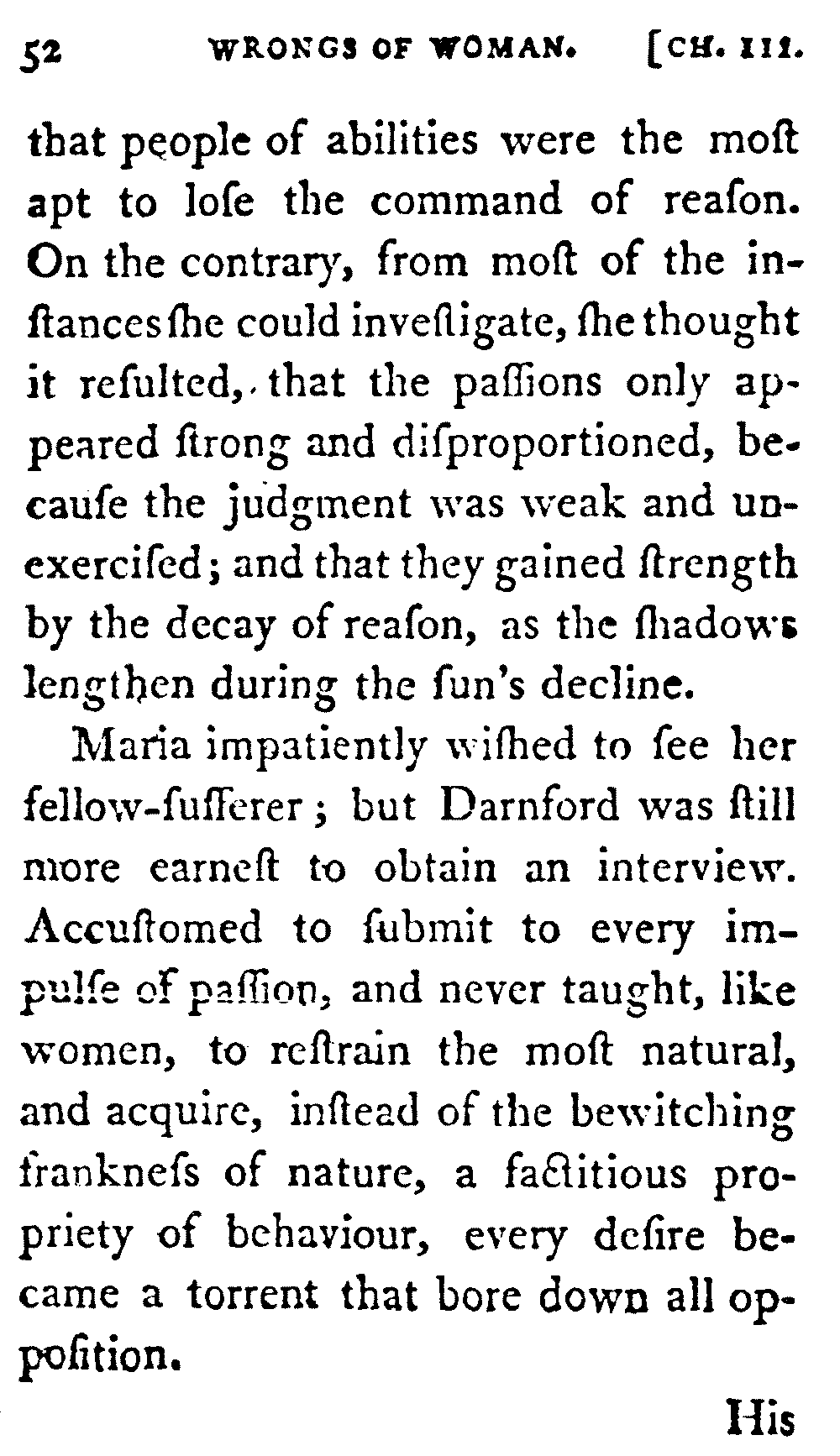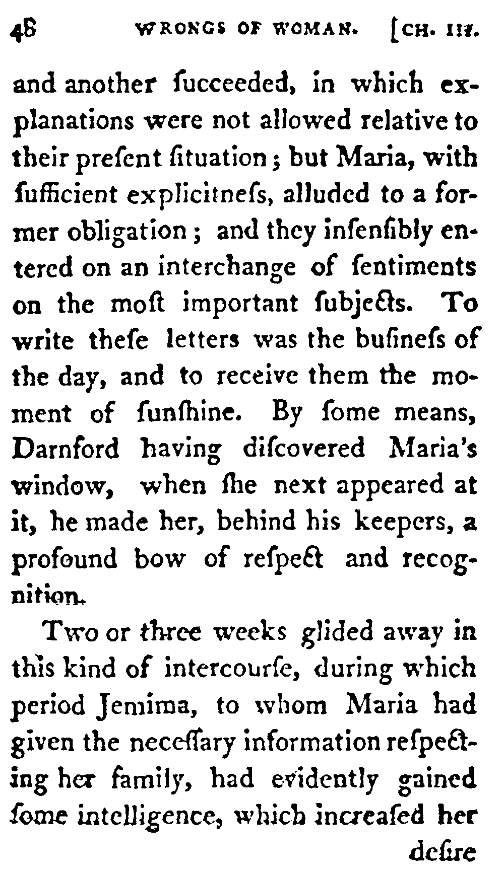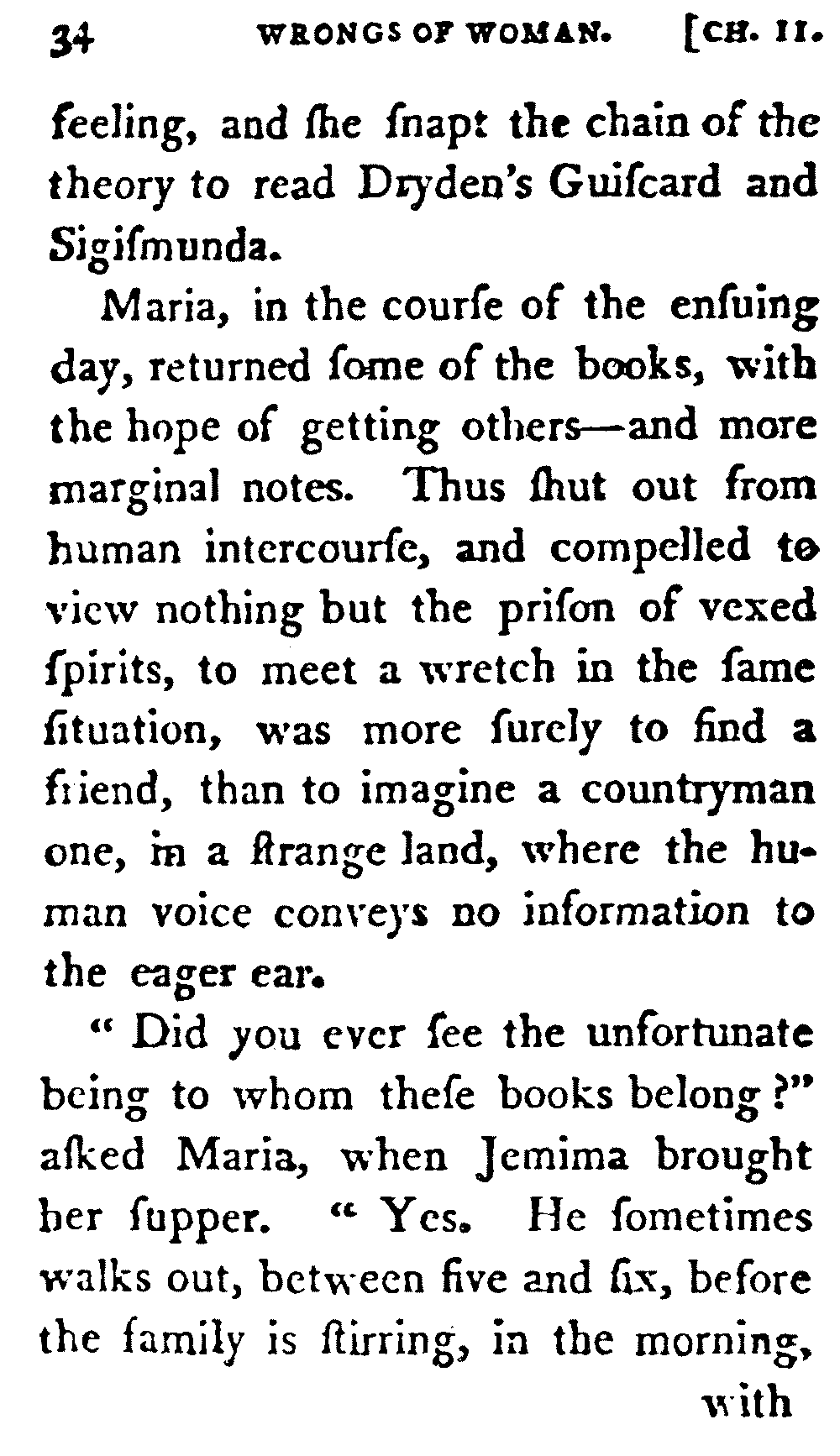 Maria, in the course of the ensuing day, returned some of the books, with the hope of getting others—and more marginal notes. Thus shut out from human intercourse, and compelled to view nothing but the prison of vexed spirits, to meet a wretch in the same situation, was more surely to find a friend, than to imagine a countryman one, in a strange land, where the human voice conveys no information to the eager ear.