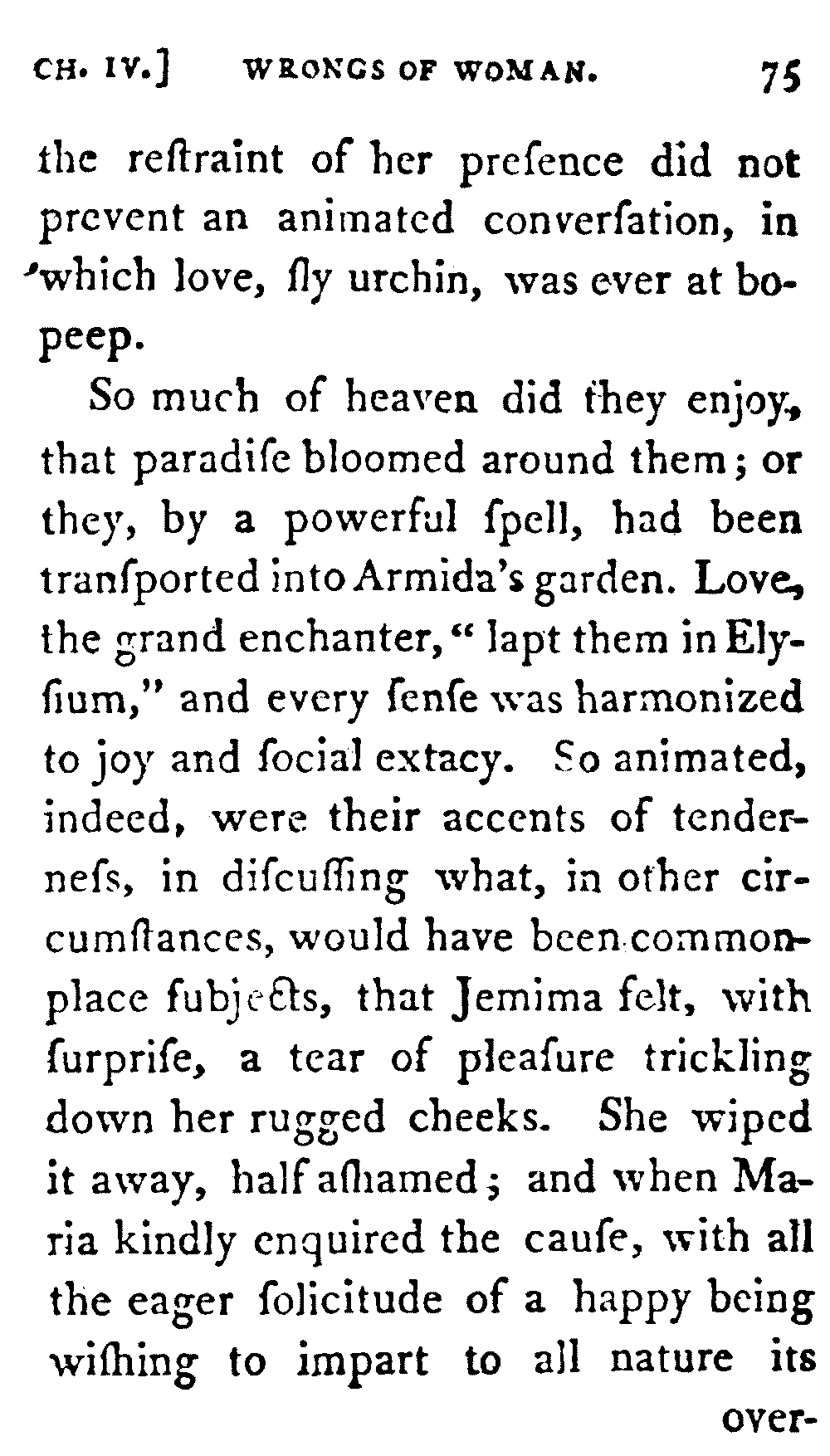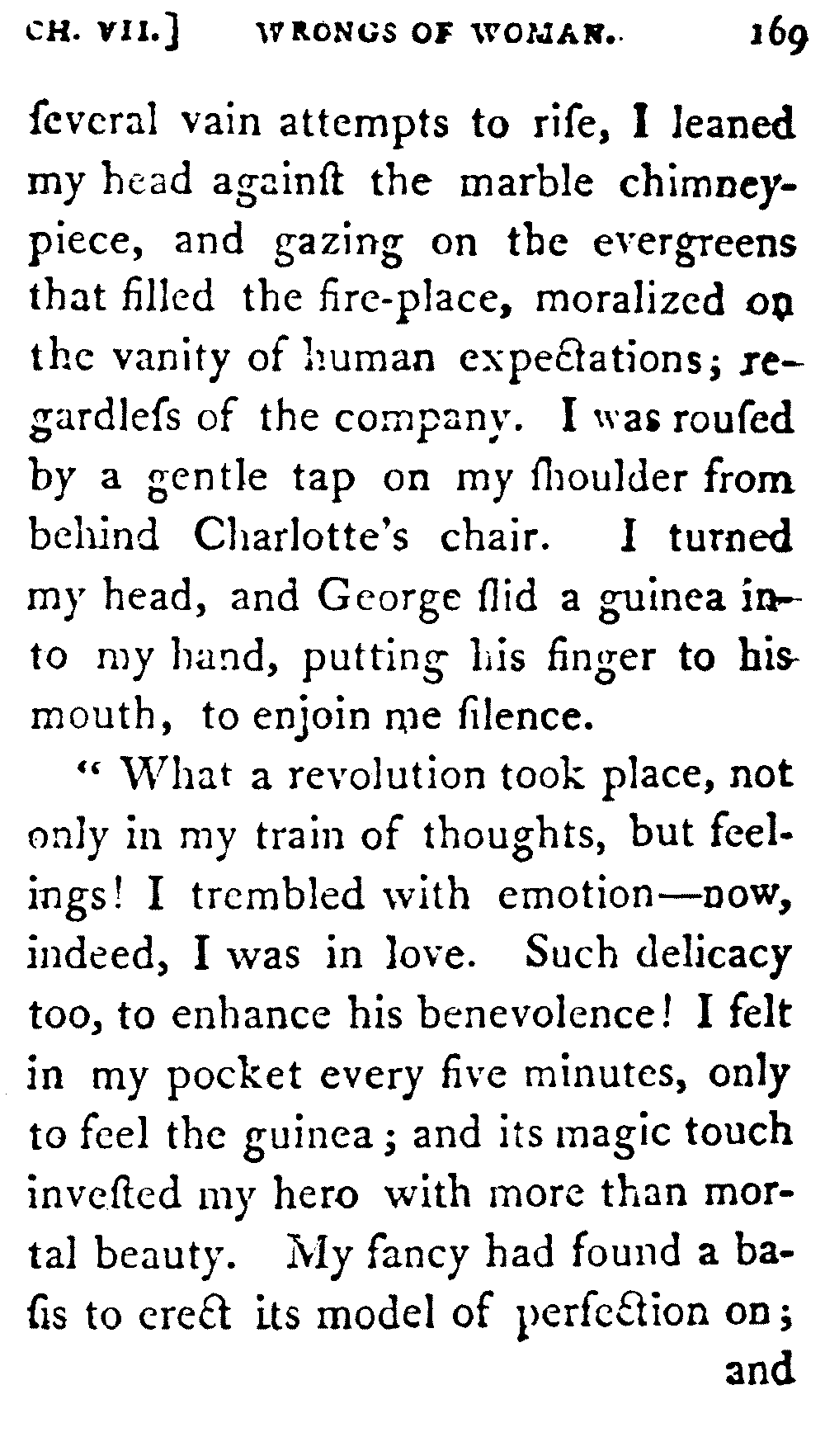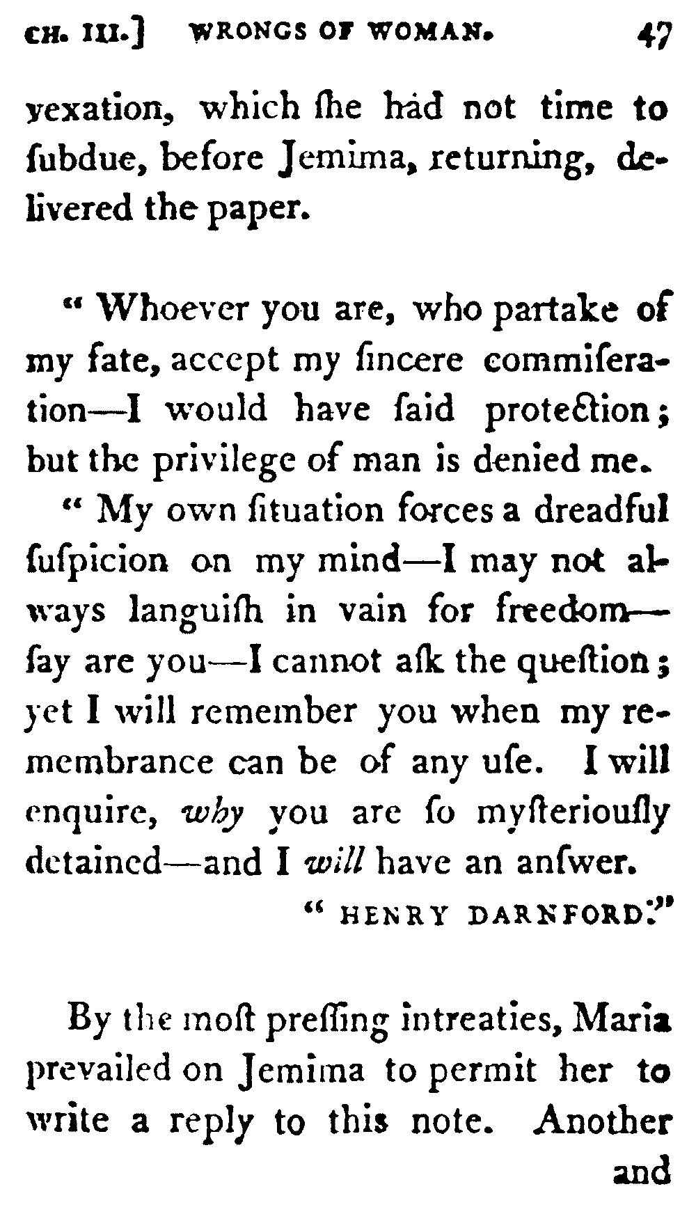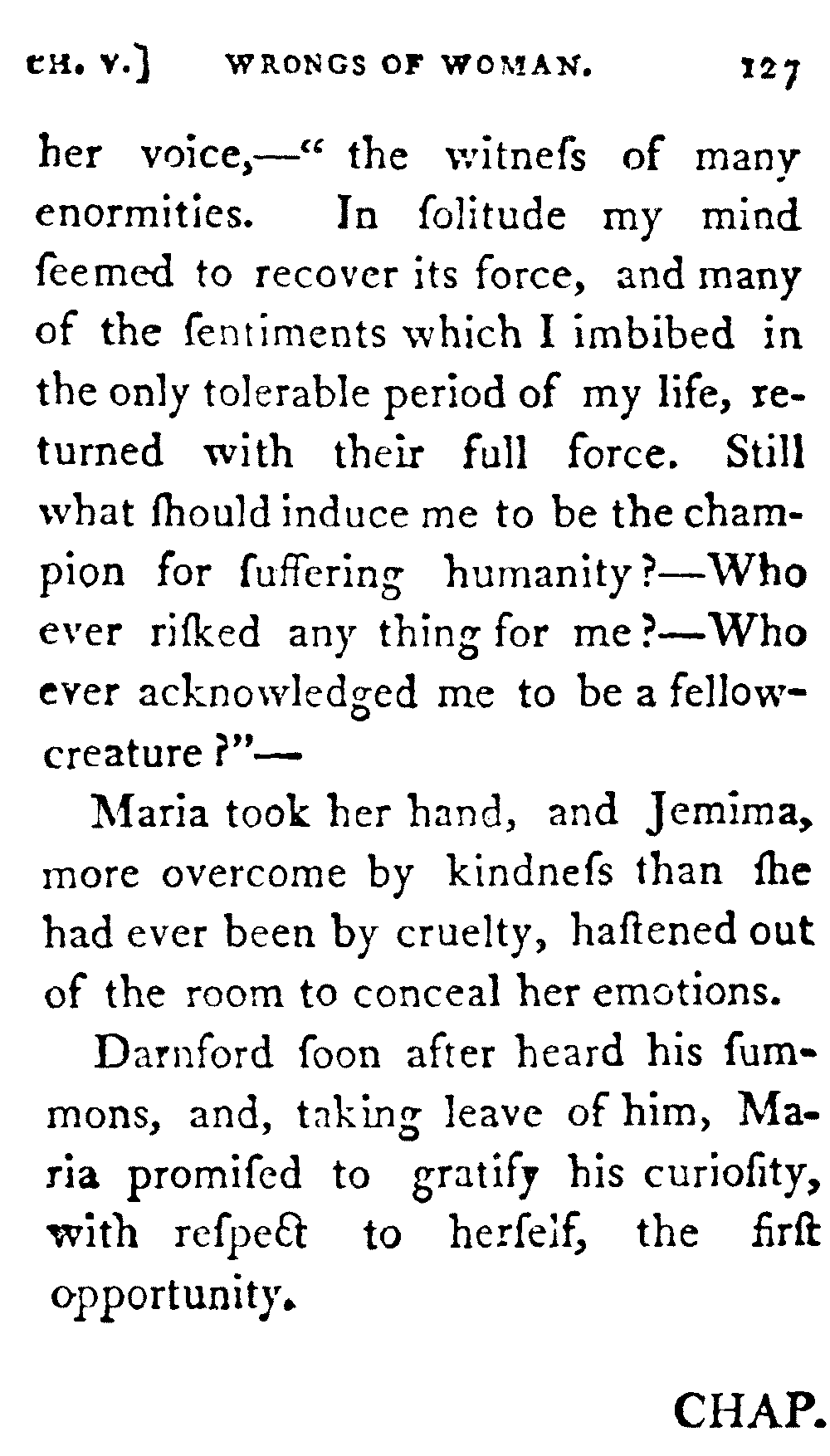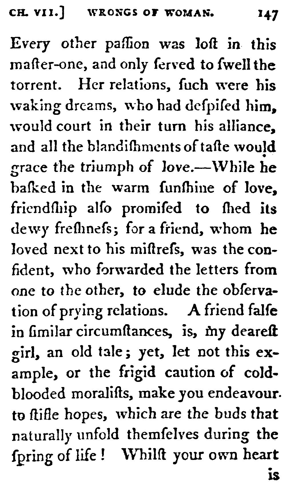 Maria, in the course of the ensuing day, returned some of the books, with the hope of getting others—and more marginal notes. Thus shut out from human intercourse, and compelled to view nothing but the prison of vexed spirits, to meet a wretch in the same situation, was more surely to find a friend, than to imagine a countryman one, in a strange land, where the human voice conveys no information to the eager ear.