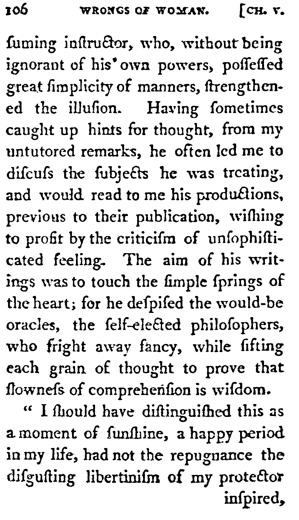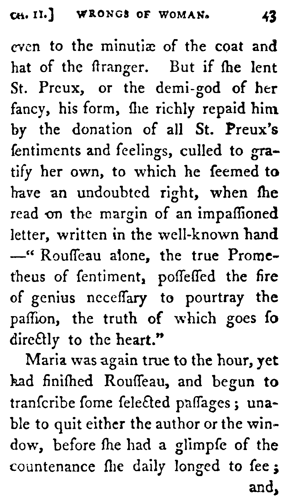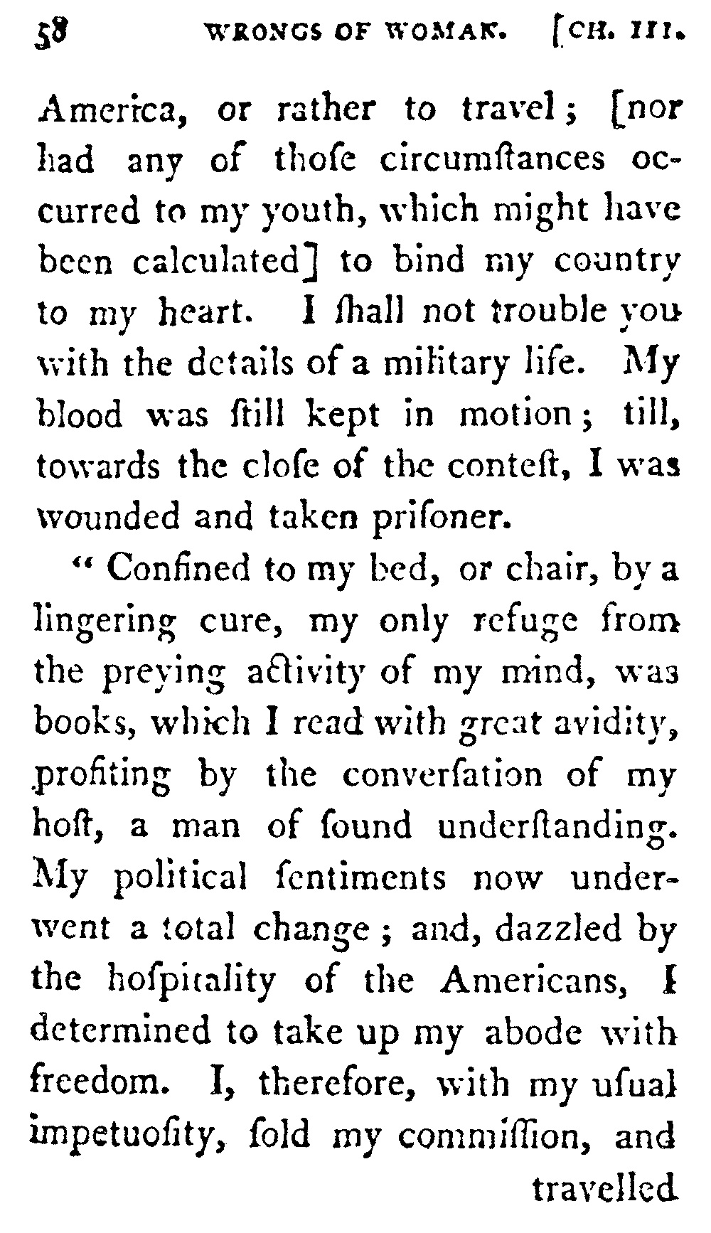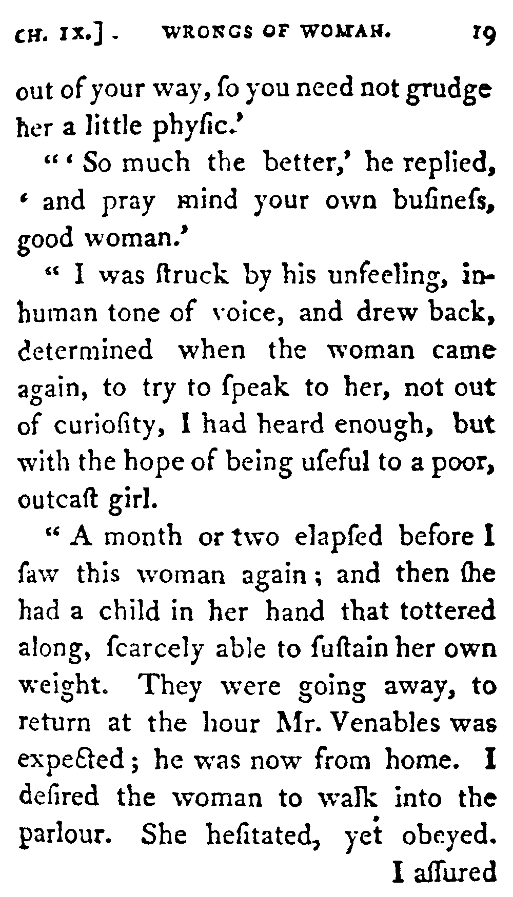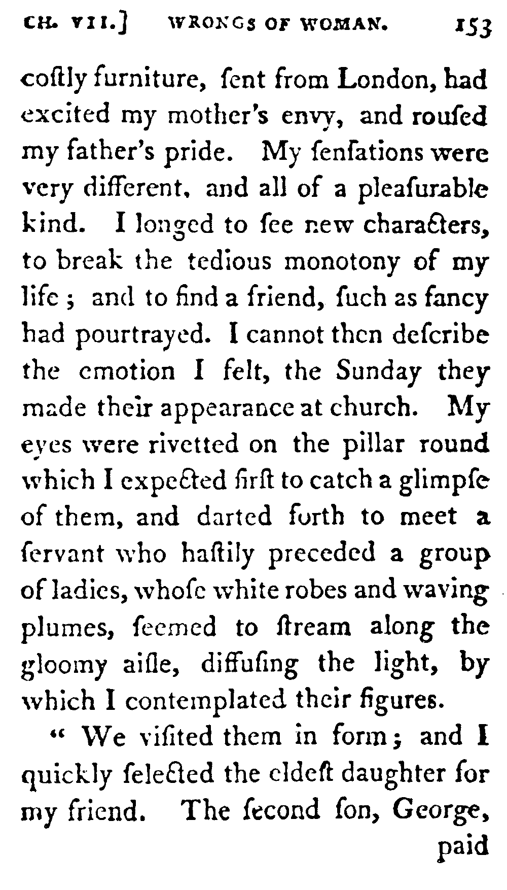 Maria, in the course of the ensuing day, returned some of the books, with the hope of getting others—and more marginal notes. Thus shut out from human intercourse, and compelled to view nothing but the prison of vexed spirits, to meet a wretch in the same situation, was more surely to find a friend, than to imagine a countryman one, in a strange land, where the human voice conveys no information to the eager ear.