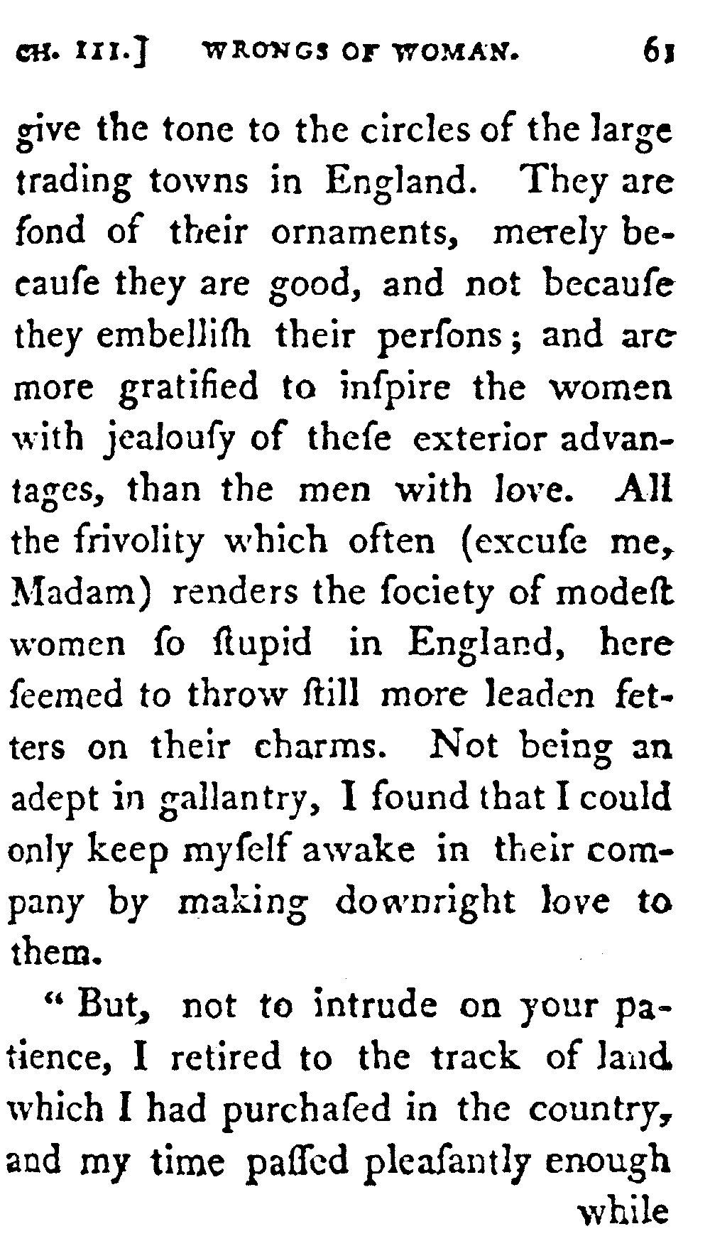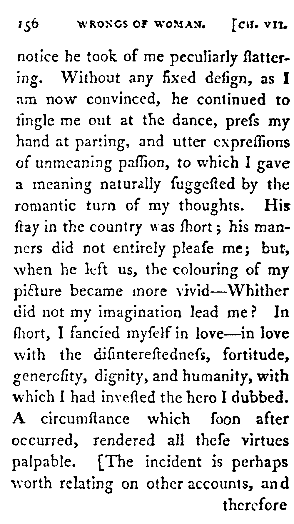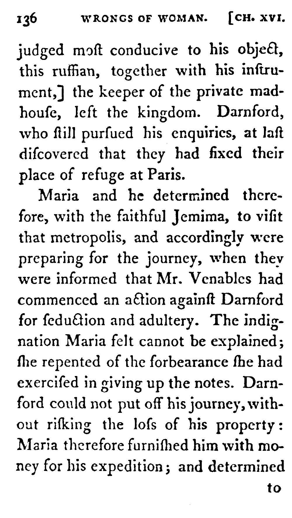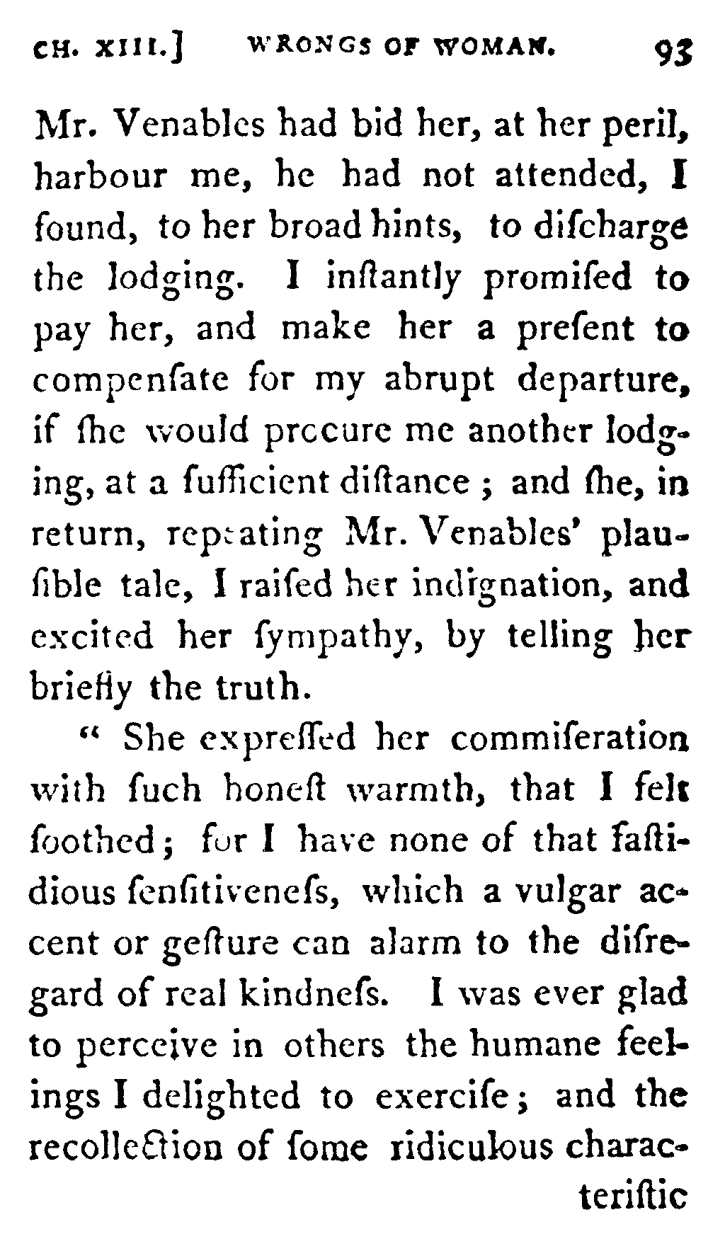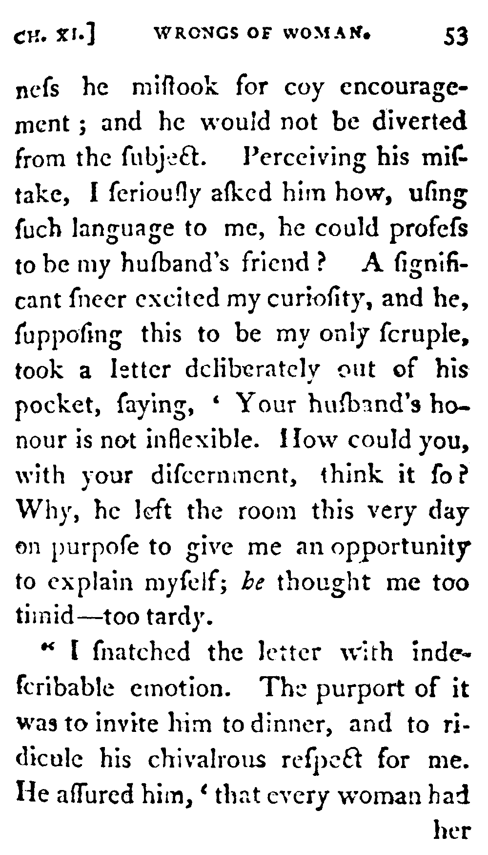 Maria, in the course of the ensuing day, returned some of the books, with the hope of getting others—and more marginal notes. Thus shut out from human intercourse, and compelled to view nothing but the prison of vexed spirits, to meet a wretch in the same situation, was more surely to find a friend, than to imagine a countryman one, in a strange land, where the human voice conveys no information to the eager ear.