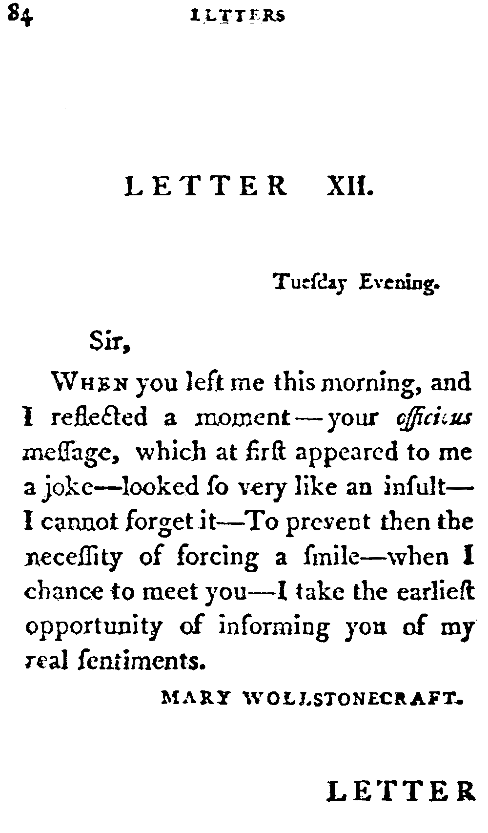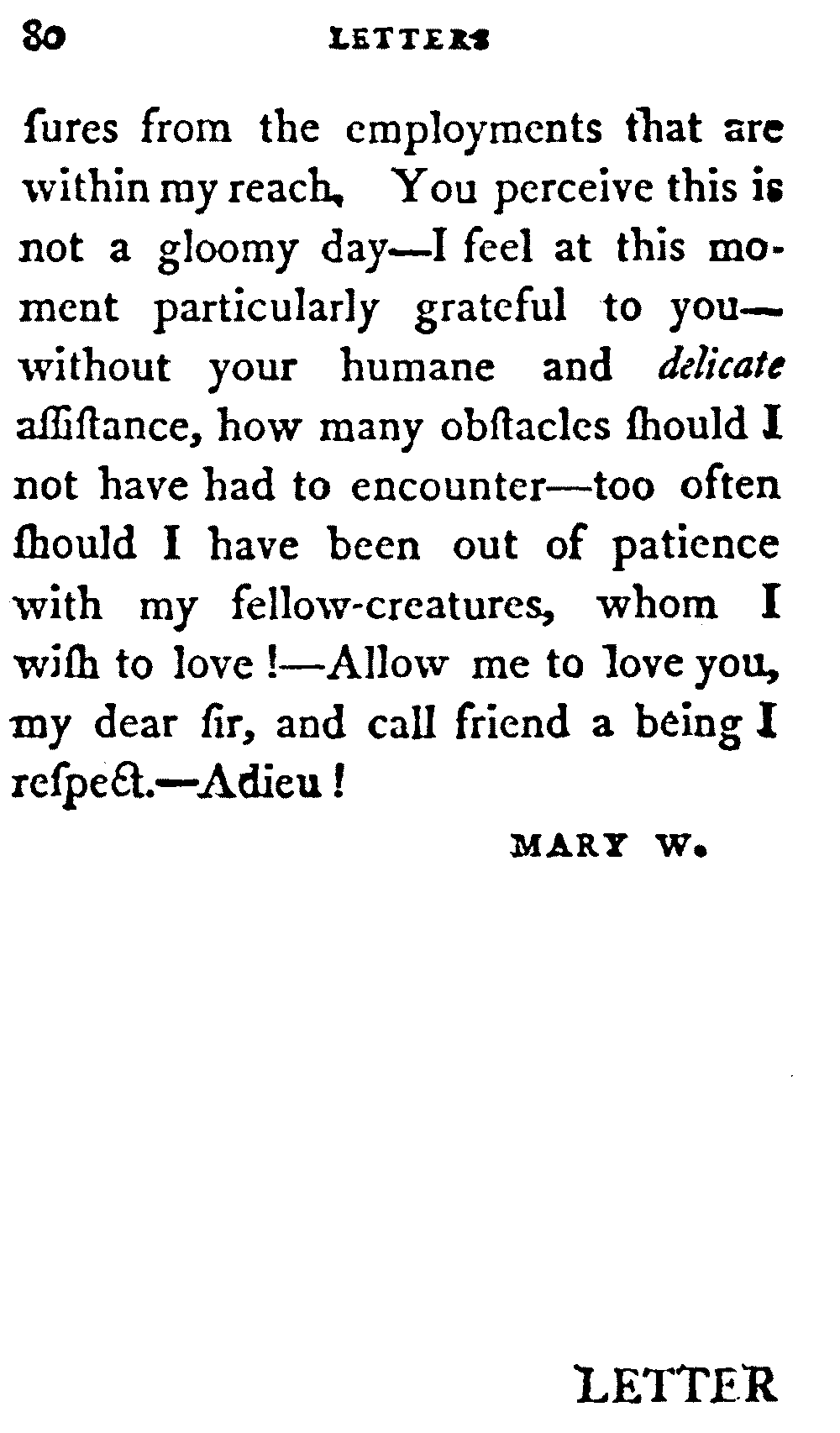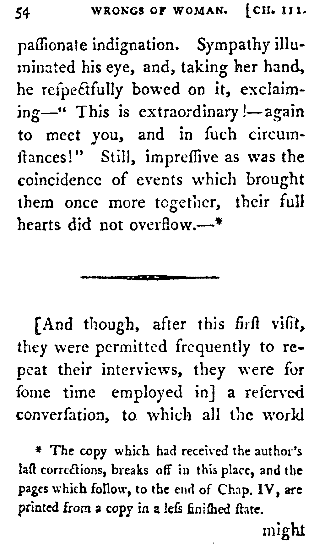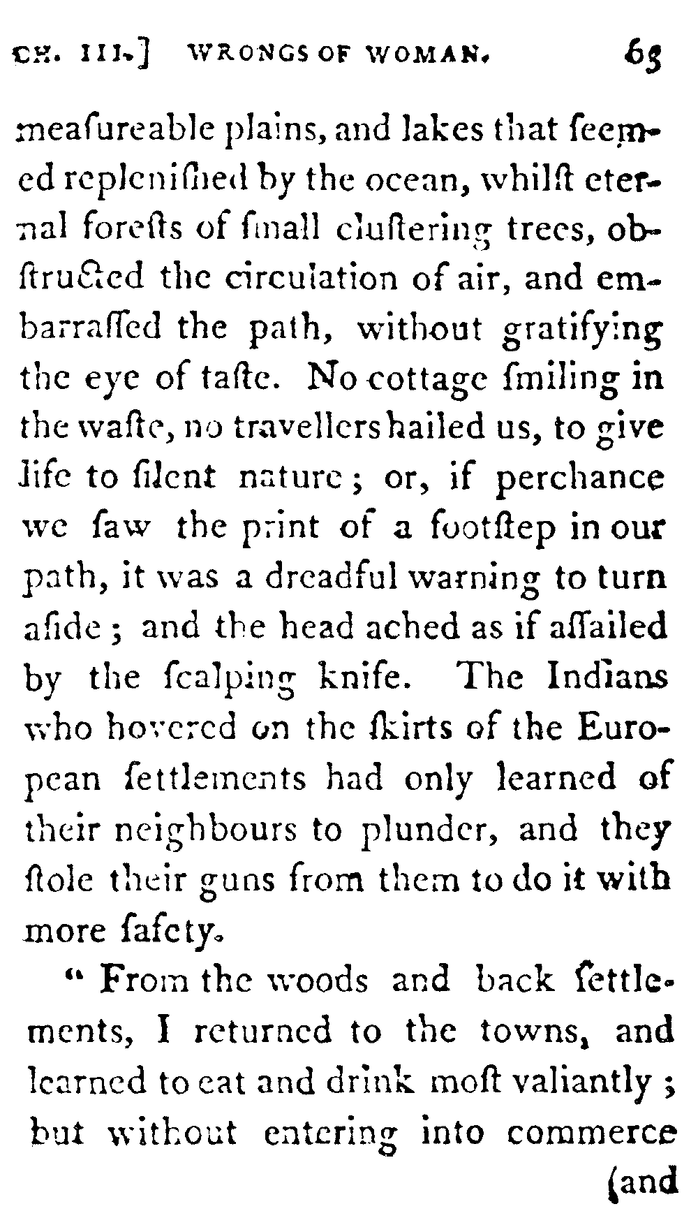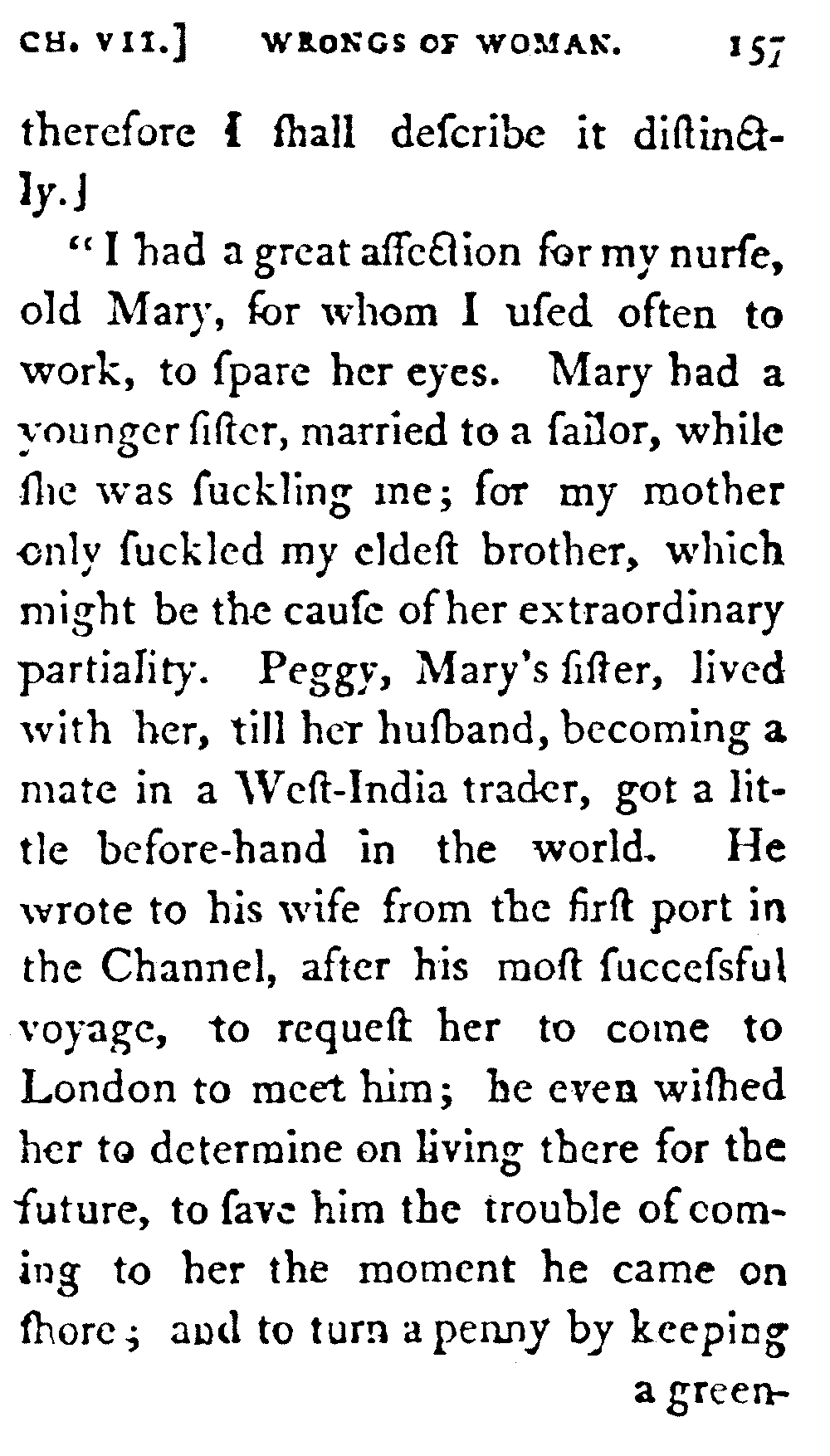 Maria, in the course of the ensuing day, returned some of the books, with the hope of getting others—and more marginal notes. Thus shut out from human intercourse, and compelled to view nothing but the prison of vexed spirits, to meet a wretch in the same situation, was more surely to find a friend, than to imagine a countryman one, in a strange land, where the human voice conveys no information to the eager ear.