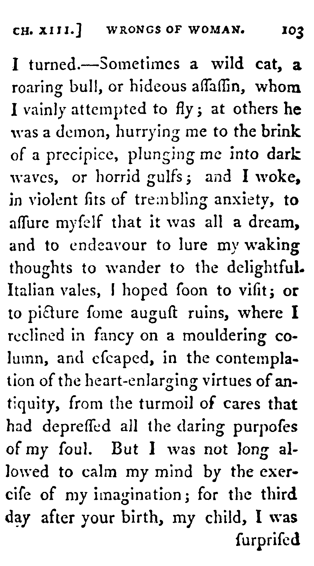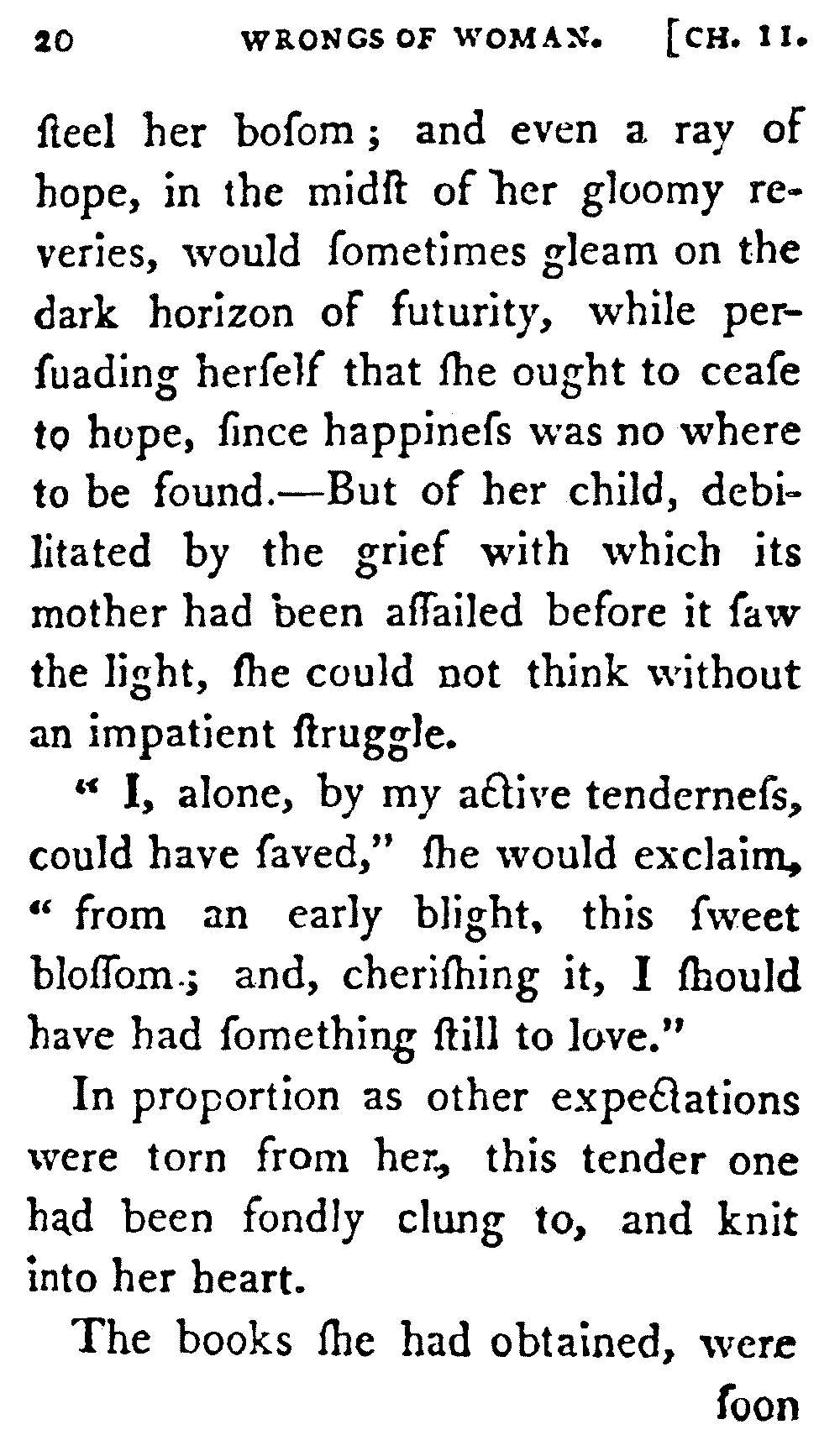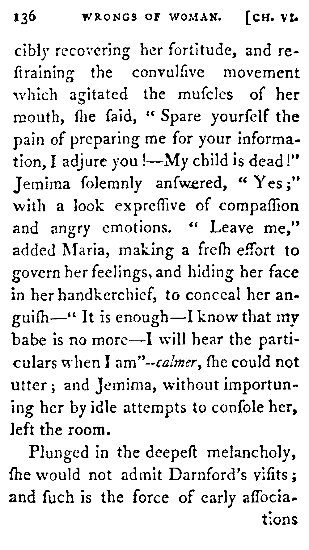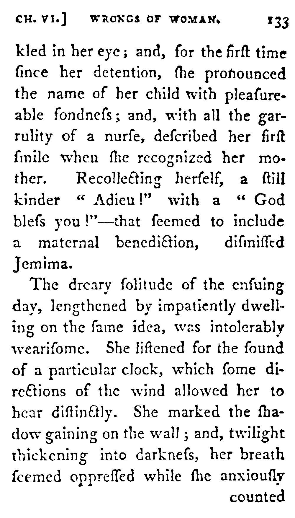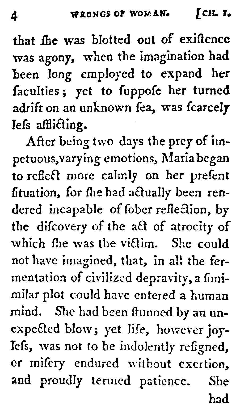 The retreating shadows of former sorrows rushed back in a gloomy train, and seemed to be pictured on the walls of her prison, magnified by the state of mind in which they were viewed—Still she mourned for her child, lamented she was a daughter, and anticipated the aggravated ills of life that her sex rendered almost inevitable, even while dreading she was no more. To think[4] that she was blotted out of existence was agony, when the imagination had been long employed to expand her faculties; yet to suppose her turned adrift on an unknown sea, was scarcely less afflicting.