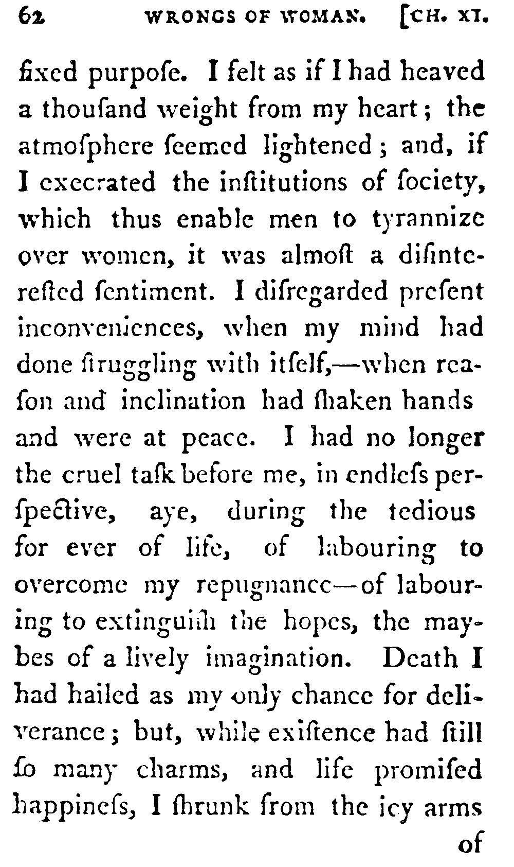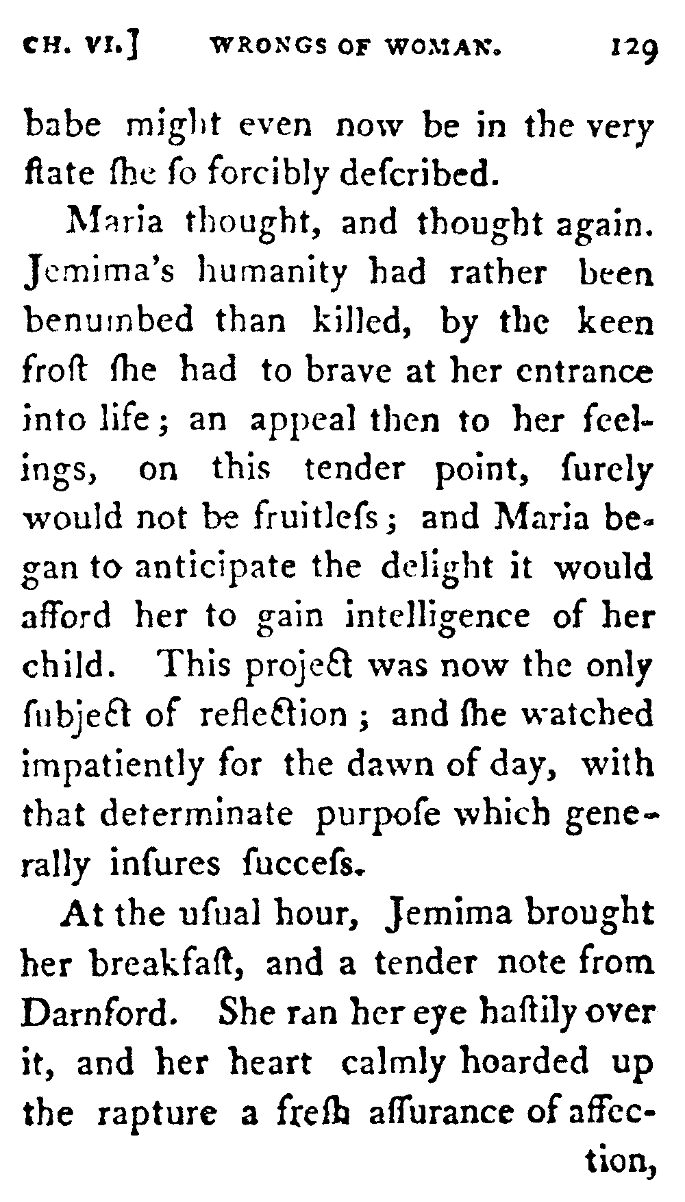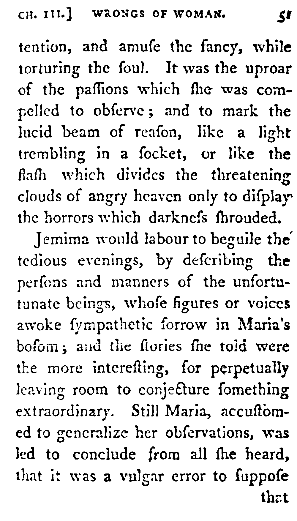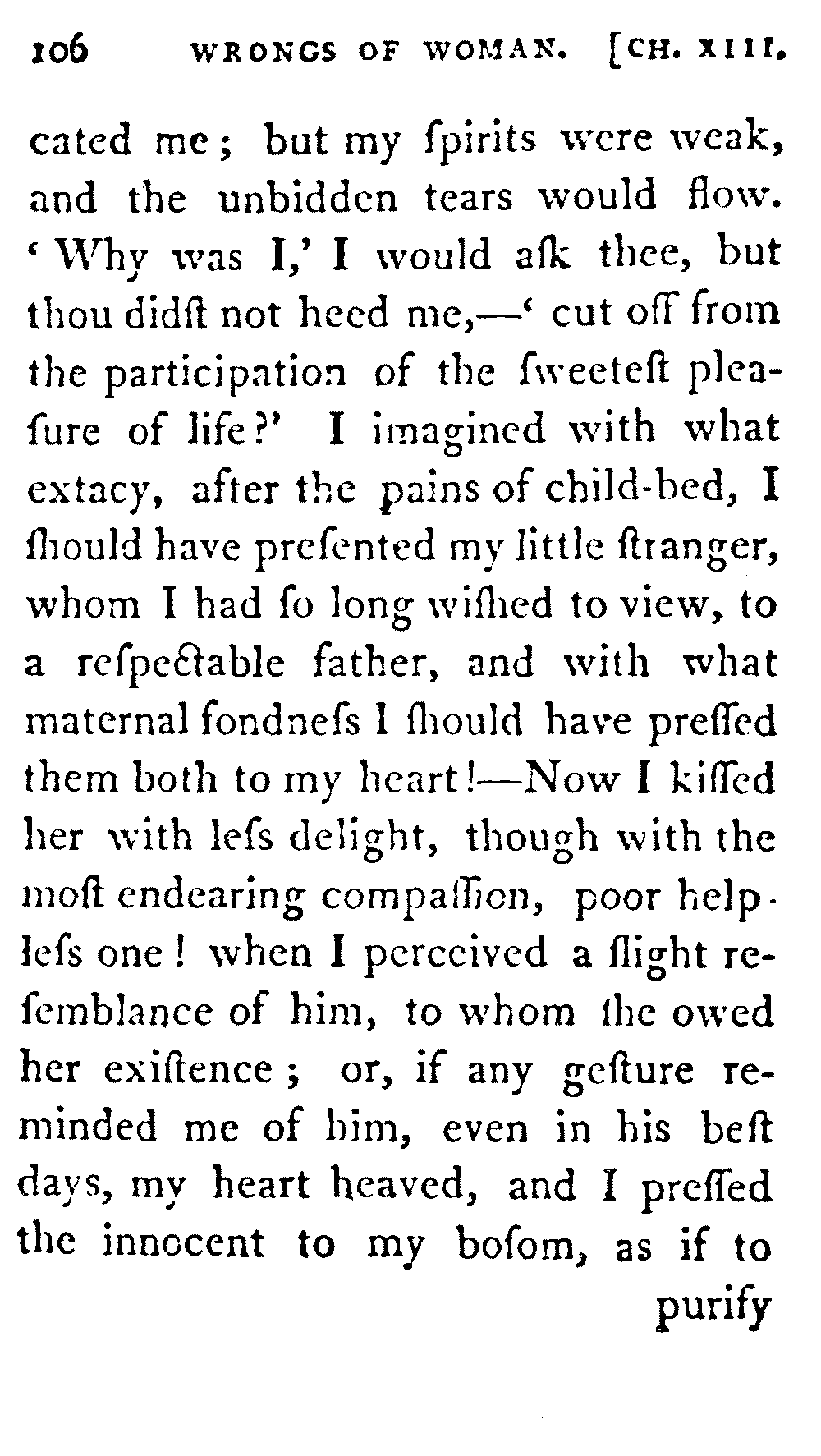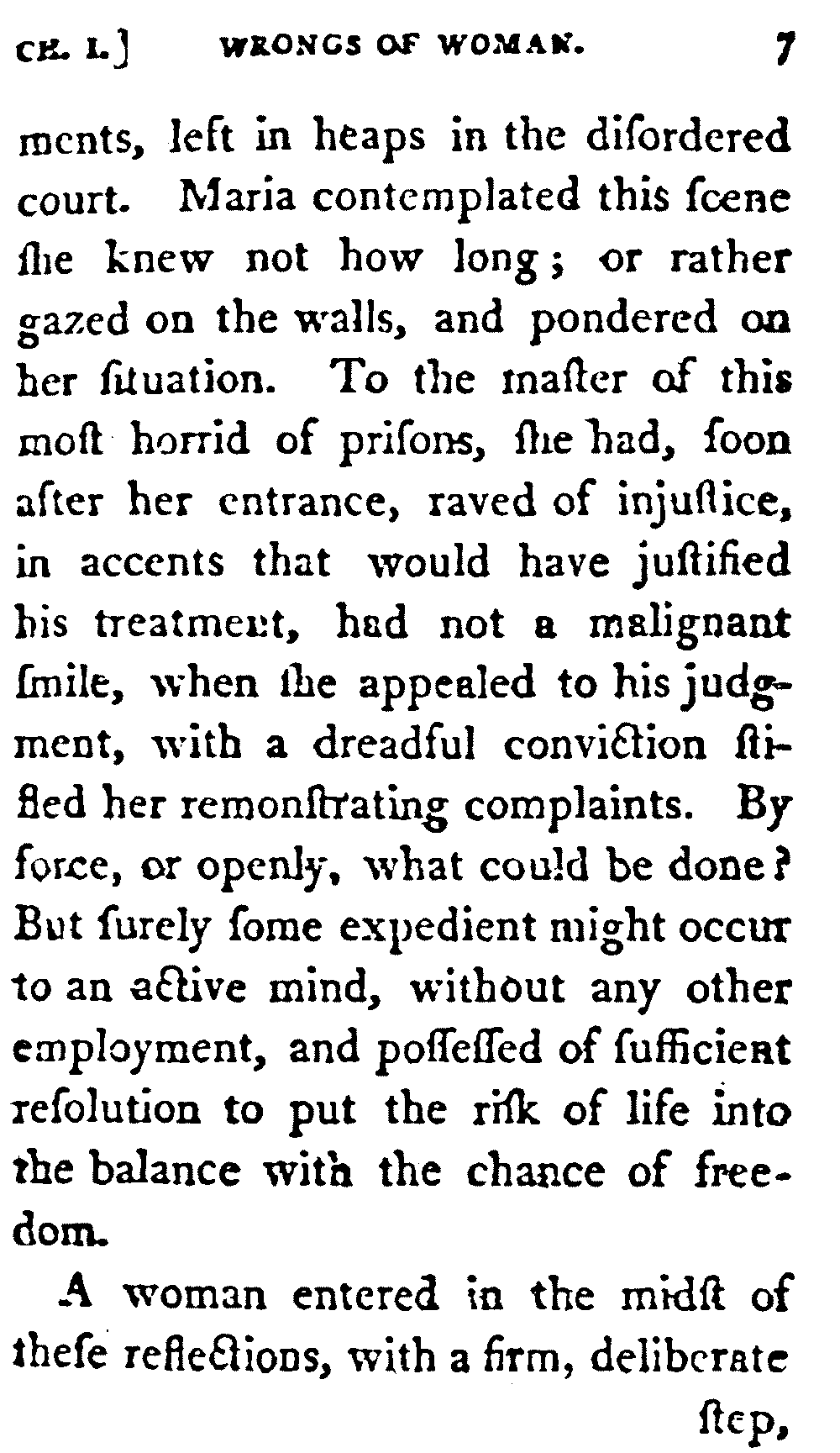 The retreating shadows of former sorrows rushed back in a gloomy train, and seemed to be pictured on the walls of her prison, magnified by the state of mind in which they were viewed—Still she mourned for her child, lamented she was a daughter, and anticipated the aggravated ills of life that her sex rendered almost inevitable, even while dreading she was no more. To think[4] that she was blotted out of existence was agony, when the imagination had been long employed to expand her faculties; yet to suppose her turned adrift on an unknown sea, was scarcely less afflicting.