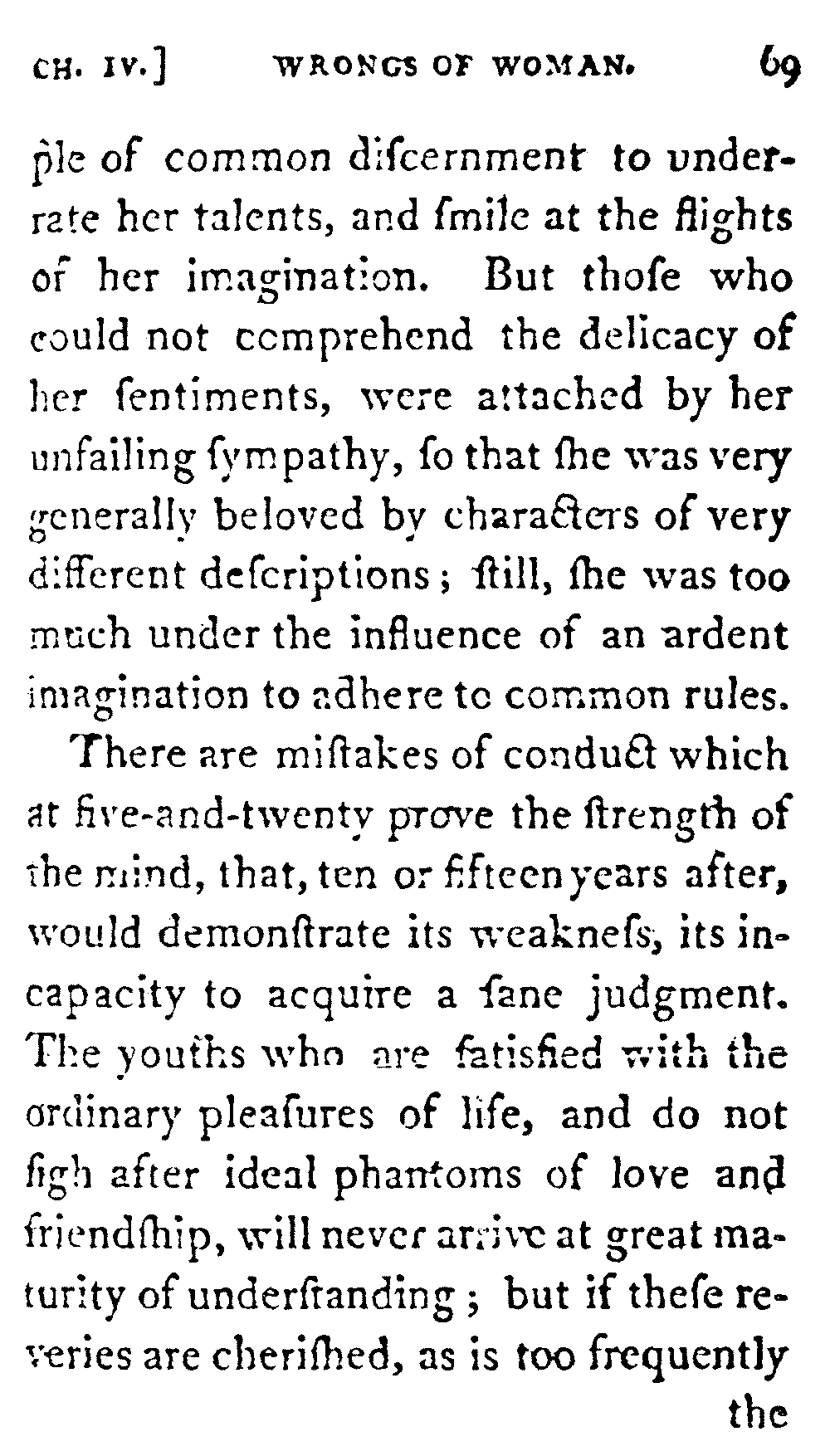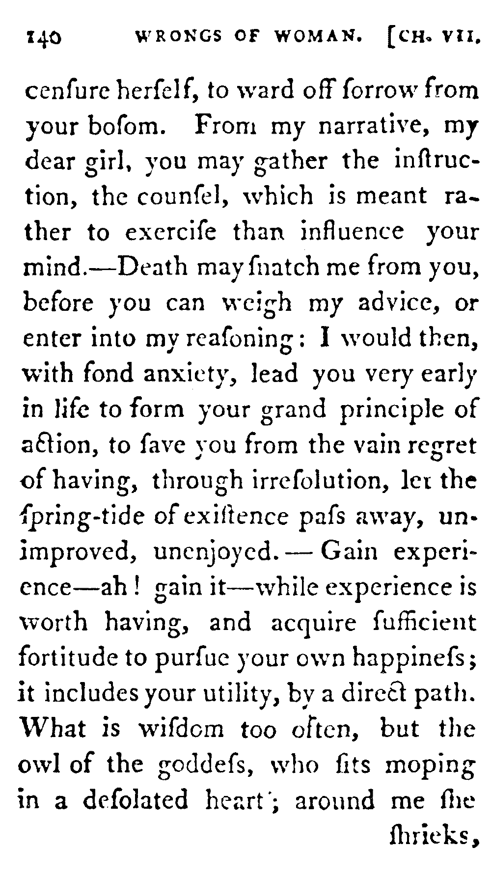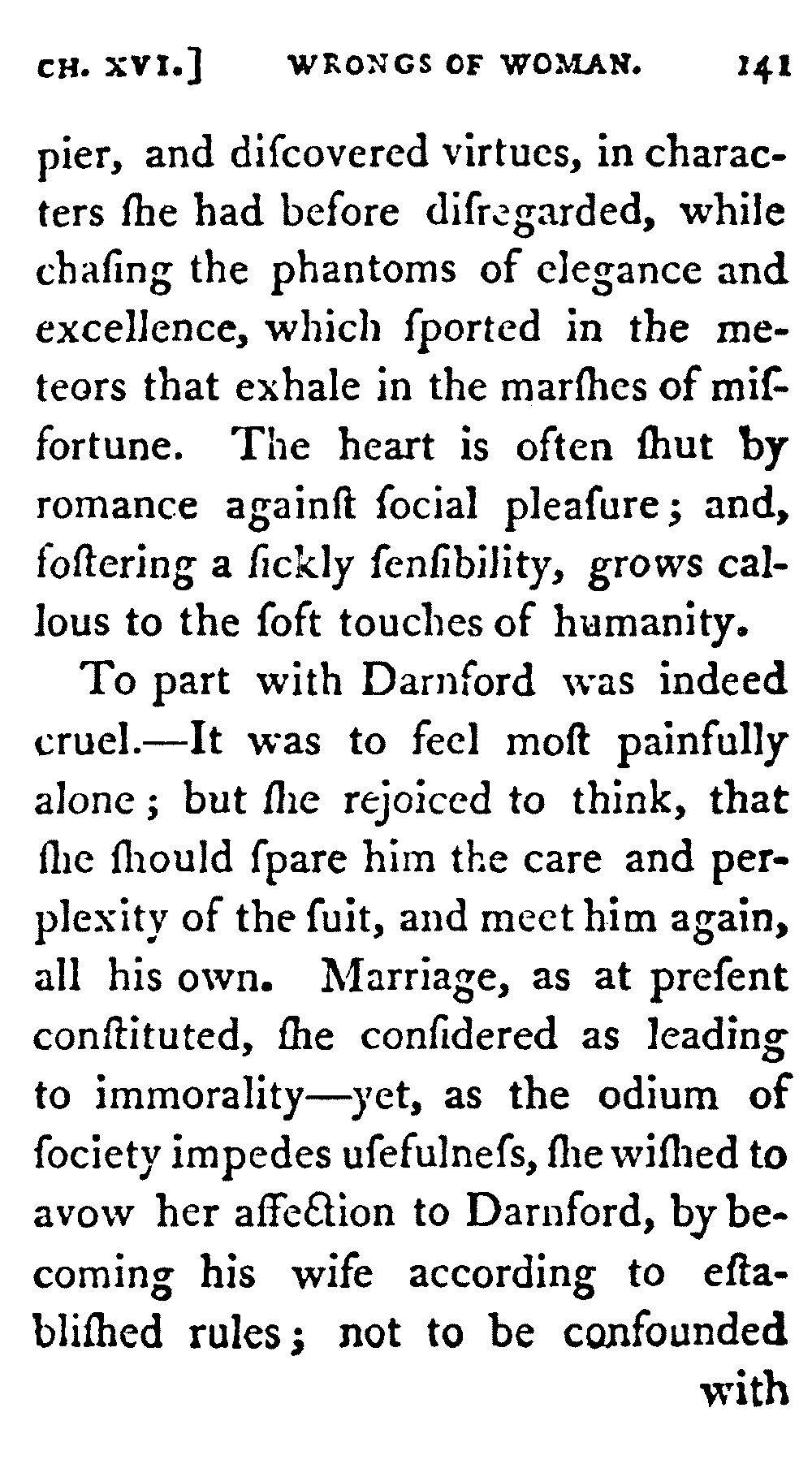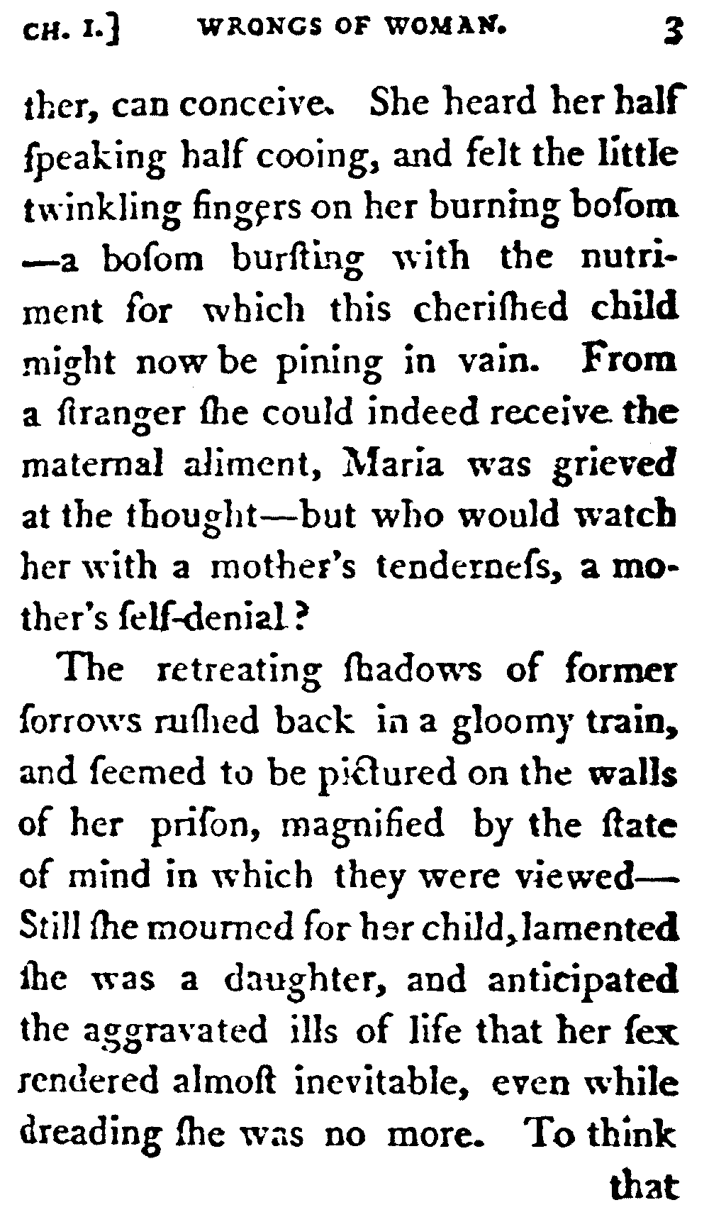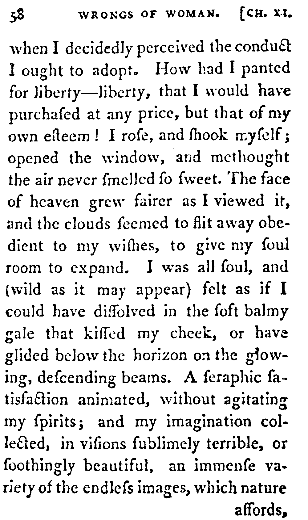 The retreating shadows of former sorrows rushed back in a gloomy train, and seemed to be pictured on the walls of her prison, magnified by the state of mind in which they were viewed—Still she mourned for her child, lamented she was a daughter, and anticipated the aggravated ills of life that her sex rendered almost inevitable, even while dreading she was no more. To think[4] that she was blotted out of existence was agony, when the imagination had been long employed to expand her faculties; yet to suppose her turned adrift on an unknown sea, was scarcely less afflicting.