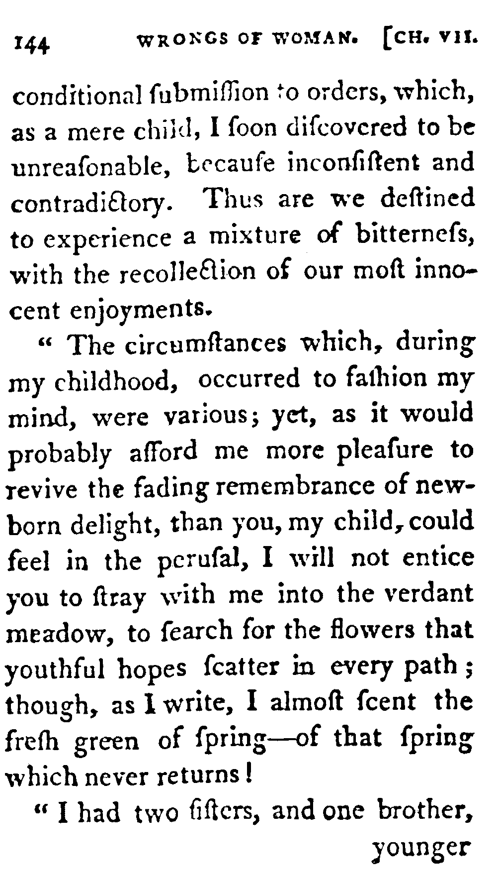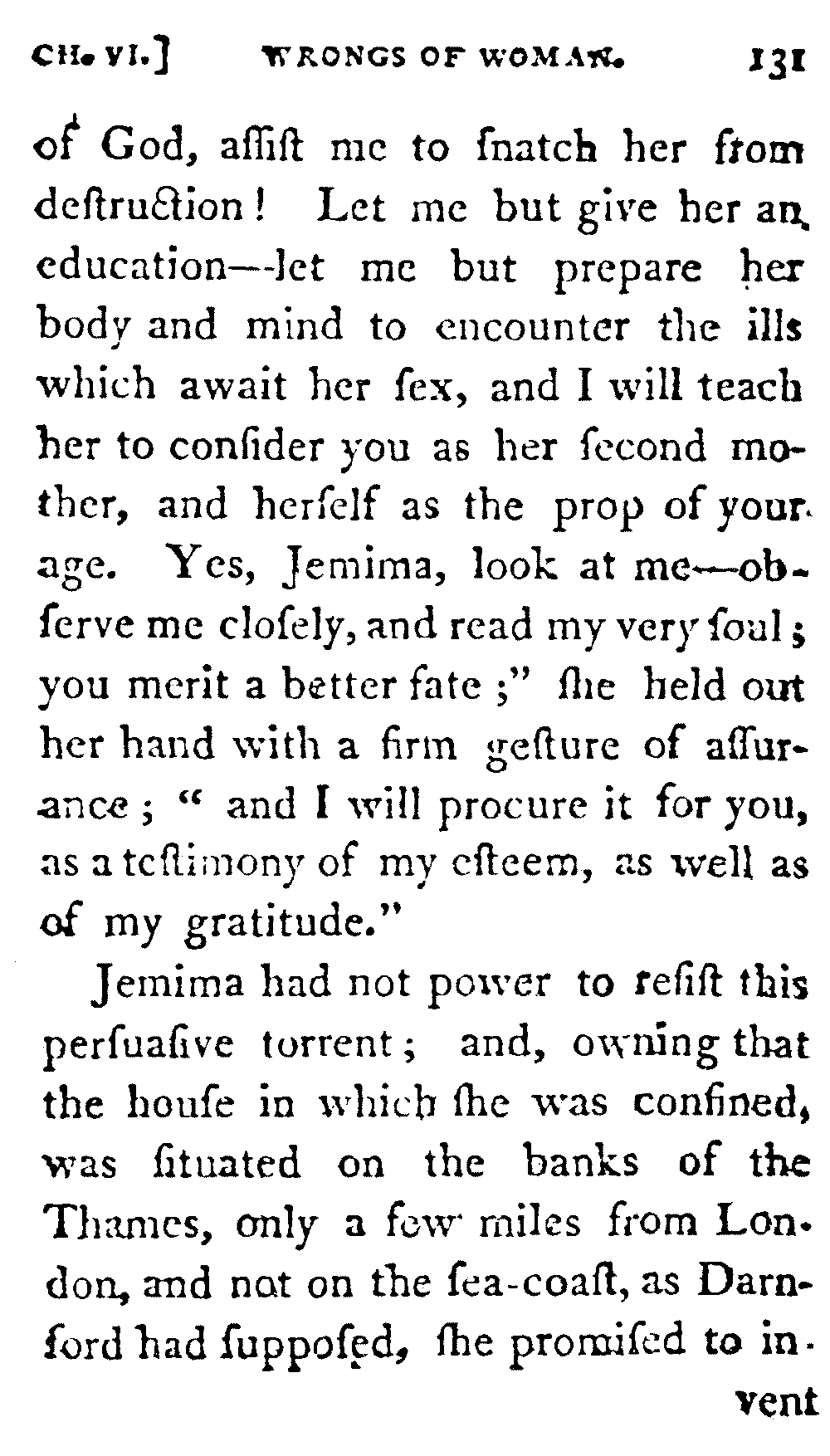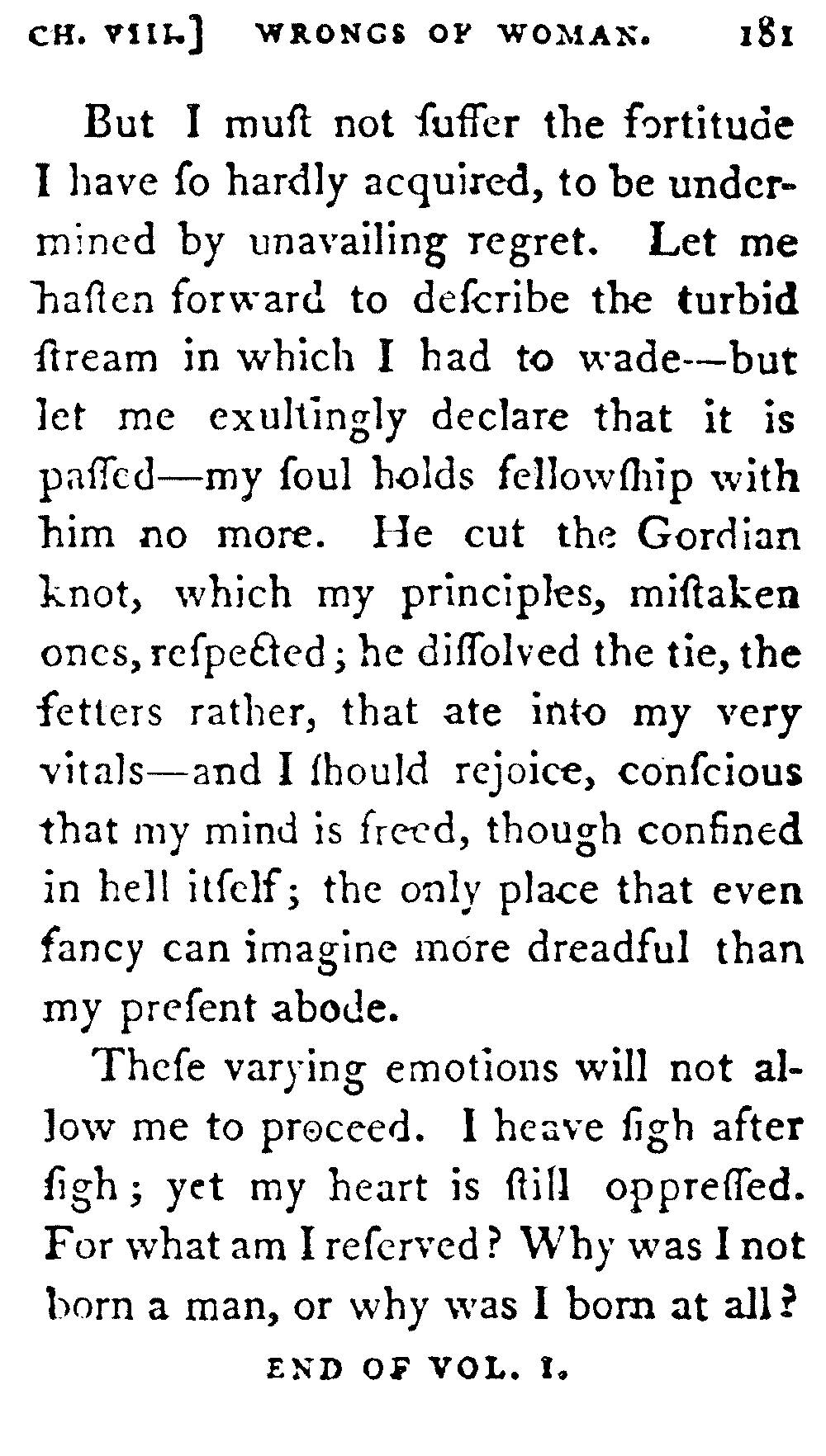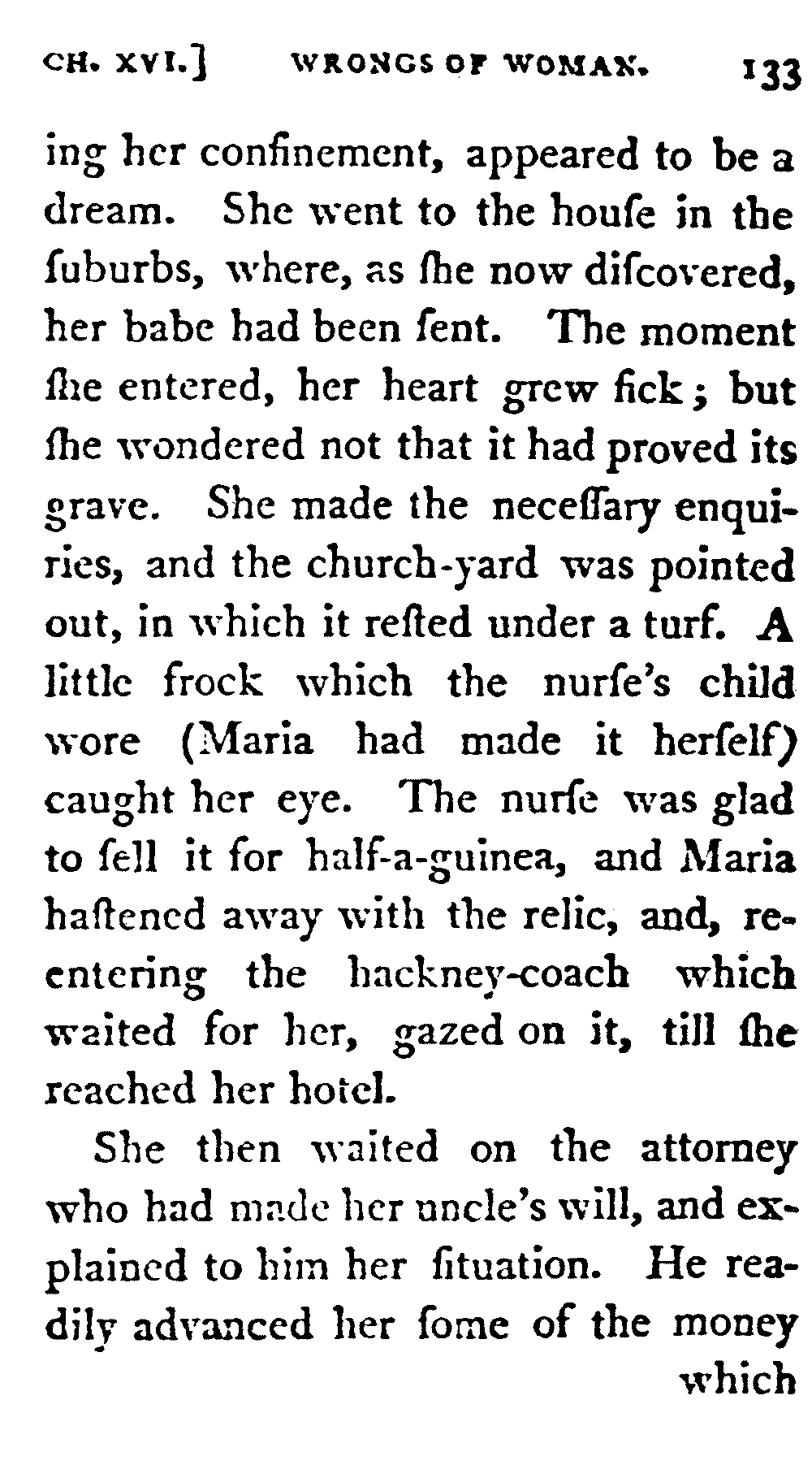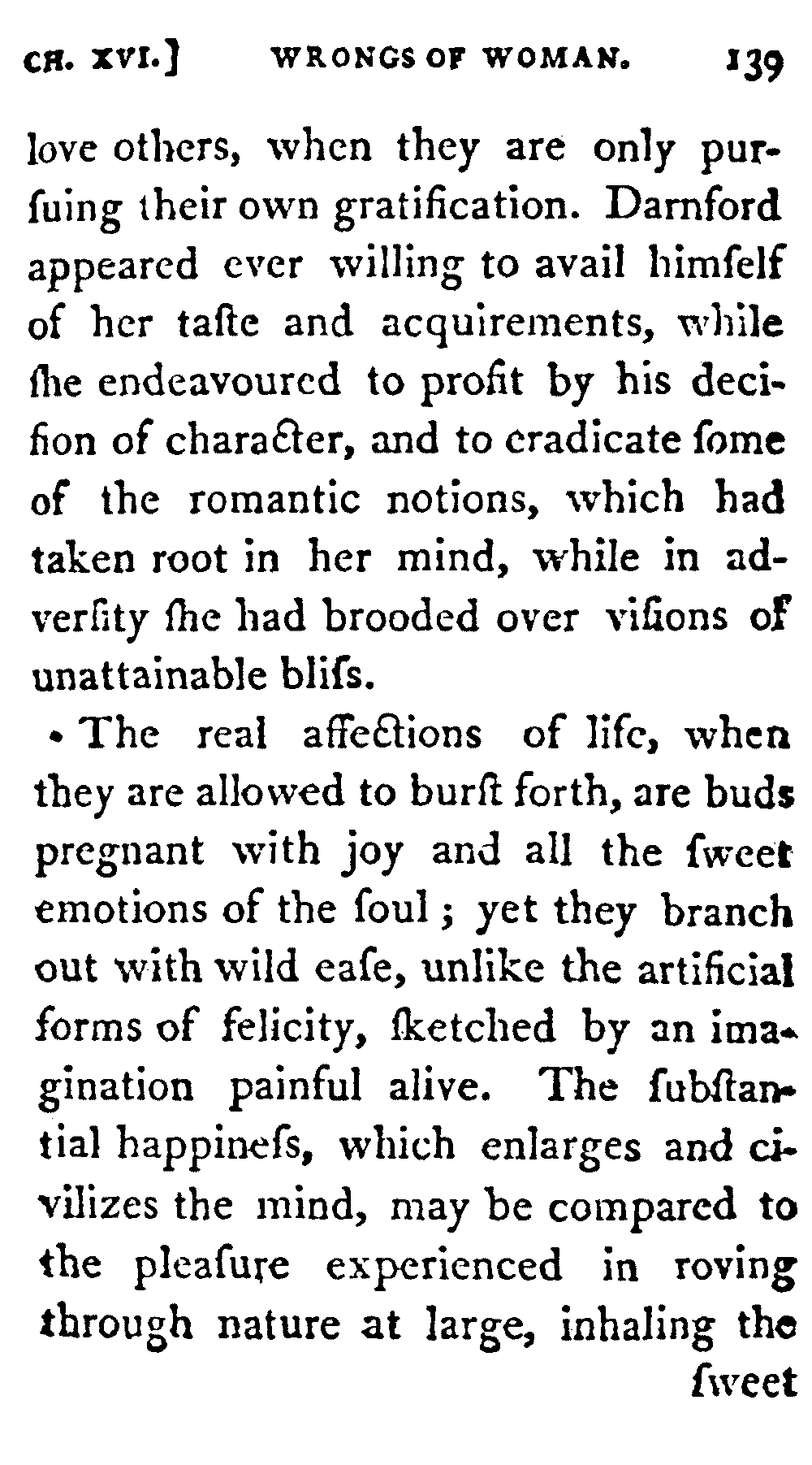 The retreating shadows of former sorrows rushed back in a gloomy train, and seemed to be pictured on the walls of her prison, magnified by the state of mind in which they were viewed—Still she mourned for her child, lamented she was a daughter, and anticipated the aggravated ills of life that her sex rendered almost inevitable, even while dreading she was no more. To think[4] that she was blotted out of existence was agony, when the imagination had been long employed to expand her faculties; yet to suppose her turned adrift on an unknown sea, was scarcely less afflicting.