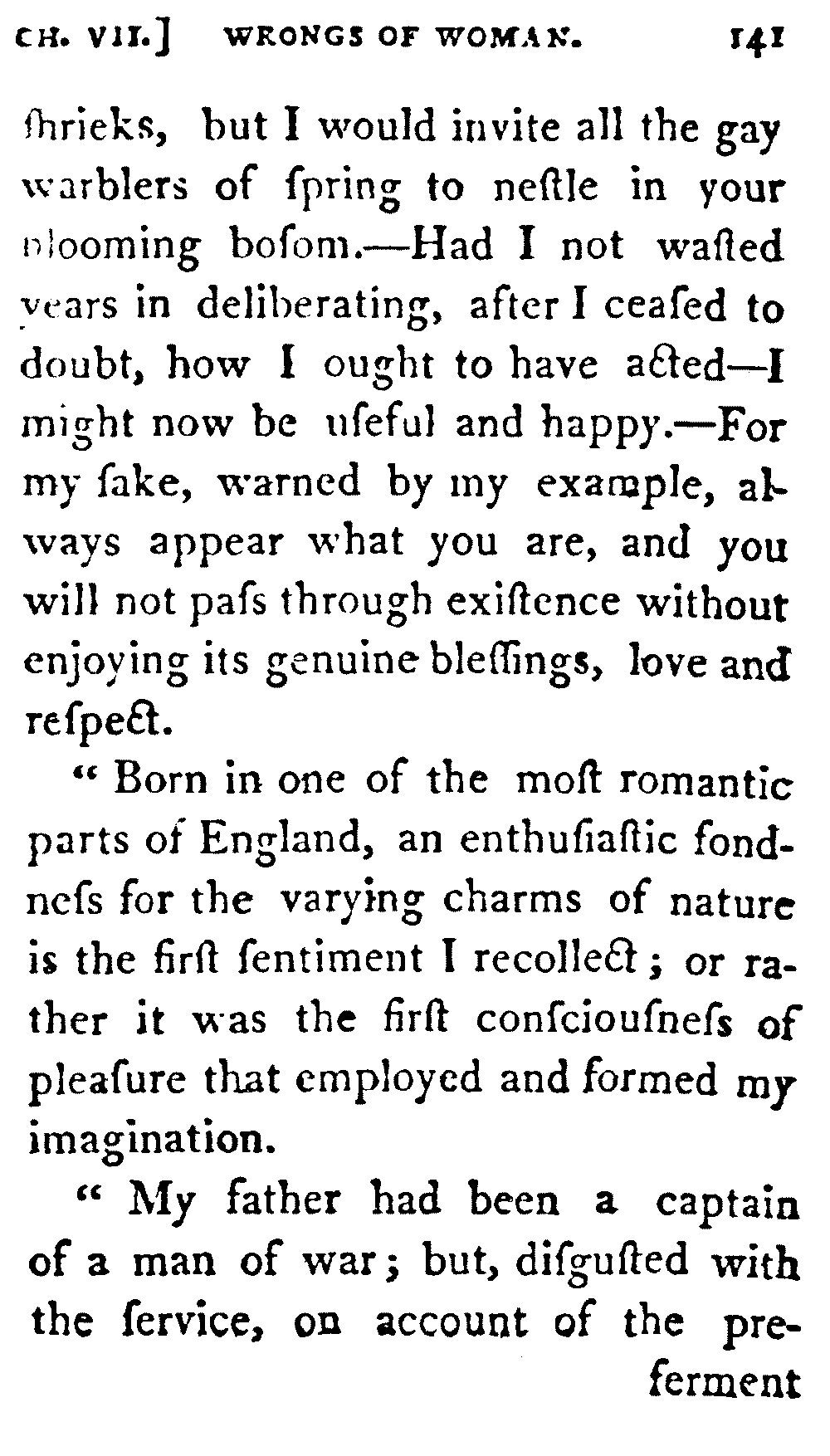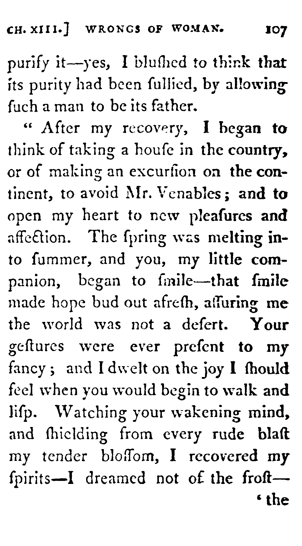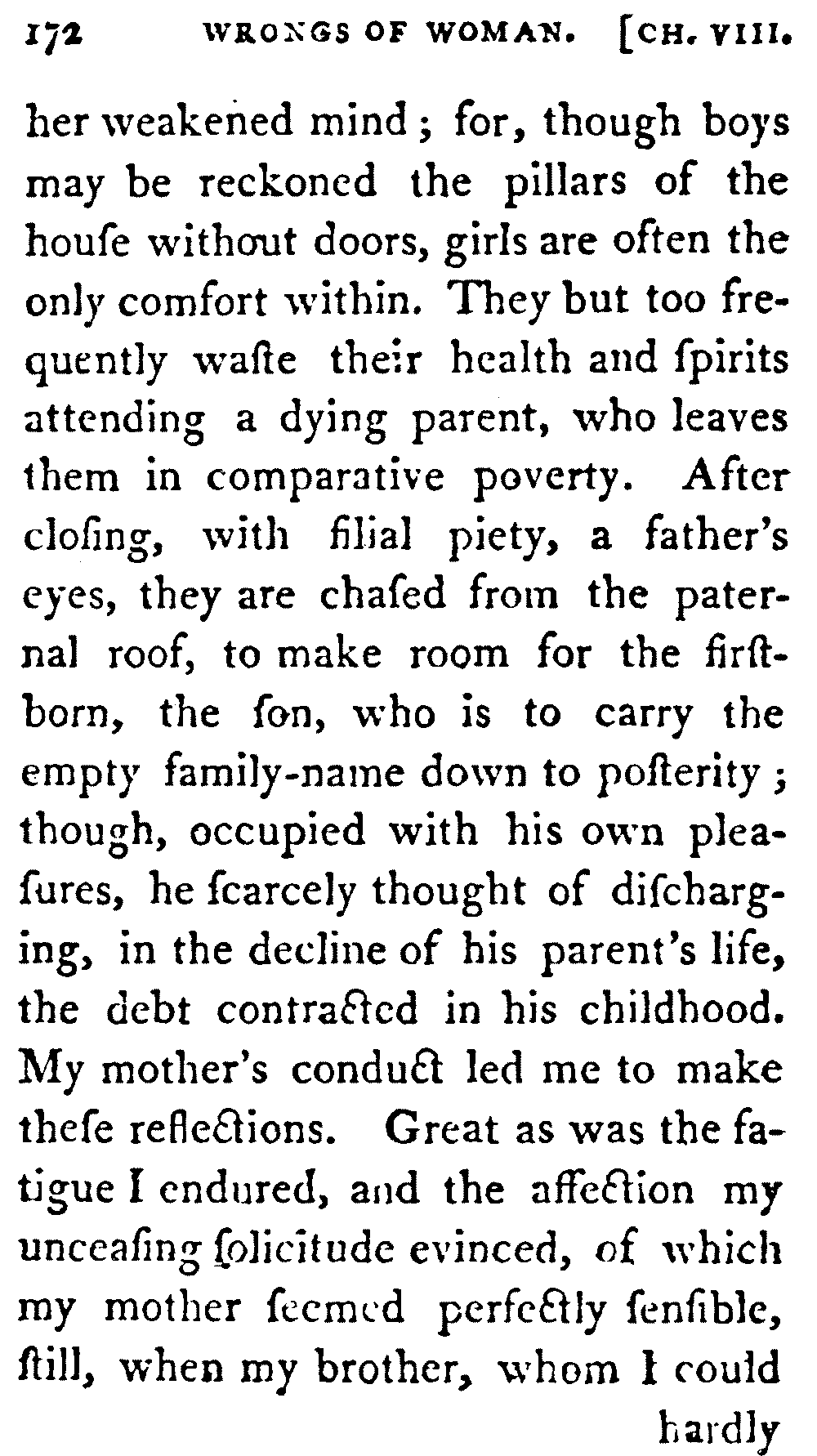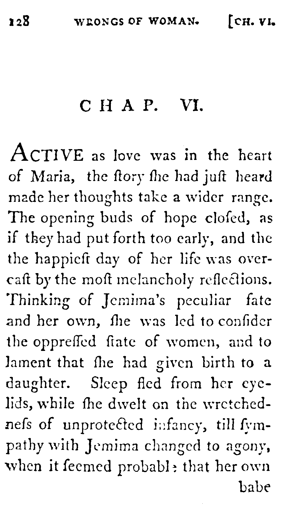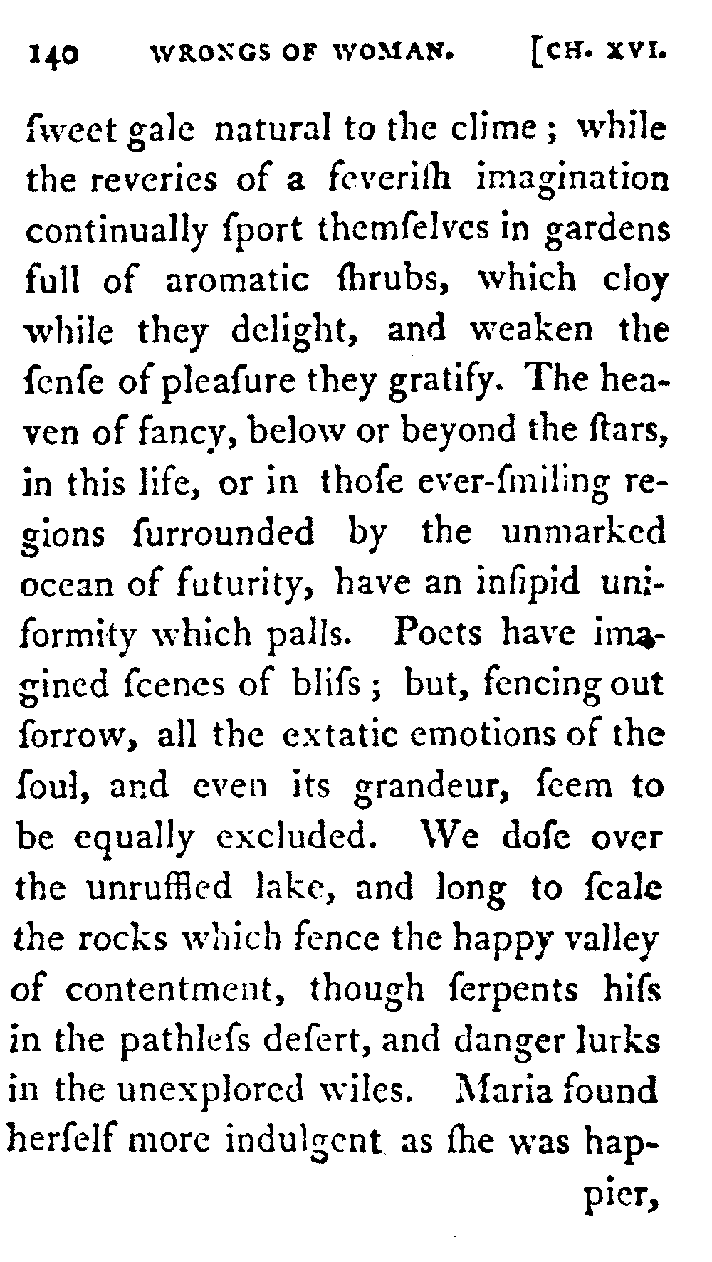The retreating shadows of former sorrows rushed back in a gloomy train, and seemed to be pictured on the walls of her prison, magnified by the state of mind in which they were viewed—Still she mourned for her child, lamented she was a daughter, and anticipated the aggravated ills of life that her sex rendered almost inevitable, even while dreading she was no more. To think[4] that she was blotted out of existence was agony, when the imagination had been long employed to expand her faculties; yet to suppose her turned adrift on an unknown sea, was scarcely less afflicting.