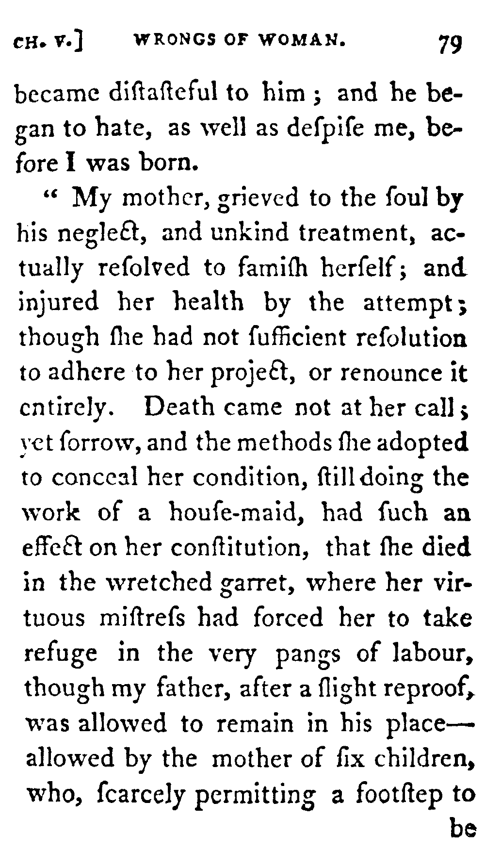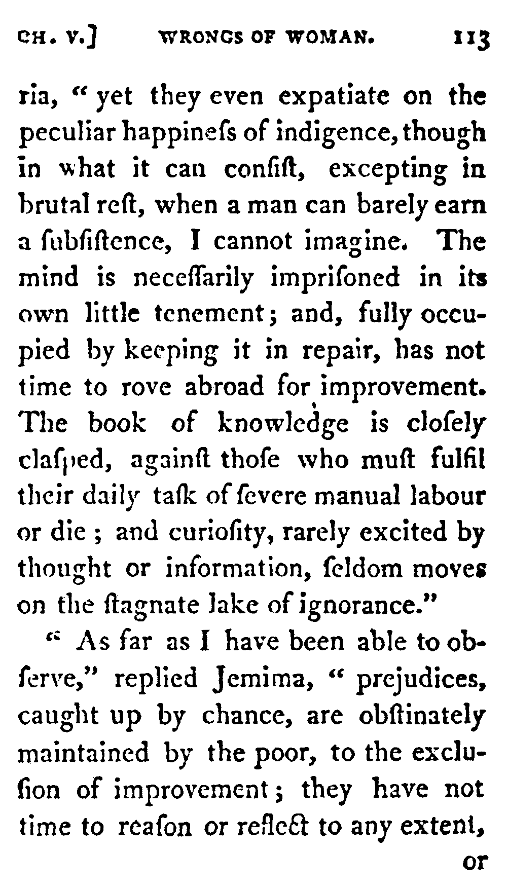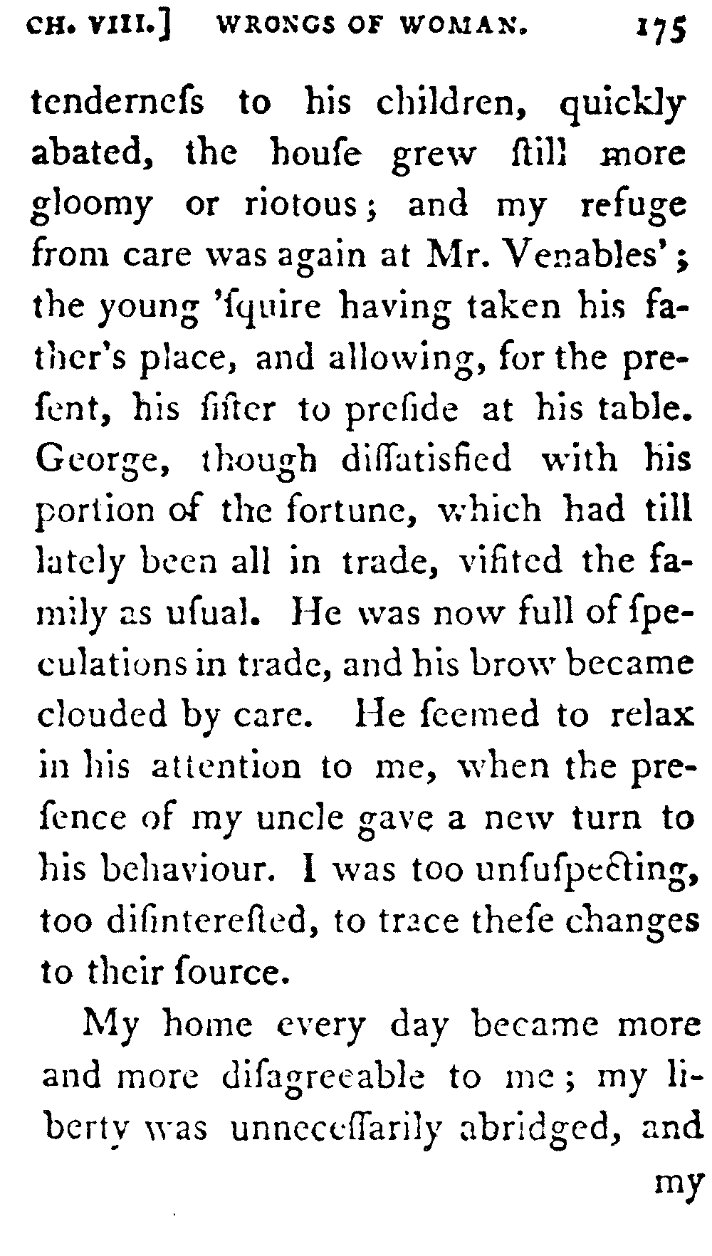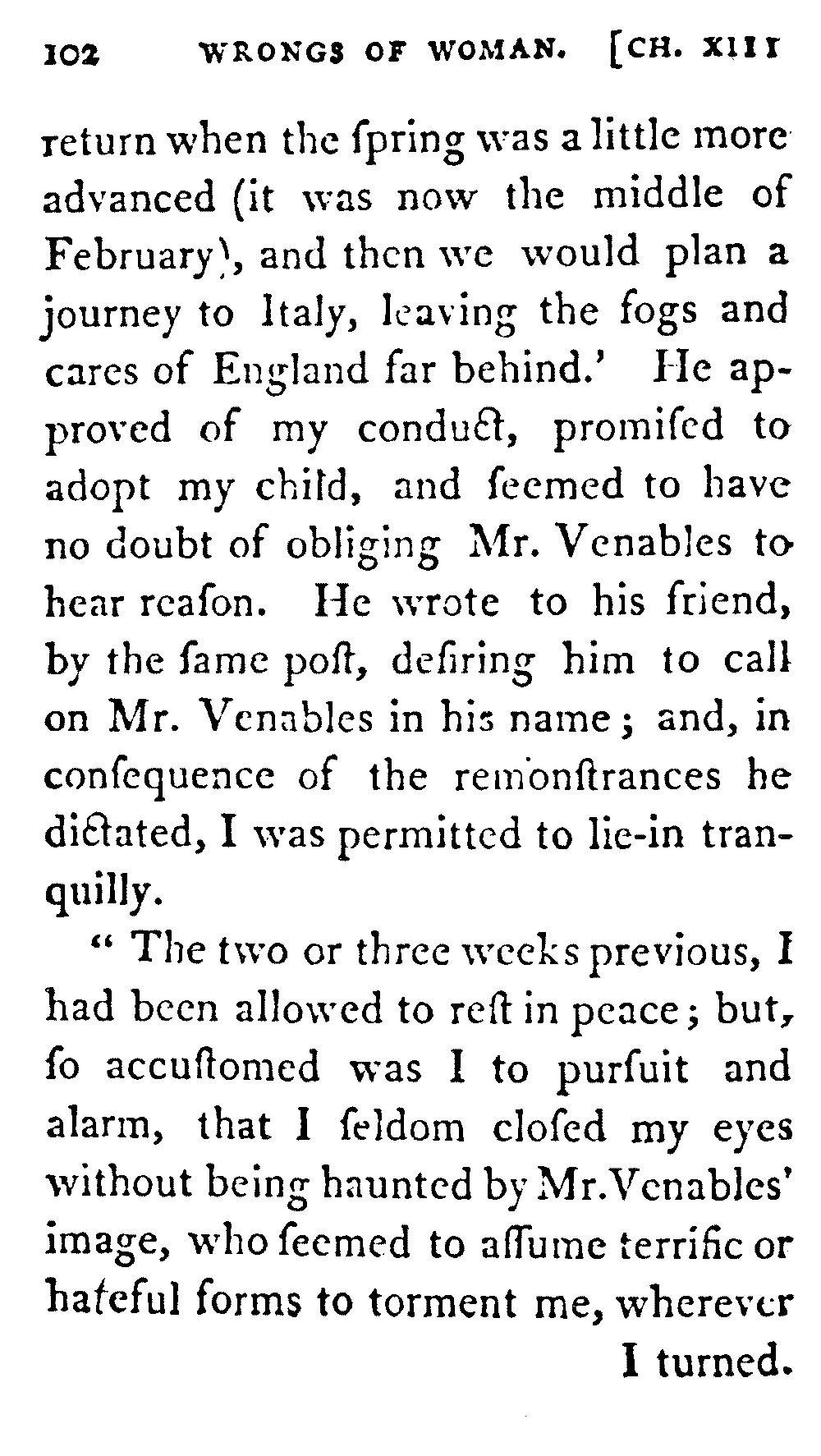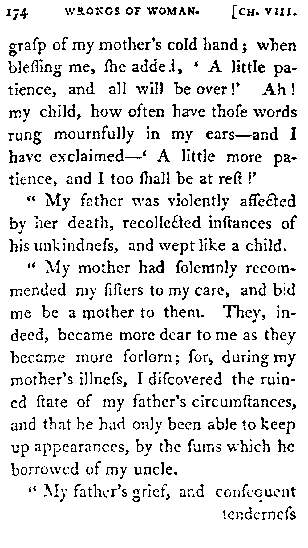 The retreating shadows of former sorrows rushed back in a gloomy train, and seemed to be pictured on the walls of her prison, magnified by the state of mind in which they were viewed—Still she mourned for her child, lamented she was a daughter, and anticipated the aggravated ills of life that her sex rendered almost inevitable, even while dreading she was no more. To think[4] that she was blotted out of existence was agony, when the imagination had been long employed to expand her faculties; yet to suppose her turned adrift on an unknown sea, was scarcely less afflicting.